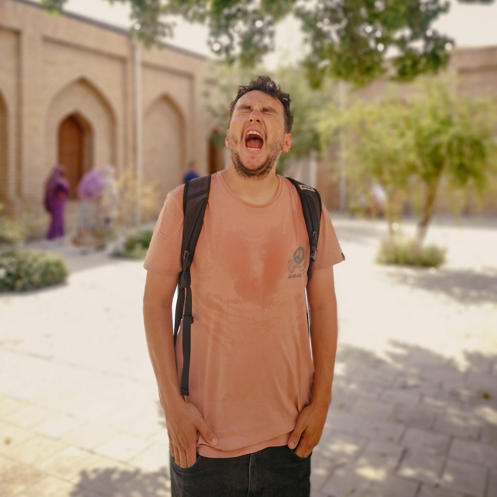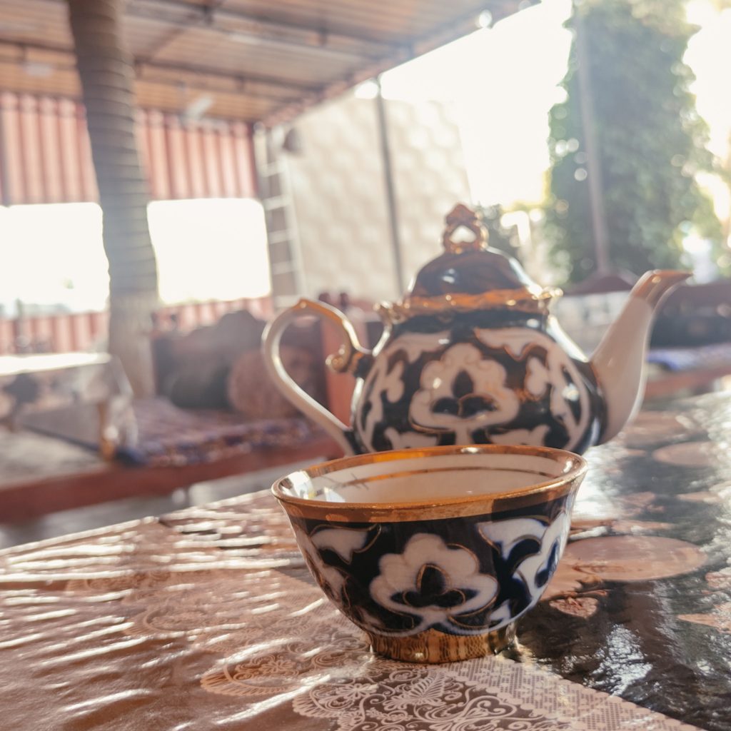 Wie es sich in heißen Ländern gehört, machen wir erstmal eine Pause und drehen erst am Nachmittag nochmal eine Runde an der „frischen“ Luft. Wir streifen über den Bazar. Hier scheinen sich auch die einzigen Menschen draußen herum zu treiben. Ansonsten sind die Straßen eher leer. Auf dem Rückweg machen wir einen Halt im Teehaus. Tee hat hier einen besonders hohen Stellenwert. Er schmeckt für uns wie immer, nur dass er hier aus kleinen Schalen getrunken wird und die Teekannen alle gleich aussehen. Schön finden wir allerdings die typischen Sitzgelegenheiten. Es sieht aus, als hätte man einen niedrigen Tisch auf ein, mit einem Teppich ausgelegten Bett aufgestellt. Man zieht seine Schuhe aus und macht es sich bequem. Diese „Betten“ sieht man übrigens an jeder Ecke.