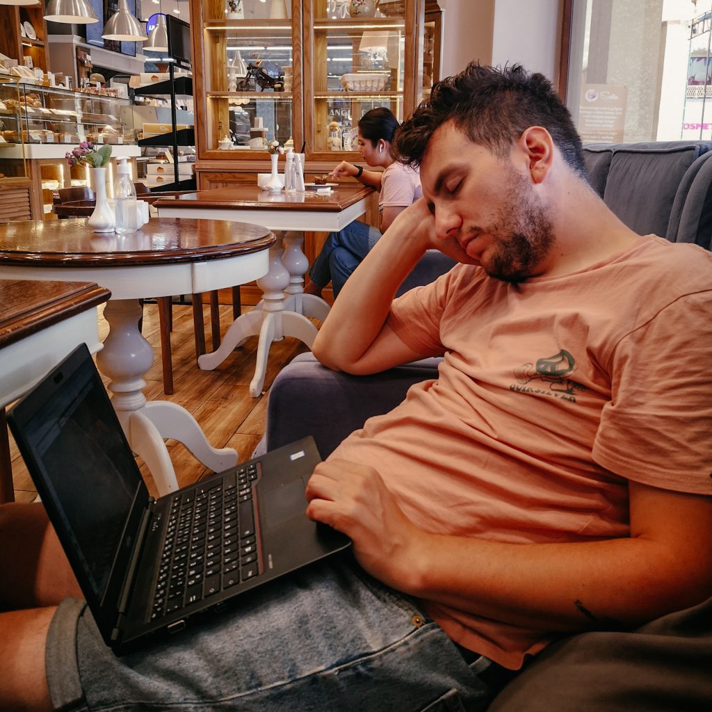 Direkt bei der Ankunft, man zahlt im Bus übrigens beim Aussteigen vorne beim Fahrer, steuern wir direkt den nächstgelegenen Simkarten-Laden an der Ecke an. Eine freundliche Mitarbeiterin, die heute Unterstützung von ihrer kleinen Tochter bei der Arbeit hat, hilft uns schnell weiter. Sie spricht sehr gutes Englisch und problemlos bekommen wir unsere Simkarte für Usbekistan. Danach steuern wir das nächste Kaffee an. Konsti ist offensichtlich (siehe Foto) immer noch müde und draußen ist es wahnsinnig heiß. So voll bepackt, wie wir sind, nutzen wir die Zeit bis zur Abfahrt des Zuges, um unsere Weiterreise in Usbekistan und Tadschikistan zu planen.