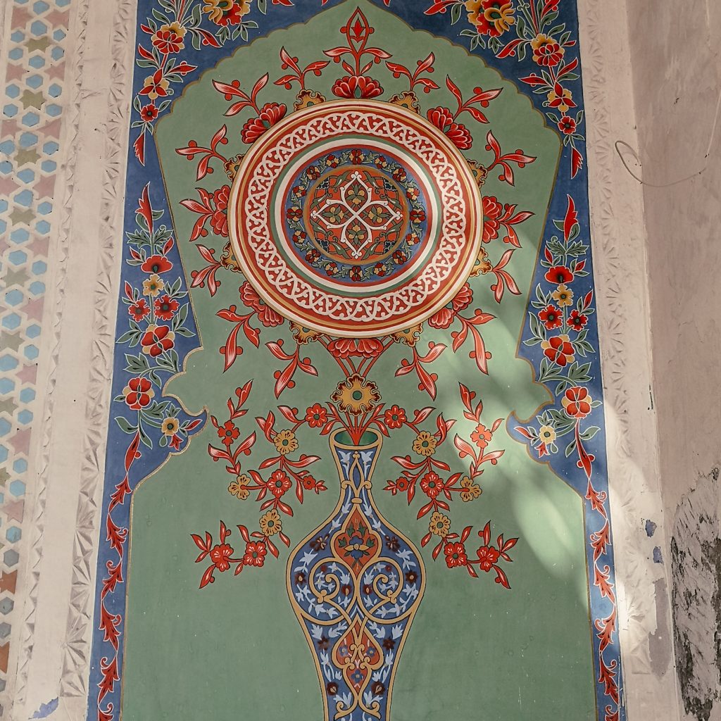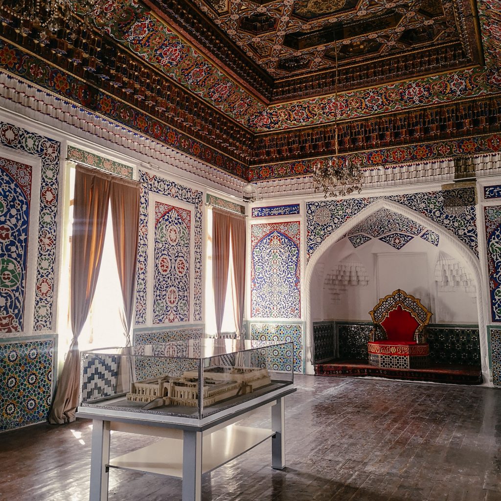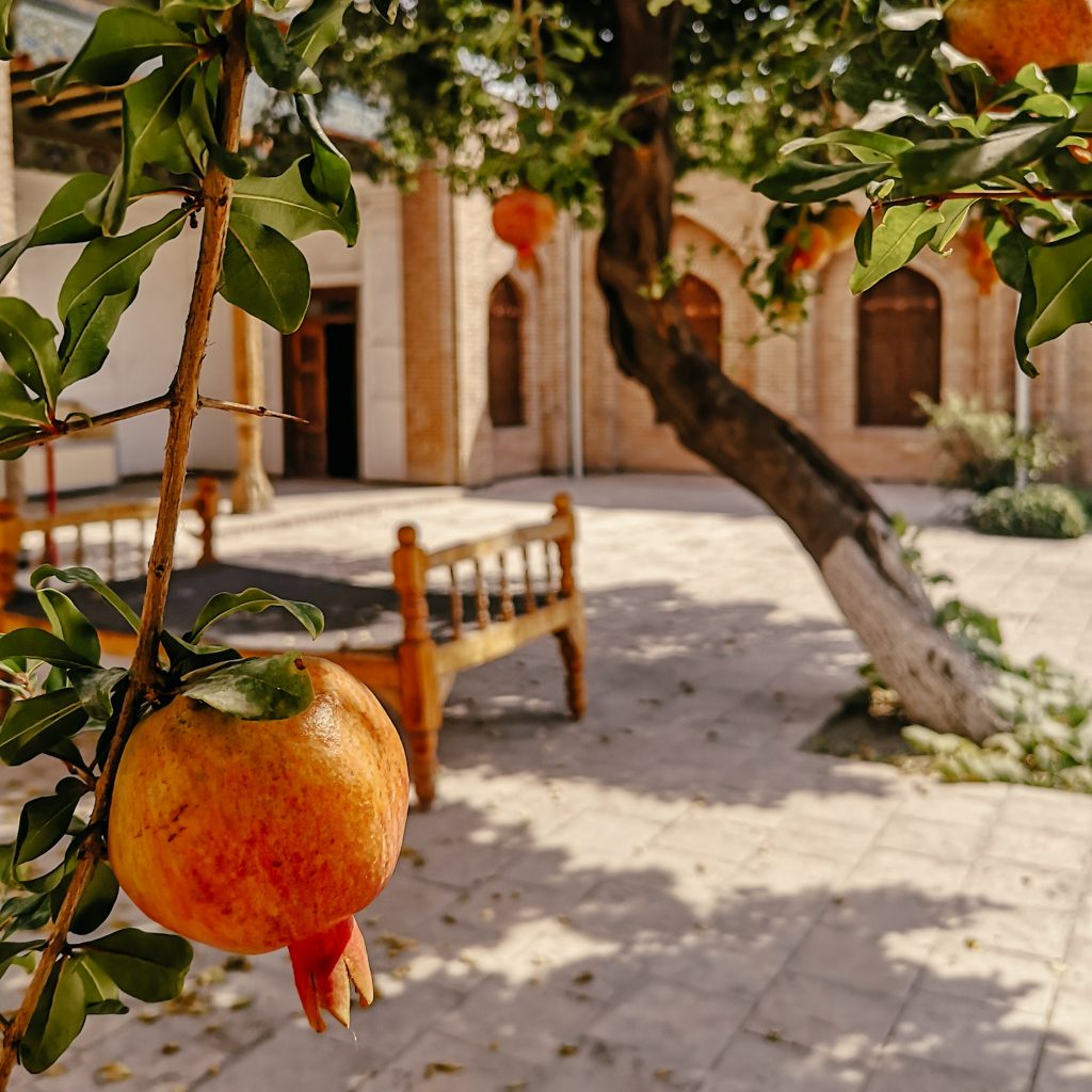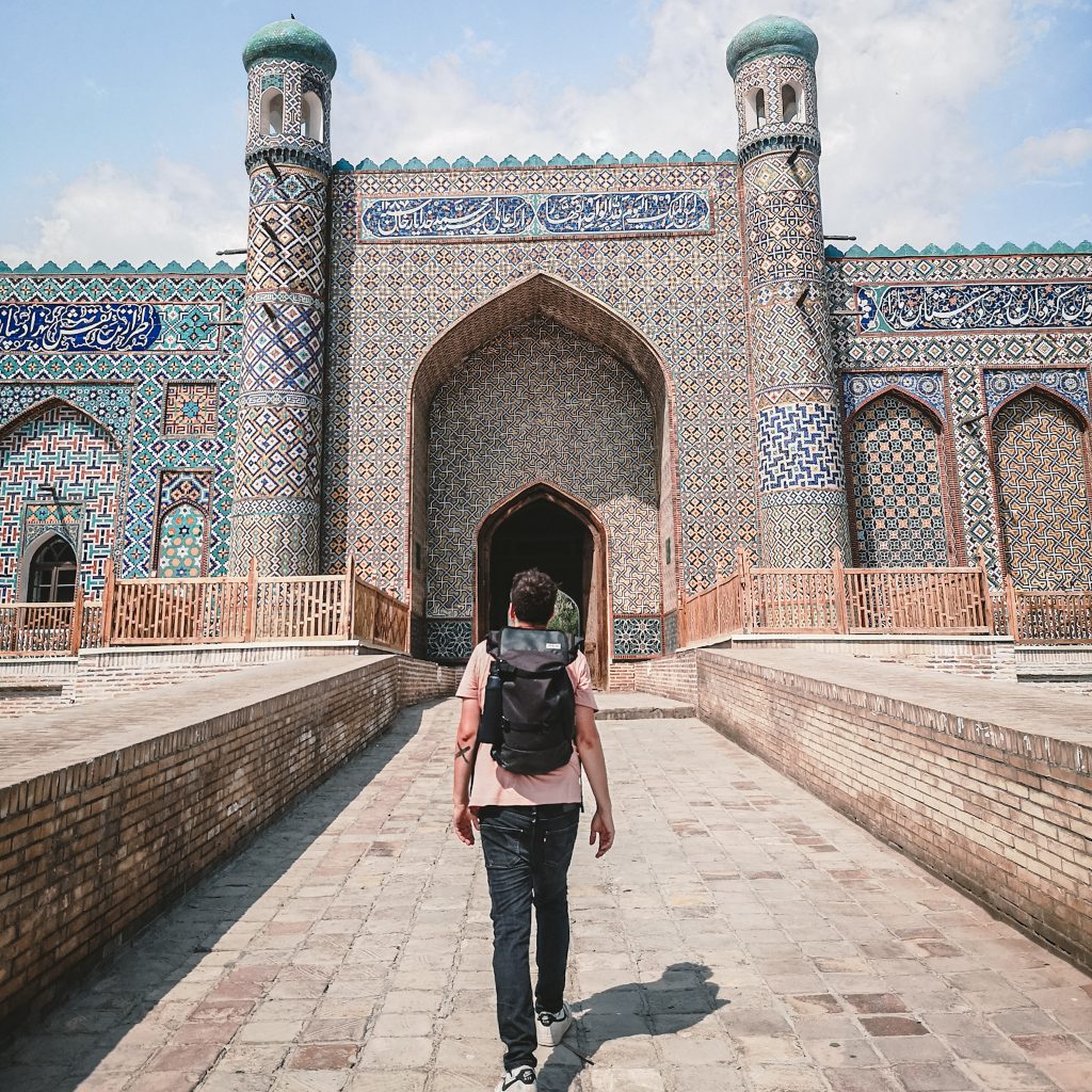 Der Xudayar Khan Palast wurde als Herrschersitz für Xudayar Khan errichtet. Der Bau wurde 1863 begonnen und 1873 vollendet. Er gehörte zu den letzten islamischen Großbauten in Usbekistan. Im Inneren hat der Palast 119 Räume und sieben Innenhöfe. Stuckverzierungen, Fliesenmosaike und bunt bemalte Holzdecken stehen für das Volkskunsthandwerk der Region. In einem Teil befindet sich ein Museum, welches wir uns anschauen. Besonders schön finden wir die Granatäpfelbäume in den Innenhöfen.