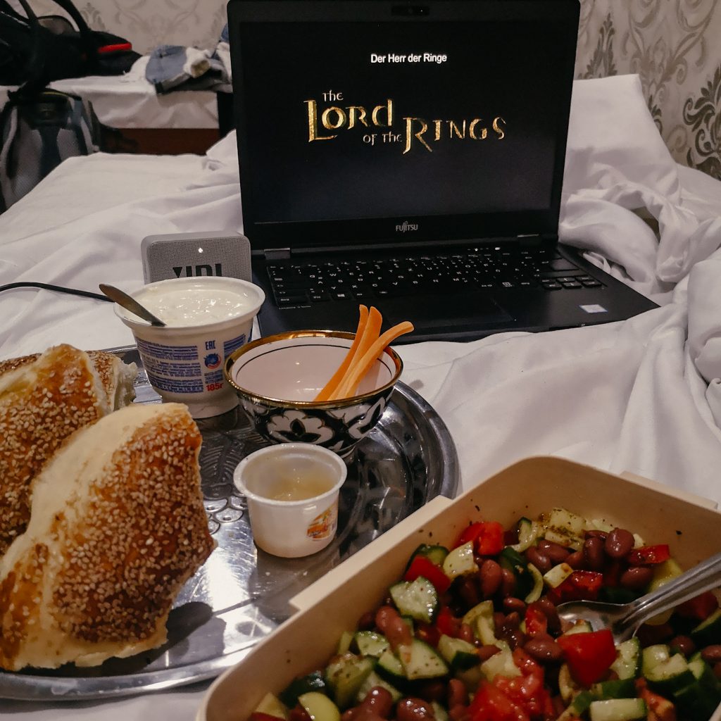 Vor der Tür steht der Rezeptionist. Er streckt Konsti das Telefon entgegen. Der Besitzer des Hostels möchte, dass wir zahlen. Sofort. Als Konsti nochmal erklärt, dass wir morgen früh direkt Geld holen, wird er ungemütlicher. Wo wir denn morgen an einem Sonntag Geld her bekommen wollen? Die Banken hätten ja geschlossen. Da wir aber wirklich nicht genug Geld haben, gibt Konsti etwas widerwillig seinen Reisepass als „Pfand“ ab. Da Caro zum Zeitpunkt des Klopfens weder Hose noch BH anhatte (das Wetter hatten wir ja bereits das ein oder andere Mal thematisiert), verfolgte sie das gesamte Gespräch nur hinter verschlossener Badezimmertür. Wir sind irritiert und zugegebenermaßen etwas verunsichert. In Andijon hatten wir ja auch kein Glück mit einem ATM. Können wir tatsächlich erst am Montag Geld abheben? Wir unterbrechen das Abendessen und googlen erstmal. Hm, was wir lesen, beruhigt uns nicht wirklich. Es wird empfohlen Bargeld mit ins Land zu bringen, da es wenig Geldautomaten gibt. Am besten Dollar oder Euro. Nicht jede Bank tauscht jede Währung. Wir haben noch knapp 20 Euro. Unser Notgroschen. Die Banken öffnen am Montag um 9 Uhr. Da wollen wir eigentlich schon weiter Richtung Chudschand. Aber gibt es wirklich keine ATMs, die funktionieren? Angezeigt werden uns tatsächlich nur wenige auf Maps. Wir wollen es direkt morgen früh versuchen. Erstmal dinieren wir in unserem kleinen Zimmerchen und schauen dabei Herr der Ringe Teil 1.