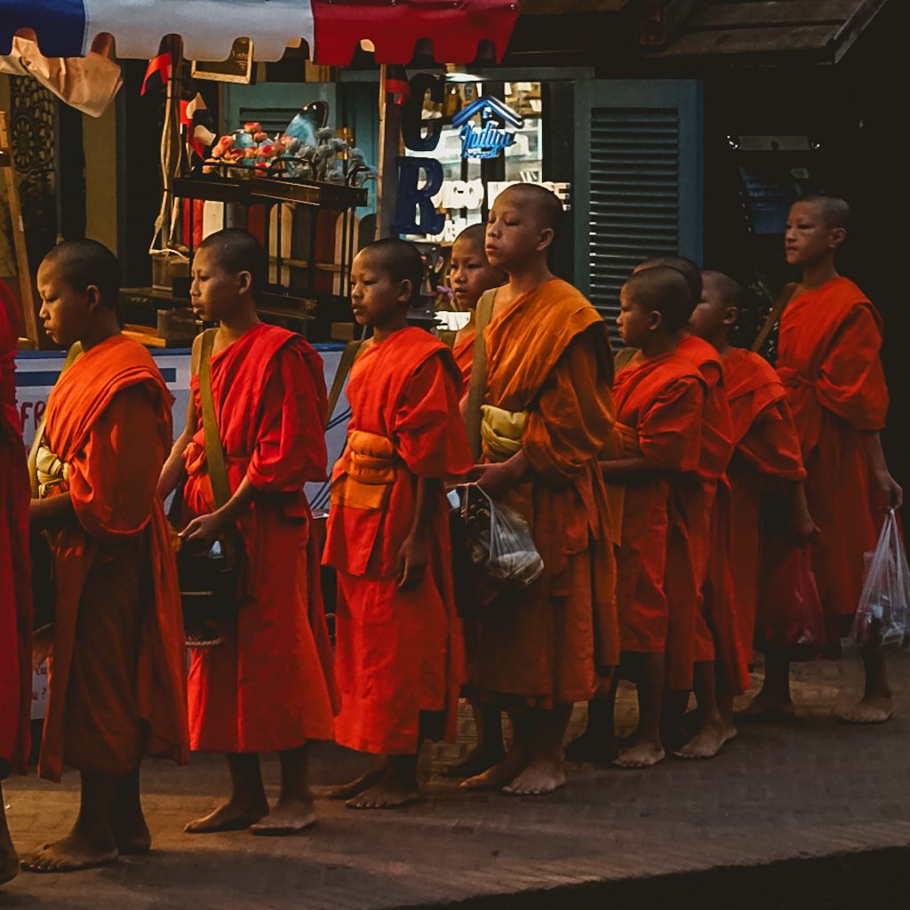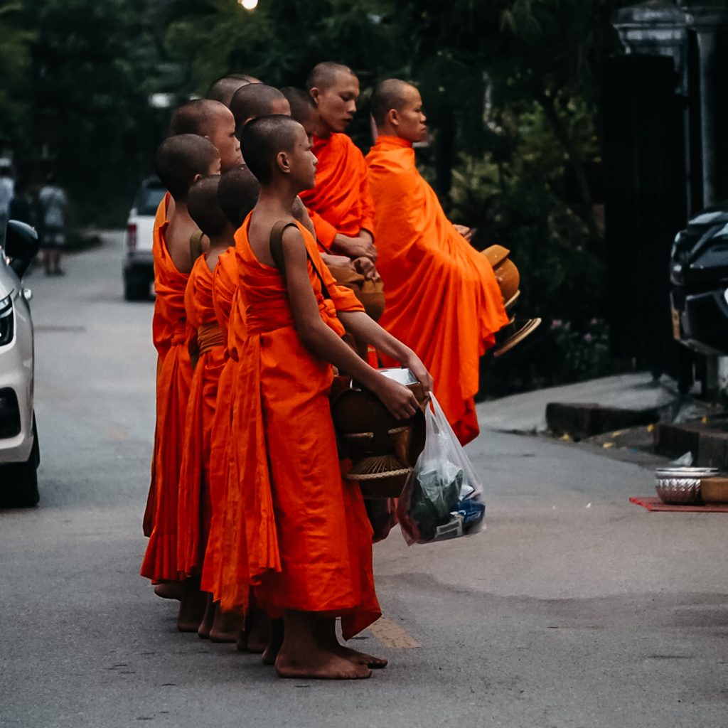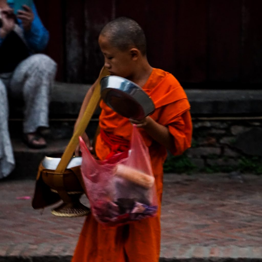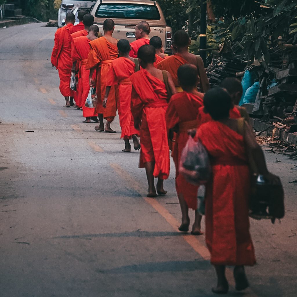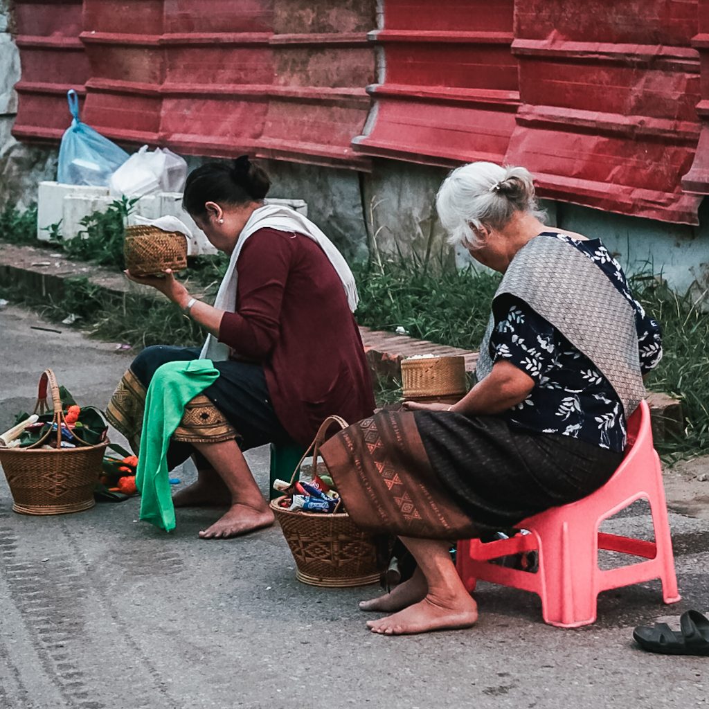Der Wecker klingelt um 4.30 Uhr. Aber wir sind nicht die einzigen, die um diese Zeit schon wach sind. Im Gegensatz zu uns, sind die Mönche hier jeden Tag so früh wach. Gegen 5:30 Uhr, noch vor Sonnenaufgang findet der Almosengang statt. Der Tak Bat ist ein jahrhundertealtes, buddhistisches Ritual, welches noch heute in Luang Prabang zu erleben ist. Grund dafür: Buddhistischen Mönchen ist das Arbeiten für eine Gegenleistung verboten. Daher sind die Mönche zum Überleben auf Almosen angewiesen, die sie jeden Morgen von gläubigen Buddhisten gespendet bekommen. Die Gläubigen erweisen den Mönchen damit ihren Respekt. Die im orange-farbenen Tüchern gekleidete Mönche ziehen mit Körben an den Spendern vorbei und sammeln Reis und andere Speisen ein. Immer wieder bleiben sie stehen um zu singen/beten. Inwieweit die Almosen heute noch überlebenswichtig sind, wissen wir tatsächlich nicht. Unser Eindruck nach dem Beiwohnen und dem Lesen mehrerer Artikel ist, dass sie auf jeden Fall viel gespendet bekommen und zum Teil schon direkt Sachen aussortieren. Was damit passiert, wissen wir ebenfalls nicht.