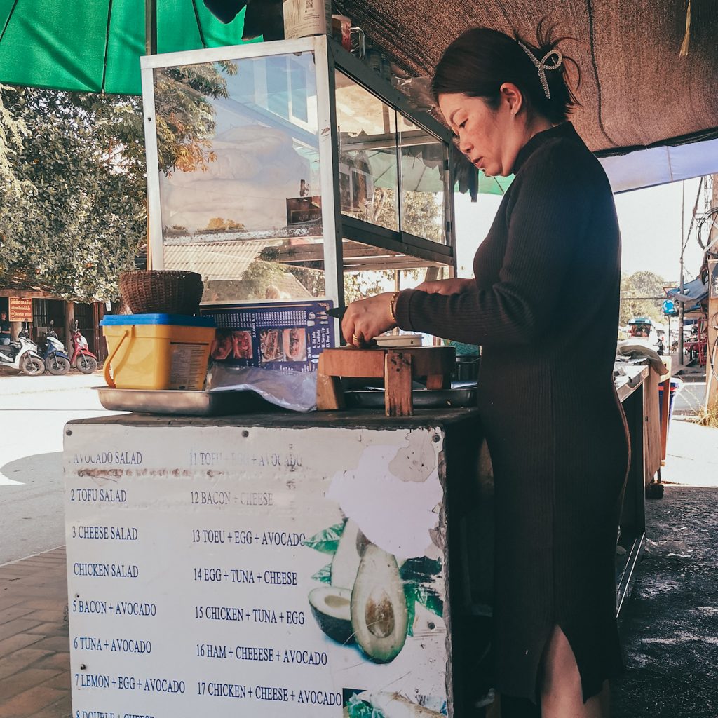 Zum Frühstück steuern wir ein Café an der Ecke an. Es gibt (wie noch so oft in den kommenden Tagen) Baguettes! Dazu einen Lao Kaffee. Hier wird der Lao Kaffee übrigens mit gezuckerter Kondensmilch getrunken. Wir haben Glück, dass sie separat serviert wird. Wir probieren natürlich trotzdem, wie es schmeckt. Natürlich zu süß für uns.