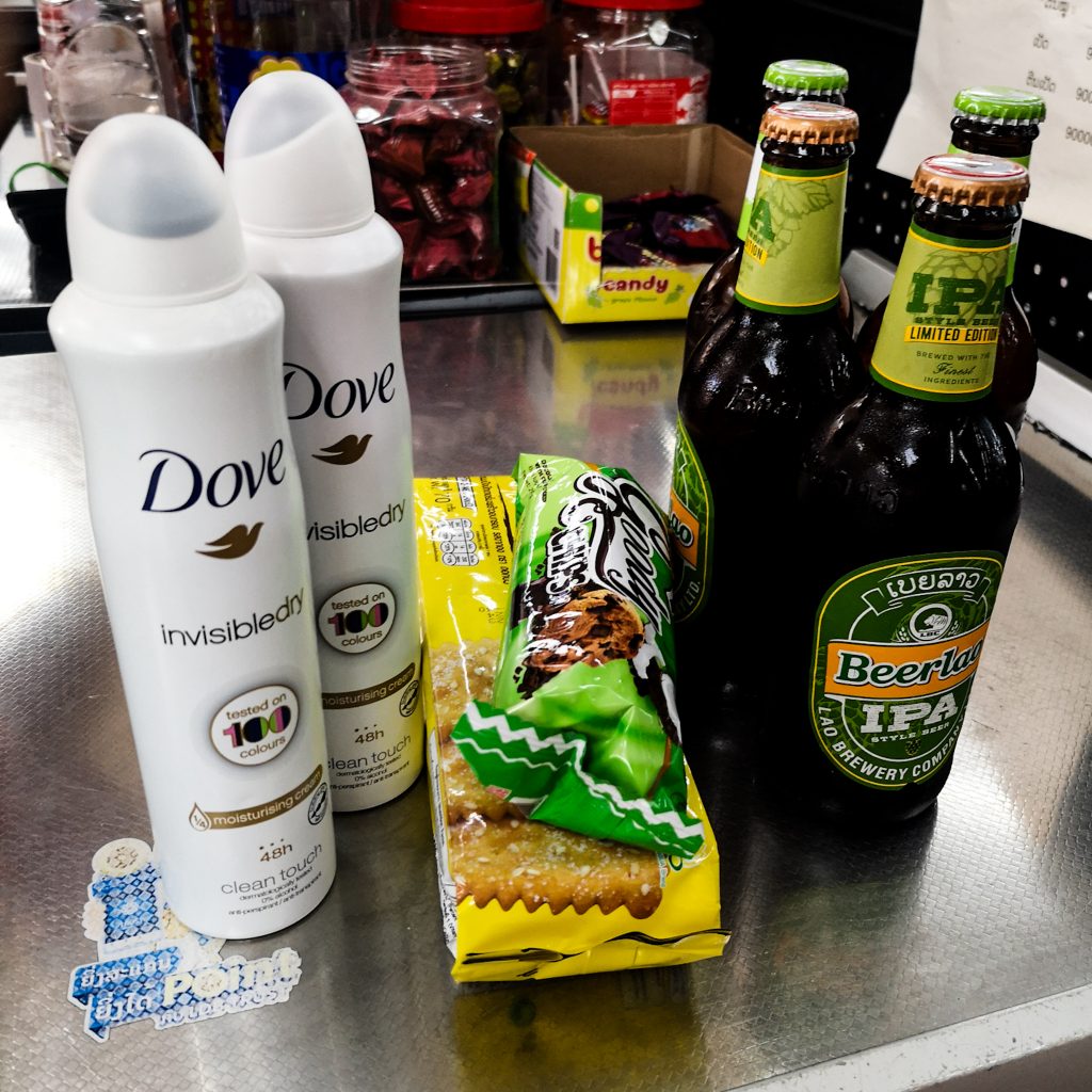 Auf dem Heimweg laufen wir zufällig an einem „Mini-Markt“ vorbei. Der ist allerdings alles andere als mini. Wir gehen auf eine kleine Supermarkt-Expedition, schließlich verfolgen wir auch immer das Ziel, lokale Produkte zu testen. Unsere Ausbeute: Luang Prabang Bier (in Beerlao Flaschen), Beerlao IPA Bier, zwei verschiedene Kekssorten uuuund Caros Lieblingsdeo. Ein kleines Laster, diese Sprühdeos sind eine Umweltsünde und halten nicht lange, aber dieses Deo ist einfach gut. Seit Islamabad haben wir in jedem Supermarkt danach gesucht und es nirgends gefunden. Und jetzt – tadaaa! Gibt es genau dieses Deo in Laos. Davon werden natürlich direkt zwei Sprühflaschen eingepackt, fast ein kleines Omen nachdem wir unser Deo ja beim Securitycheck am Bahnhof abgeben mussten. Die Freude ist auf jeden Fall groß. Nur Sonnencreme haben wir leider keine gefunden.