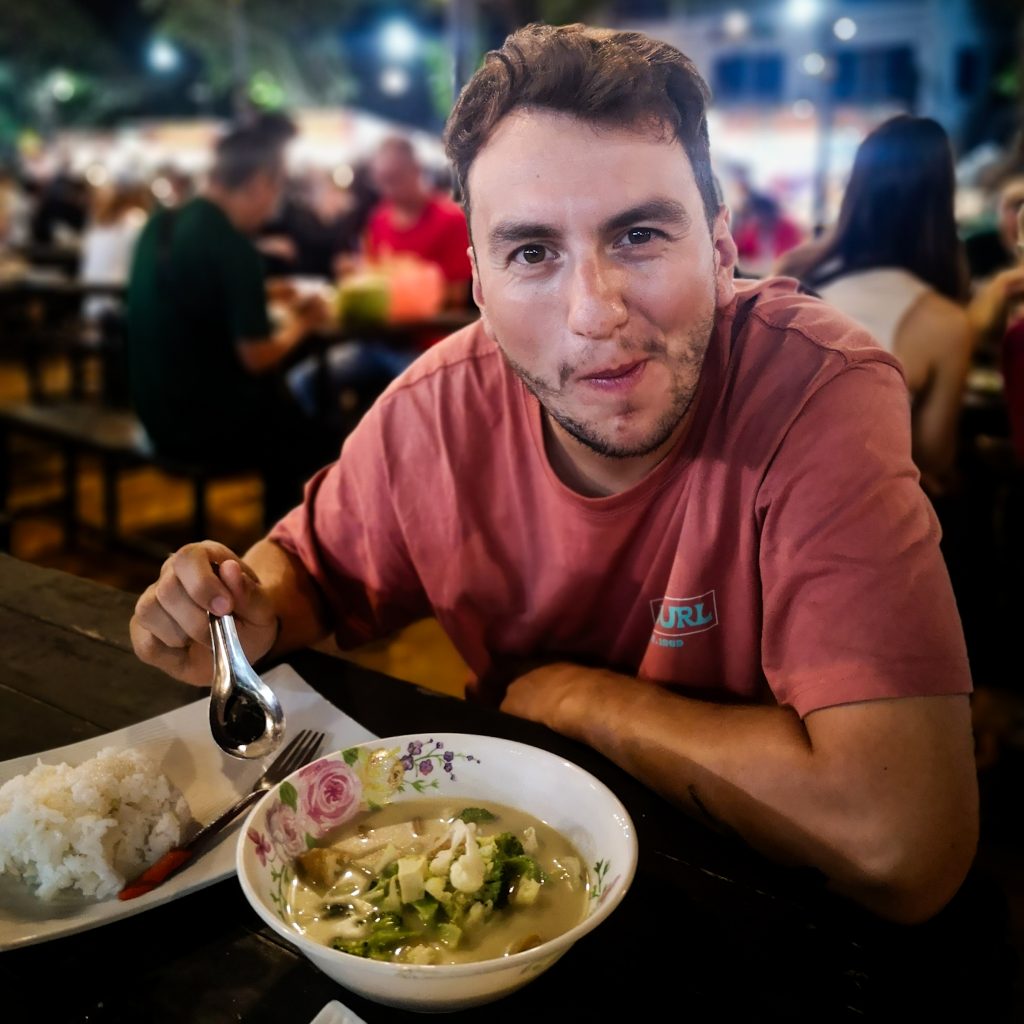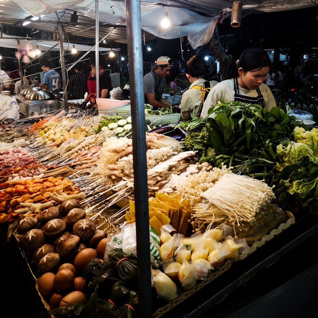 Nach einem Zwischenstopp in der Unterkunft, der Verköstigung unserer Einkäufe, gehen wir abends raus. Unser Ziel – der Nachtmarkt. Oder besser formuliert, kostengünstiges und vegetarisches Essen. Die Stände sind hier in einem großen Kreis angeordnet, es gibt sogar einheitliche Namensschilder für jeden Stand. In der Mitte des Platzes gibt es Tische mit Sitzbänken. Das ist ja fast schon ein bisschen zu geordnet und entspannt für einen Nachtmarkt. Wir schlendern einmal im Kreis und werden fündig. Wir entscheiden uns für ein Curry und Frühlingsrollen. Die Portionen sind nicht riesig, aber es schmeckt köstlich.