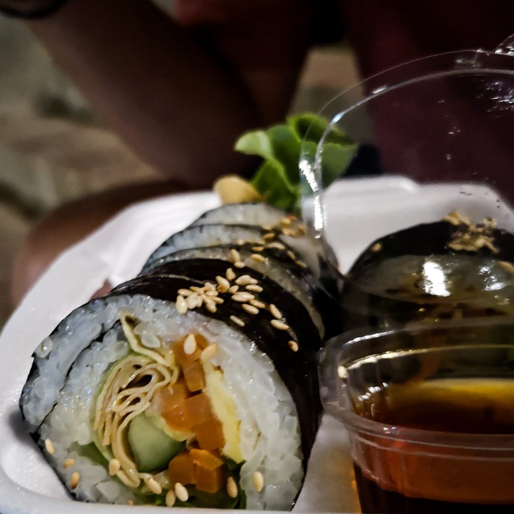 Wir haben noch etwas Platz und bleiben bei einem japanischen Stand hängen. Sind die Dumplings vegetarisch? Nope. Und das Gericht, dass wie eine Schupfnudelpfanne im Tomatensauce aussieht? Leider auch nicht. Dann aber die Sushirolle? Ja, die ist vegetarisch. Und ziemlich lecker. Wie wohl das Leben in Japan so sein wird? Auf diese Destination freuen wir uns auch besonders. Generell gibt es wie so oft hier viele Stände mit Spießen in sämtlichen Versionen. Hier gibt’s so einiges für Fleischliebhaber:innen.