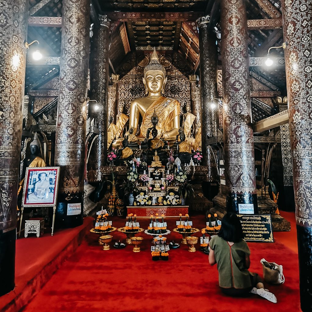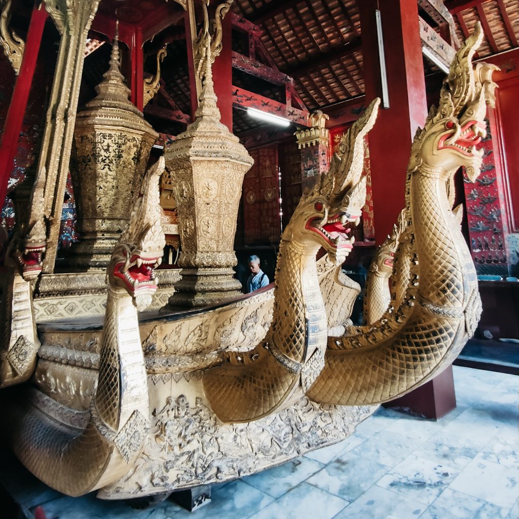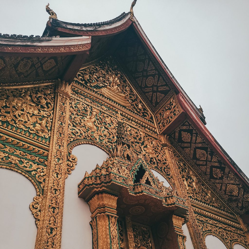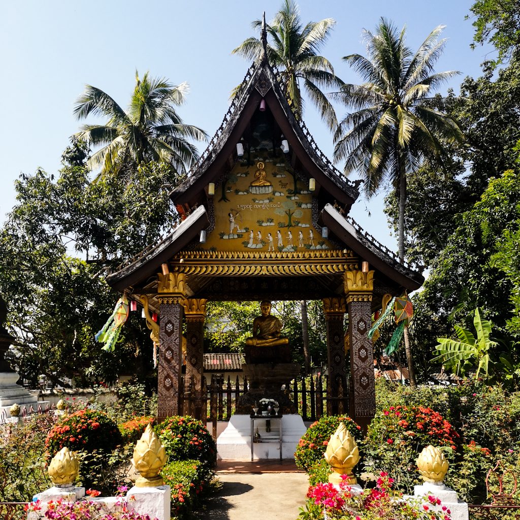 Der Tempel Wat Xieng Thong zählt zu den schönsten Tempeln im ganzen Land. Der Wat Xieng Thong wurde in einem typischen Baustil für Nordlaos erbaut, das Dach des Tempels reicht bis zum Boden. Auf dem Tempelgelände findet man zudem zahlreiche Schreine, Pavillons und Gärten sowie Unterkünfte für buddhistische Mönche. Luang Prabang besitzt übrigens die höchste Tempeldichte in ganz Laos. Ihr findet in der ehemaligen Königsstadt über 300 bunte, verzierte Tempel. Wir schauen uns die vielen Pavillons an. Wahnsinn, mit wie viel Liebe zum Detail und Prunk die Tempel hier gestaltet sind. Neben Touris kommen aber auch gläubige Laot:innen zum Beten im die Tempel und auch die Mönche sehen wir immer wieder in ihren orangefarbenen Gewändern umherlaufen.