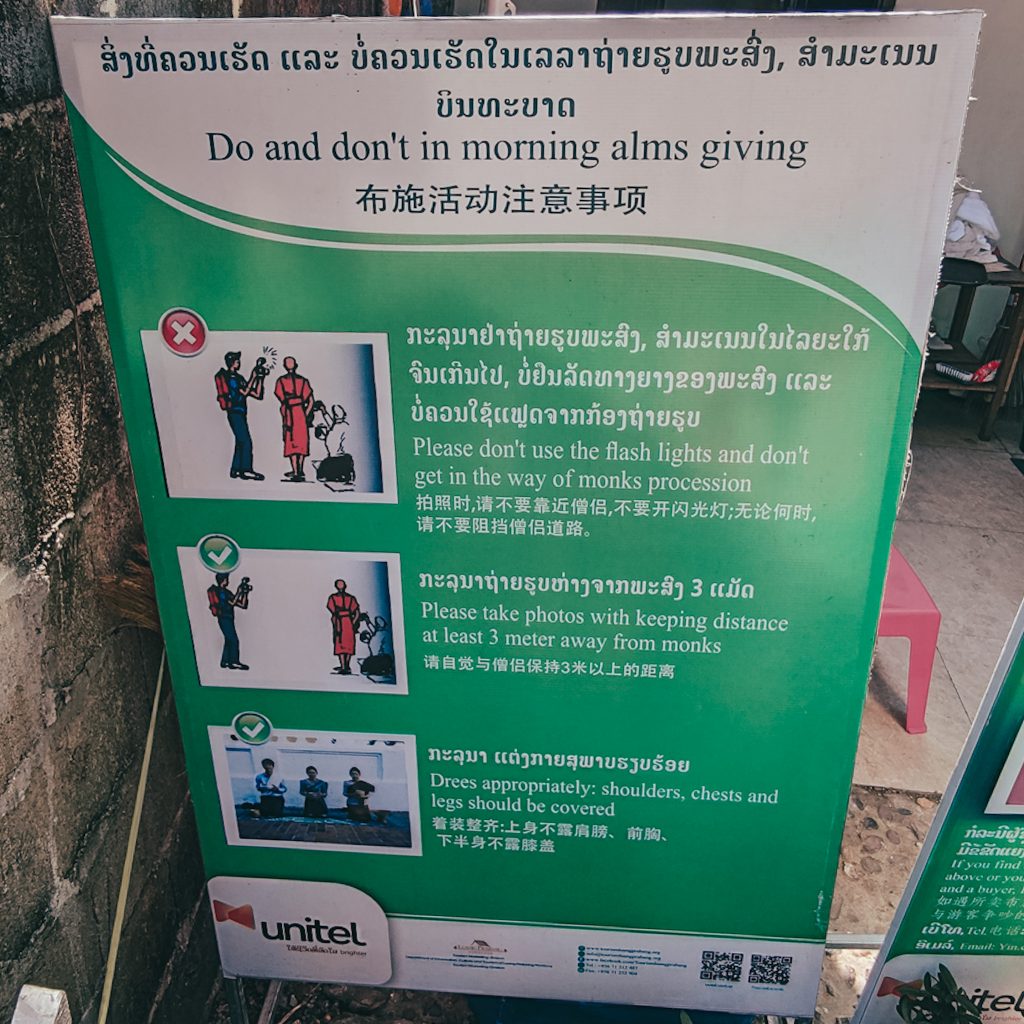 Was wir allerdings wissen, ist, dass dieses Ritual mittlerweile insbesondere in Luang Prabang eine ziemliche Touri-Show geworden ist und man sich deshalb gut überlegen sollte, daran teilzunehmen. Es gibt sogar mittlerweile richtige Benimmschilder mit Regeln: