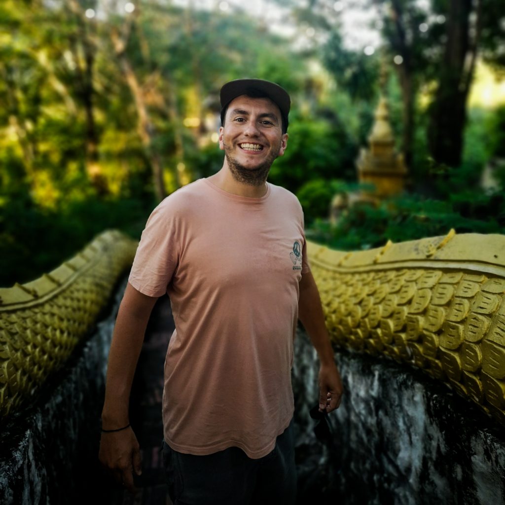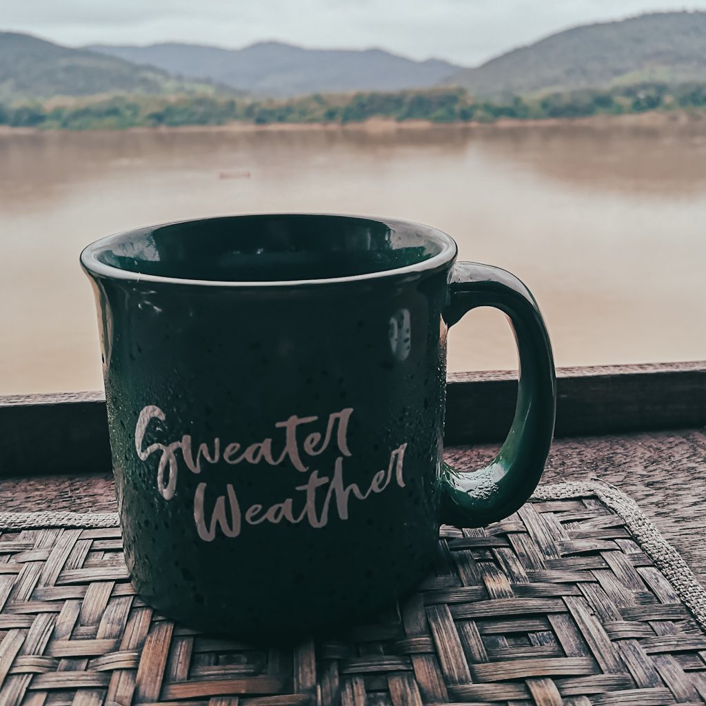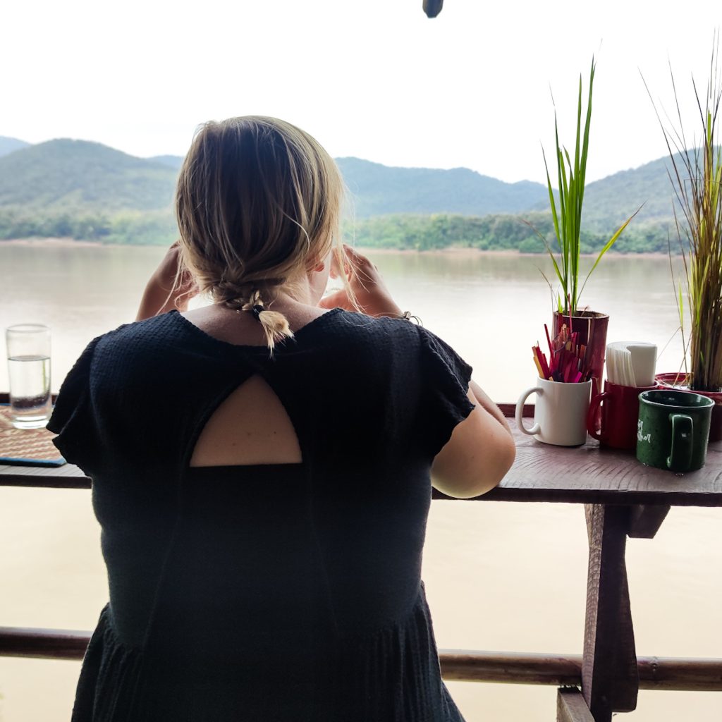 Konsti macht noch ein Foto von Caro mit dem Bären für ihre Mama. Im Anschluss geht es für uns zurück Richtung Ausgang, wo wir mit dem Golfcaddy wieder zum Eingang gebracht werden. Es ist schon kurz nach 10, für uns Zeit für.. ihr wisst es schon.. einen Kaffee. Wir fahren mit dem Roller ein Stück zurück entlang des Mekongs und halten dort in einem kleinen, süßen Café mit direktem Blick auf den Mekong. Caro ist direkt verliebt in die dunkelgrünen „Sweater Weather“ Tassen. Genau das vermissen wir gerade, sich bei schlechtem Wetter und kühlen Temperaturen in Jogginghose und Pulli auf die Couch zu kuscheln. Klingt komisch, ist aber so 😅 Wir genießen den Kaffee mit dem schönen Ausblick und fahren danach weiter. Ab zum nächsten Wasserfall!
