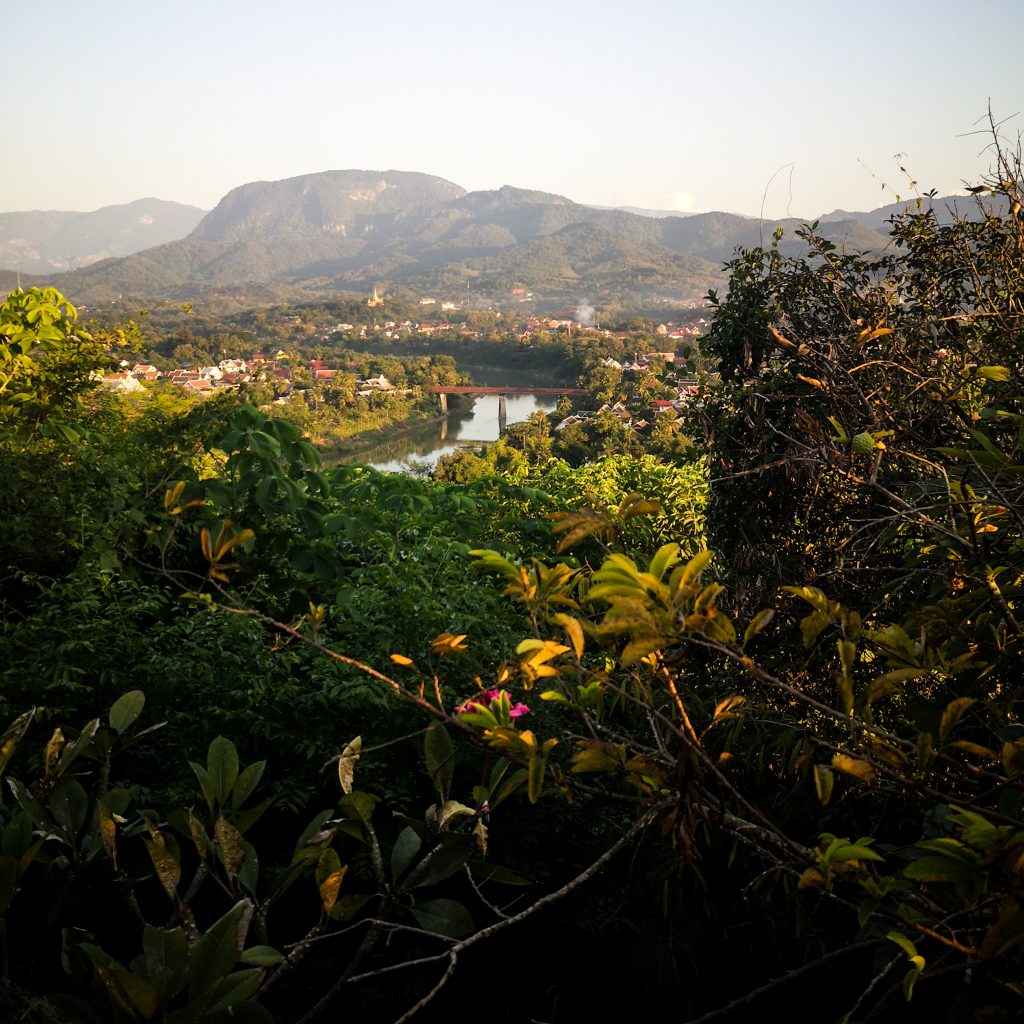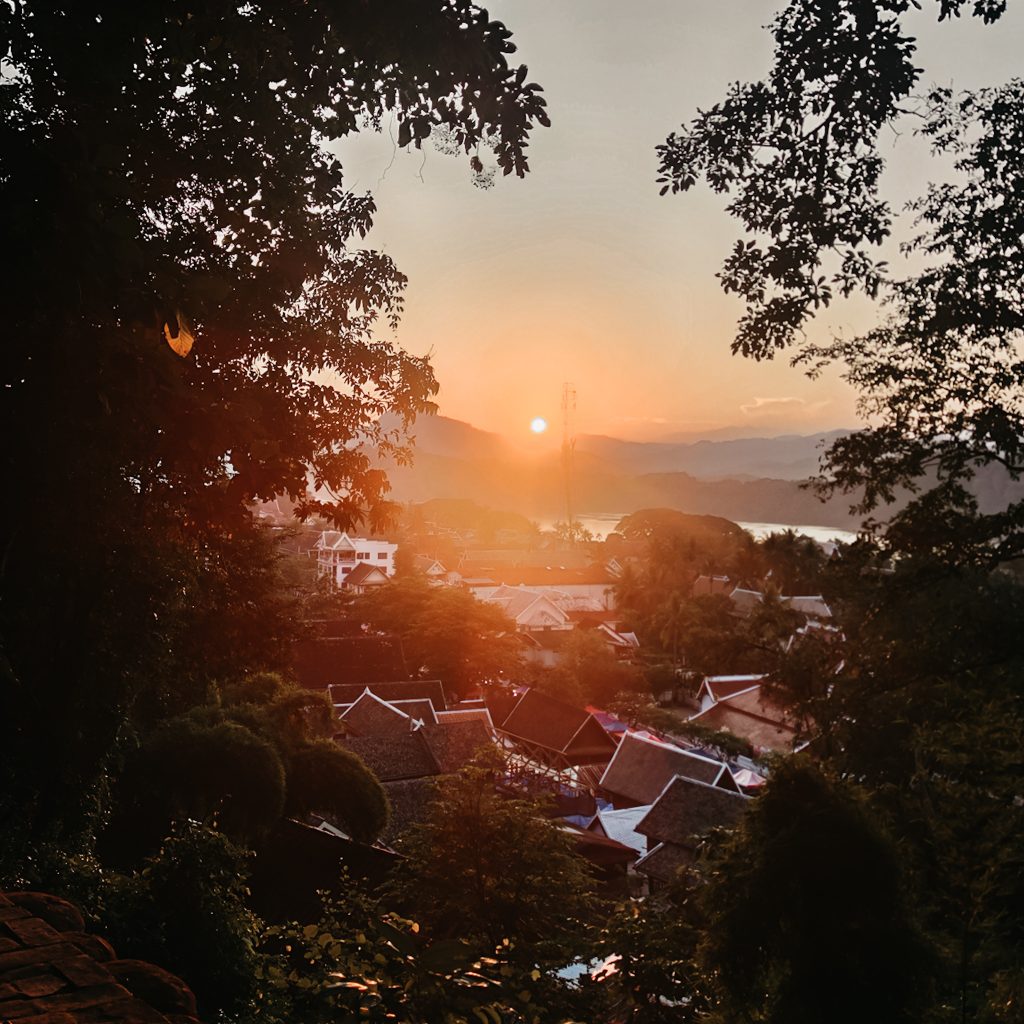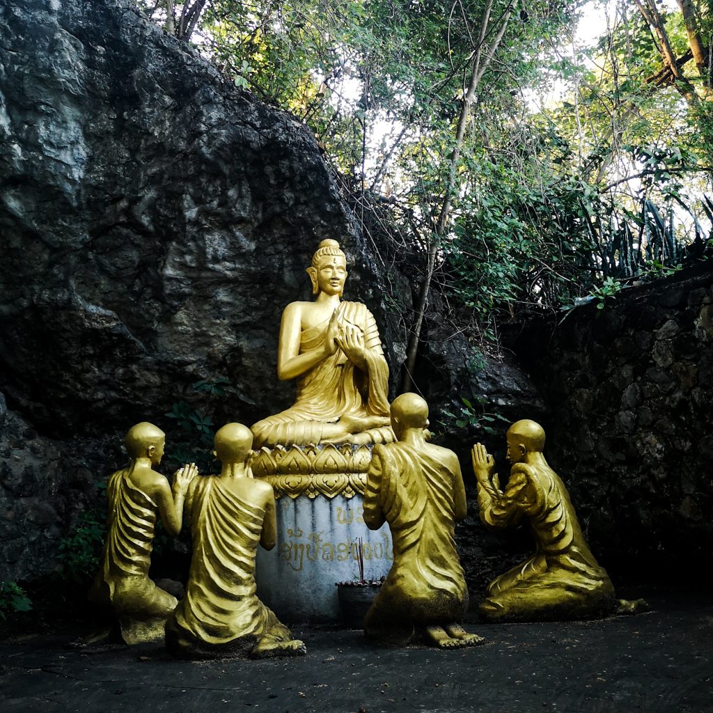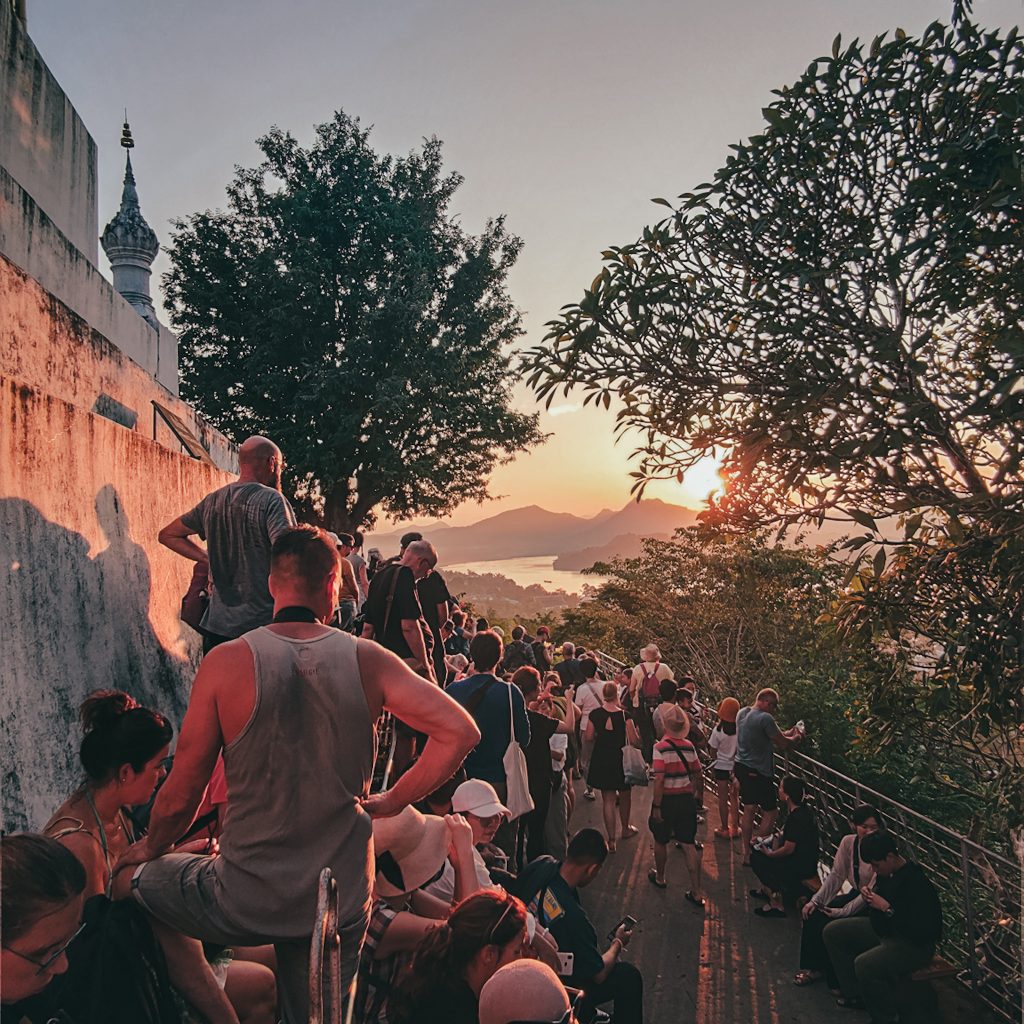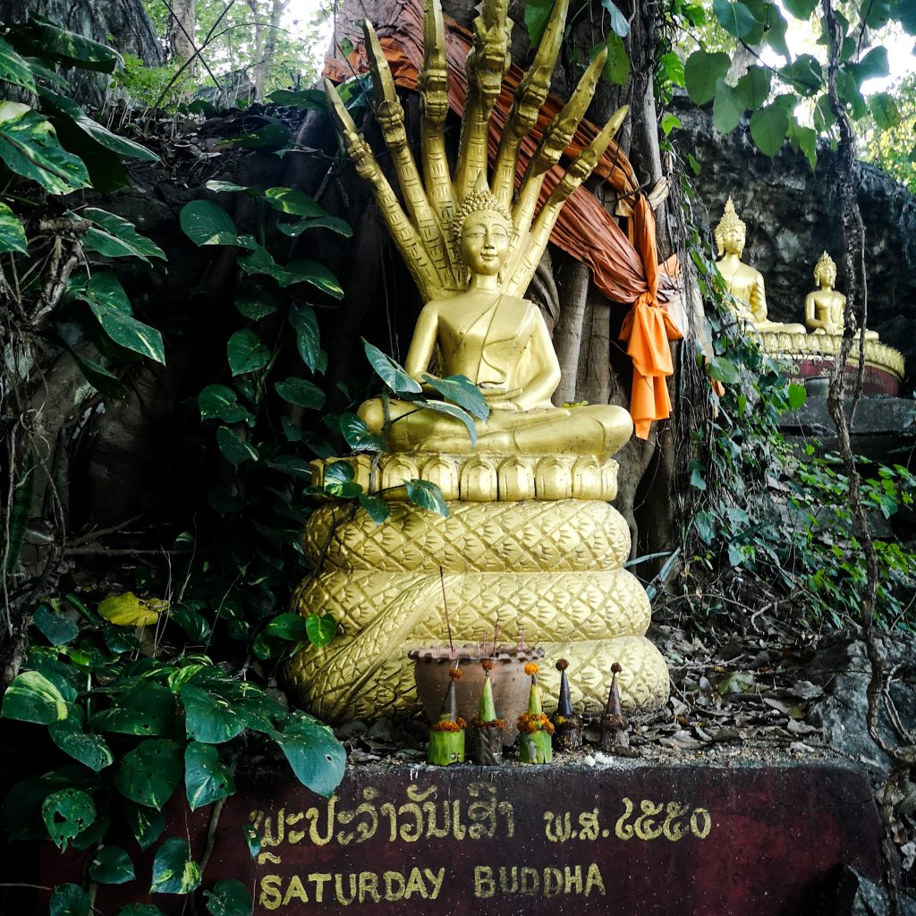 Gegen späten Nachmittag machen wir uns auf den Weg zum Mount Phousi, dem Stadtberg von Luang Prabang. Zu Fuß geht man ungefähr eine halbe Stunde bis nach oben und das wird eine schwitzige Angelegenheit. Der Weg ist sehr schön, wir starten auf einem Tempelgelände und schnell wird es um uns herum grün. Wir müssen einmal Eintritt bezahlen, denn am Gipfel gibt es ebenfalls eine Tempelanlage. Es gibt verschiedene Buddha-Figuren für jeden Wochentag, die zwischen den Felsen sitzen und uns belustigt beim Aufstieg beobachten zu scheinen. Dann kommen wir oben an.