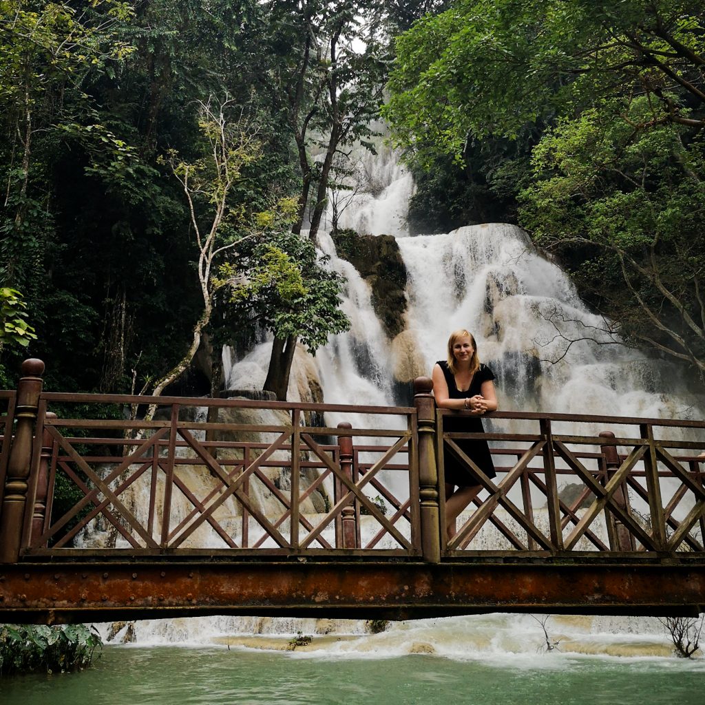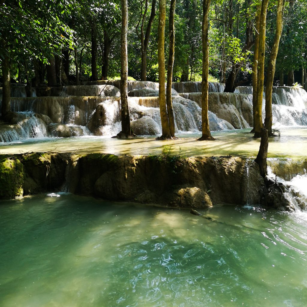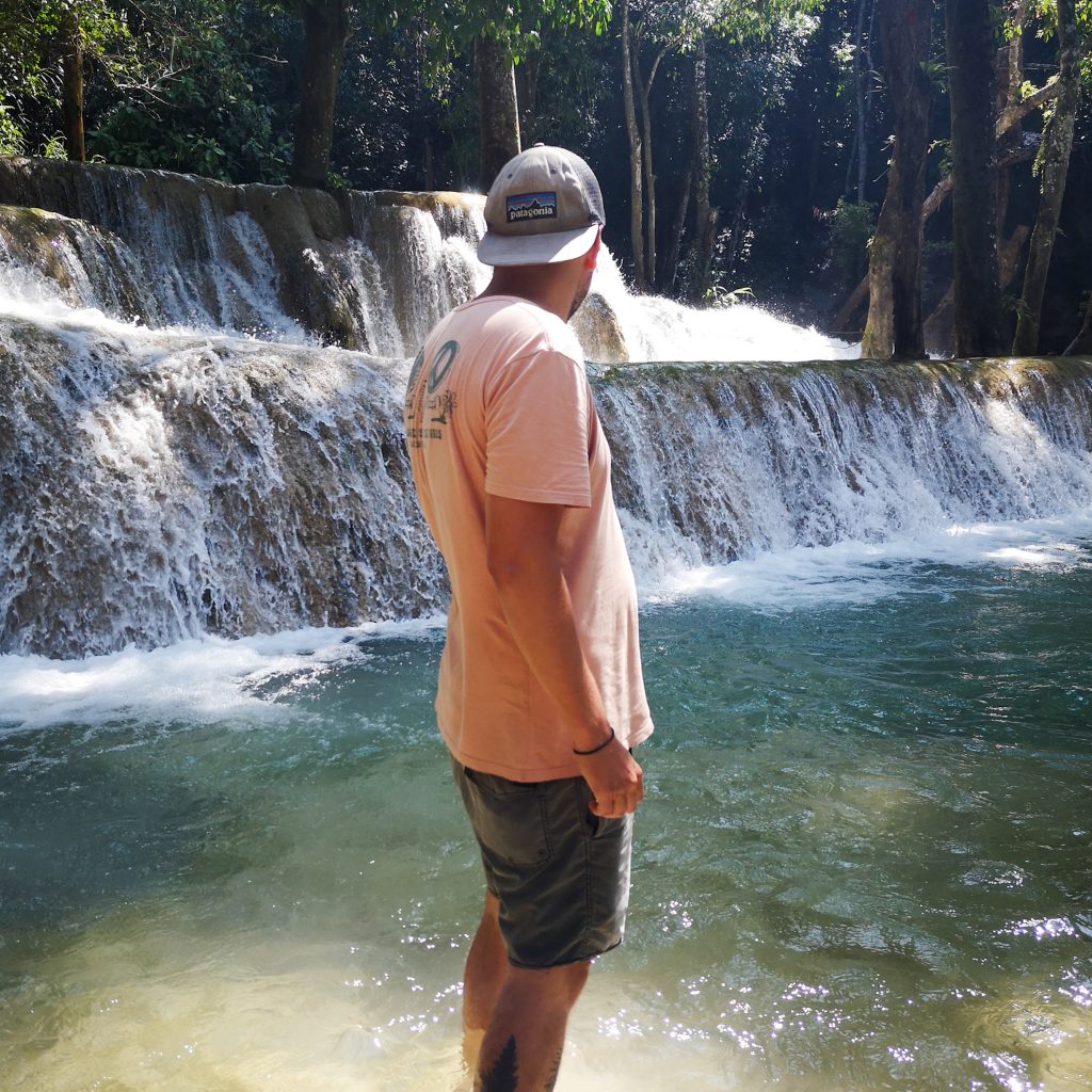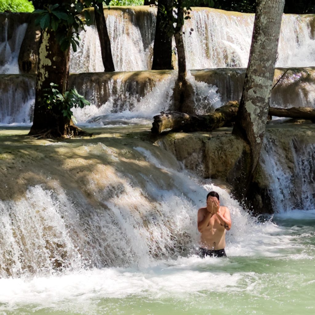 Wir fahren wieder zurück Richtung Luang Prabang und biegen kurz vor der Stadt ab und fahren noch eine halbe Stunde in Richtung Osten weiter. Am Parkplatz angekommen, müssen wir in ein Boot umsteigen, um zum Wasserfall zu kommen. Vom dort geht es noch ein kleines Stück hoch. Da ist er schon und direkt daneben jede Menge Cafés und Restaurants. Es gibt zwei Brücken und der Wasserfall besteht wieder aus mehreren Kaskaden. Bei der zweiten Brücke tummeln sich die Touris am und im Wasser und es findet das ein oder andere Fotoshooting statt. Wir gehen etwas weiter entlang des Wassers und es wird ruhiger. Dafür ist es aber auch gleich vorbei mit unserer Erkundungstour. Die Brücke zum nächsten Wasserfall ist leider ab der Hälfte abgebrochen. Hier geht kein Weg weiter. Wir drehen also um und schauen uns den unteren Teil nochmal in Ruhe an. Konsti springt einmal zur Abkühlung ins kalte Nass.
