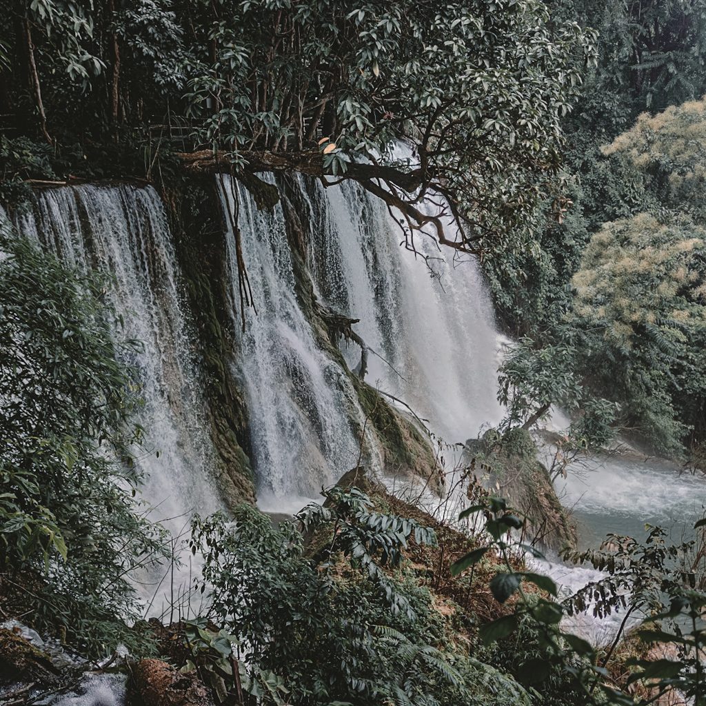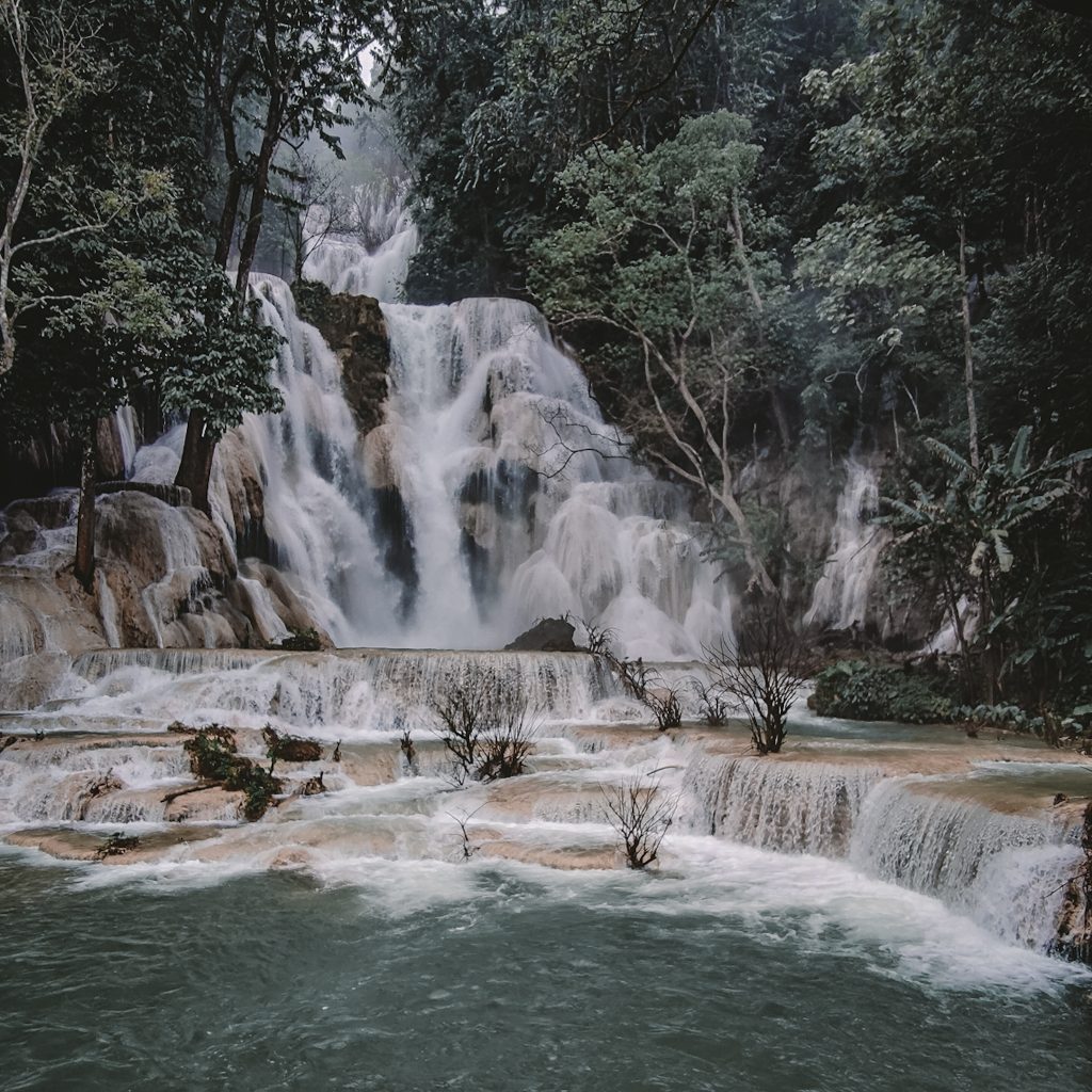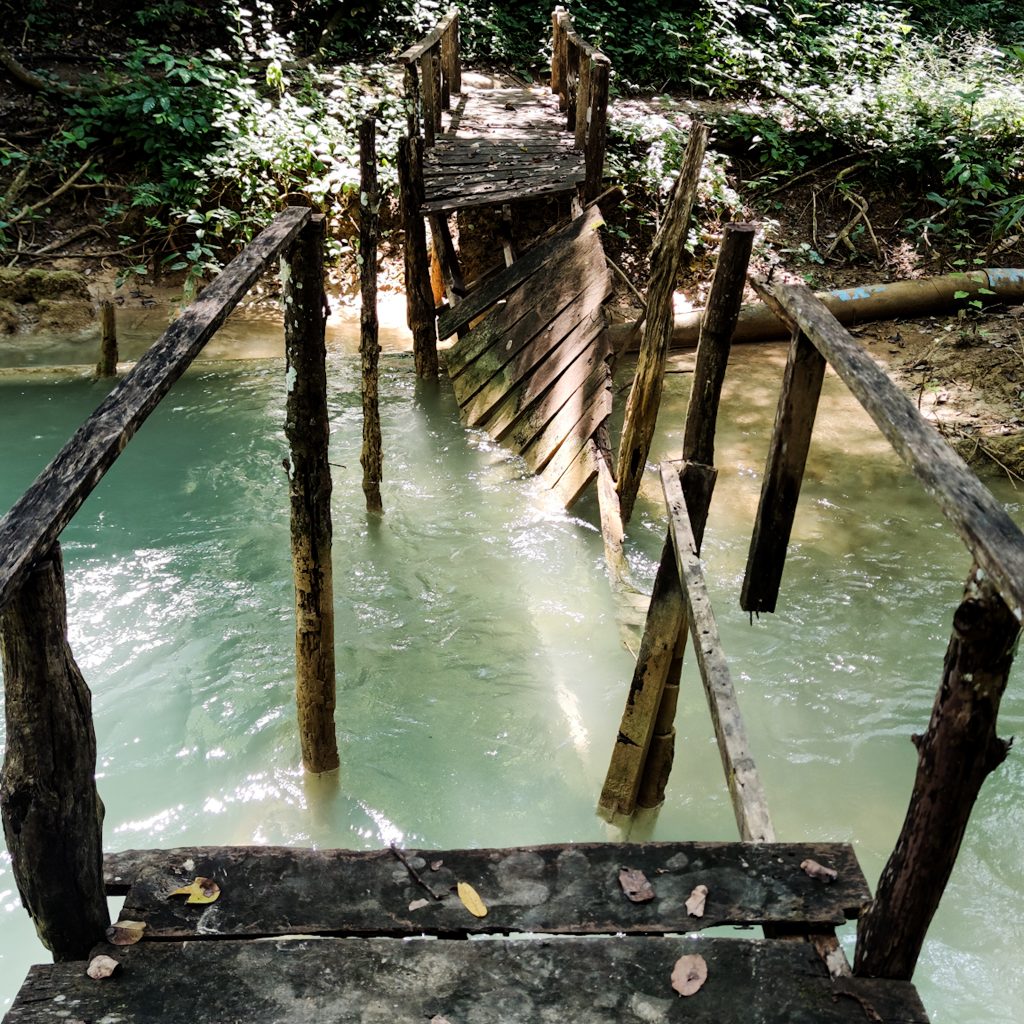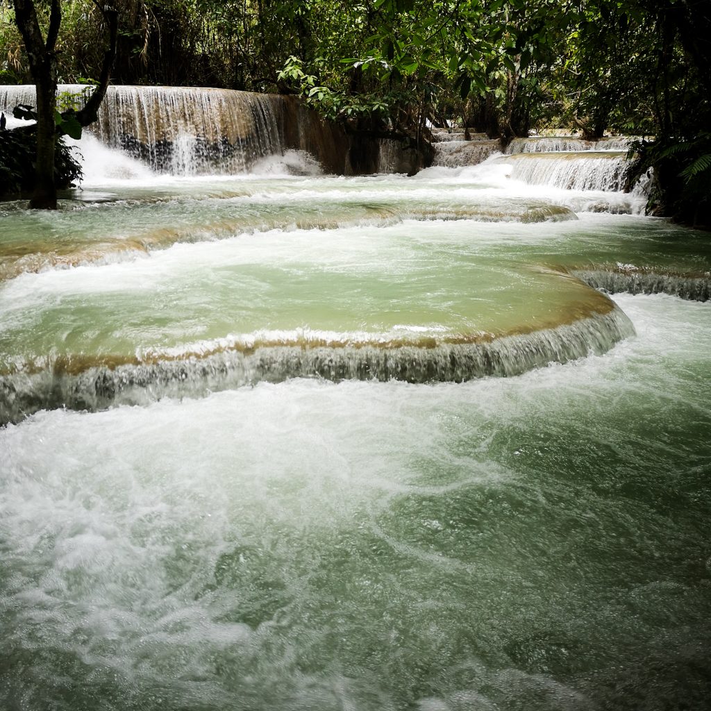 Wir fahren wieder zurück Richtung Luang Prabang und biegen kurz vor der Stadt ab und fahren noch eine halbe Stunde in Richtung Osten weiter. Am Parkplatz angekommen, müssen wir in ein Boot umsteigen, um zum Wasserfall zu kommen. Vom dort geht es noch ein kleines Stück hoch. Da ist er schon und direkt daneben jede Menge Cafés und Restaurants. Es gibt zwei Brücken und der Wasserfall besteht wieder aus mehreren Kaskaden. Bei der zweiten Brücke tummeln sich die Touris am und im Wasser und es findet das ein oder andere Fotoshooting statt. Wir gehen etwas weiter entlang des Wassers und es wird ruhiger. Dafür ist es aber auch gleich vorbei mit unserer Erkundungstour. Die Brücke zum nächsten Wasserfall ist leider ab der Hälfte abgebrochen. Hier geht kein Weg weiter. Wir drehen also um und schauen uns den unteren Teil nochmal in Ruhe an. Konsti springt einmal zur Abkühlung ins kalte Nass.