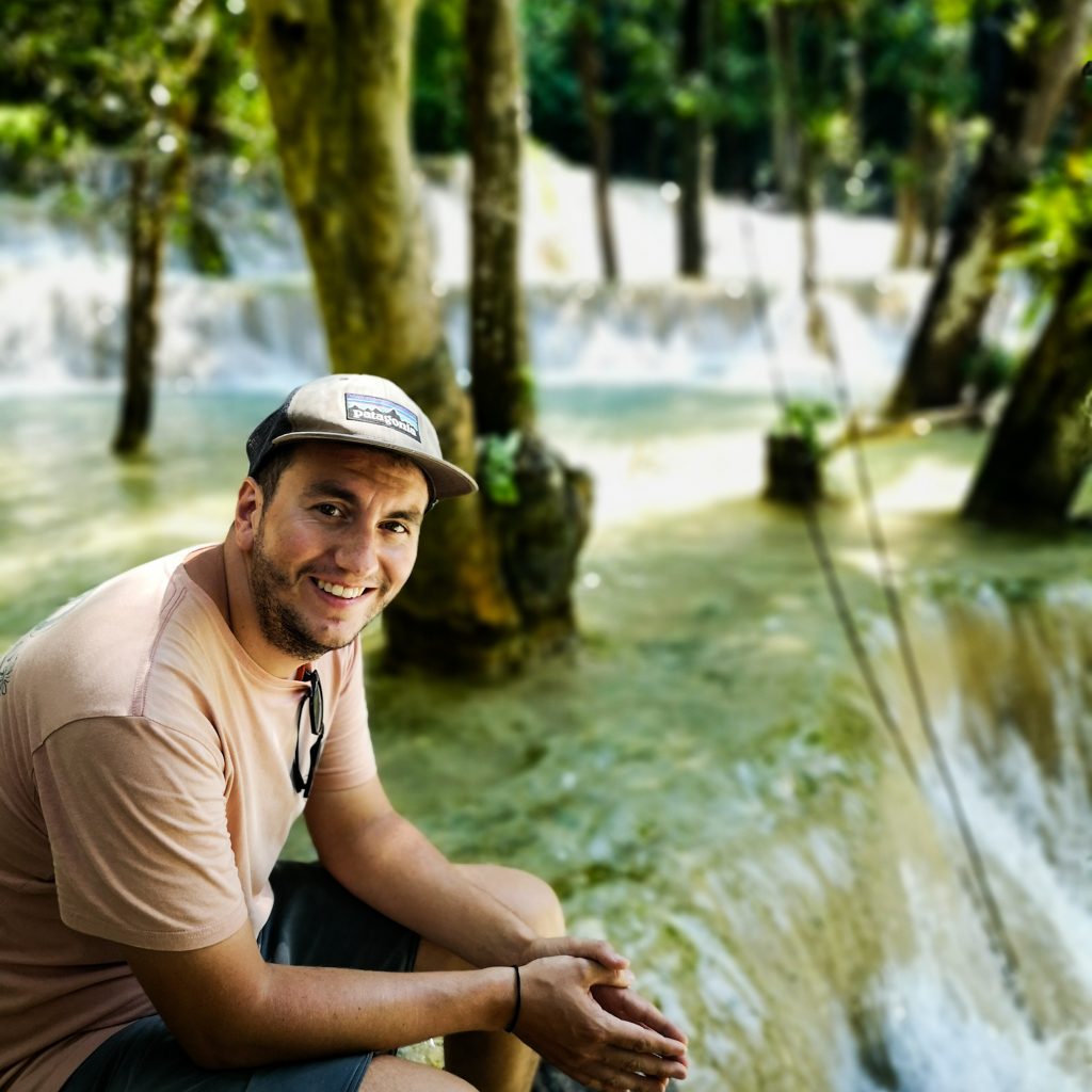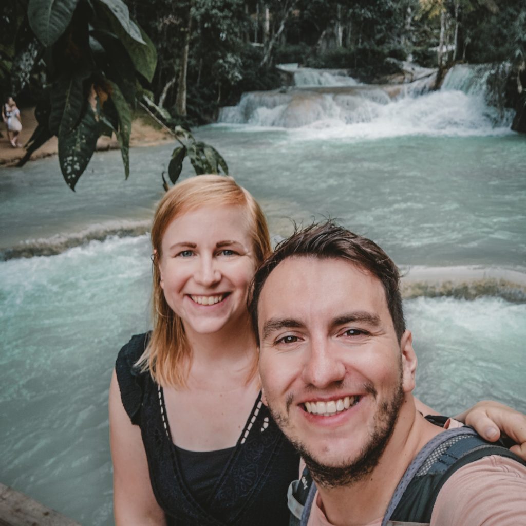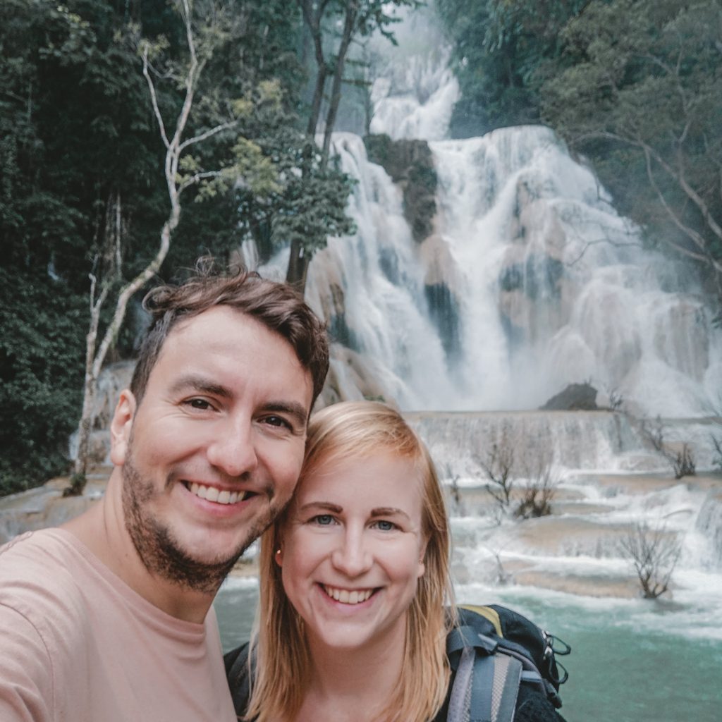 Als wir die Tickets kaufen, sehen wir zwei weitere Pärchen, die kurz vor uns eingetroffen sein müssen. Sie steigen etwas gehetzt in ein Golfcaddy, in das wir auch noch einsteigen werden. Mit diesem werden wir ca. 5 Minuten bergauf zu einem kleinen Marktplatz gebracht. Es scheint, als wenn es auf dem riesigen Gelände ein richtiges Dorf gibt. Auf dem Marktplatz gibt es jede Menge Snacks, Obst- und Gemüsestände und auch Souvenirs. Aber dafür sind wir ja nicht hier. Die anderen beiden Paare offensichtlich auch nicht. Sie springen gerade zu aus dem Golfcaddy und gehen schnellen Schrittes Richtung Eingang zum Wasserfall. Wir schauen uns beide an, warum rennen die so? Gibt’s jetzt ne Art Wettrennen, wer als erstes am Wasserfall ist? Da sind wir definitiv raus, es ist 8 Uhr und wir hatten noch keinen Kaffee. Wir folgen ihnen also im gemütlichen Tempo, ohne uns zu stressen. Es geht ca. 10 Minuten über eine asphaltierte Straße bergauf und dann kommen wir an. Der Kuang Si Wasserfall ist wirklich schön. Auf einer Brücke stehen wir direkt davor und werden durch die erfrischende Gicht im Gesicht ein zweites Mal am heutigen Tag geweckt.