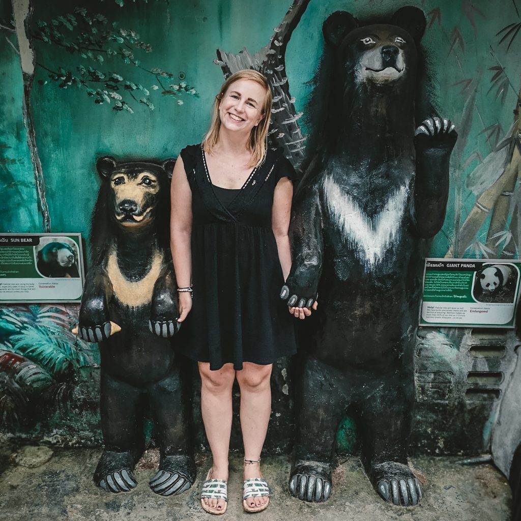 Direkt am Weg gehen wir an einem großen Gehege vorbei. Auf einem hohen Podest liegt etwas schwarzes, flauschiges auf dem Rücken und streckt die Pfoten in die Höhe. Es ist ein asiatischer Schwarzbär, auch Kragenbär oder Weißbrustbär genannt. Er ist auf der Roten Liste der IUCN als gefährdet aufgeführt und durch Abholzung und Wilderei seiner Körperteile, die in der traditionellen Medizin verwendet werden, bedroht. Die schwarzen Bären mit der braunen Schnauze haben einen abgesetzten weißen Fleck auf der Brust, der einer um 90 Grad gedrehten Halbmondsichel ähnelt. Das Gehege hier gehört zu einer Bärenauffangstation, die Bären aus der Gefangenschaft befreien konnten. An vielen Stationen wird hier über das Schicksal der Kragenbären informiert. In der chinesischen Medizin gilt die Galle der Bären als wirksames Heilmittel. Daher werden sie gejagt und in kleine Käfige eingesperrt, wo ihnen dann täglich ihre Galle abgezapft wird. In den Käfigen können sich die Bären nicht bewegen, weshalb ihre Muskeln verkümmern. Bevor die von Tierschützern befreiten Bären in die Freiheit entlassen werden, müssen sie daher in der Auffangstation wieder aufgepäppelt werden. Viele Bären sind trotzdem leider zu schwach und krank, um ausgewildert zu werden und verbringen dann leider den Rest ihres Lebens in der Auffangstation. Wir beobachten den Bären noch einen Moment vom der Bank. Zoos sind ja absolut nicht (mehr) unser Fall und natürlich gehören Bären auch nicht in ein Gehege, das vom Besucher:innen zum Fotos machen genutzt wird. Dennoch wird auf das Schicksal der Bären im Gefangenschaft aufmerksam gemacht und unser Exemplar sieht mit seinem Leben hier eigentlich auch ganz zufrieden aus, wie er sich so von einer Seite auf die andere rollt.
