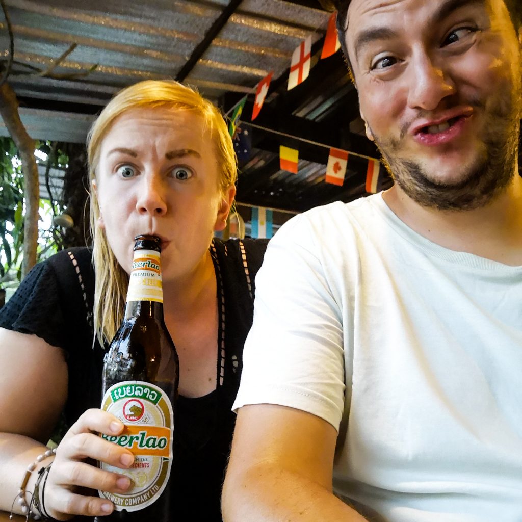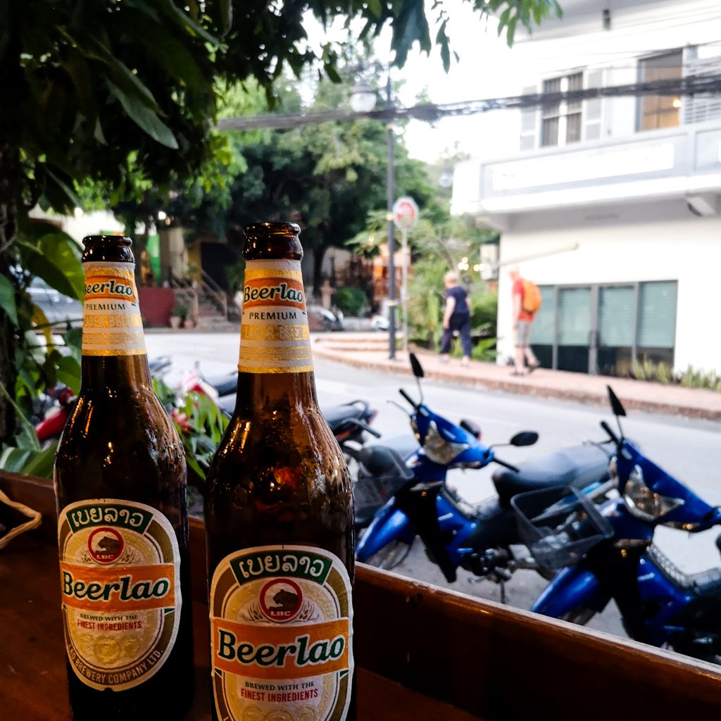Auf dem Rückweg schlendern wir noch über den Markt und Konsti ersteht für Caro ein Geschenk. Sie ist jetzt stolze Besitzerin eines Beerlao T-Shirts. Denn Beerlao gehört zu Laos wie die Currywurst zu Berlin. Hätten wir das auch geklärt. Aber mal ehrlich, wir mögen alles an Beerlao: den Geschmack, das Design, die Geheimzutat Reis, den Preis und natürlich die Werbung an jeder Ecke. Dann versteht es sich von selbst, dass das Fangirl ne Erinnerung bekommt.