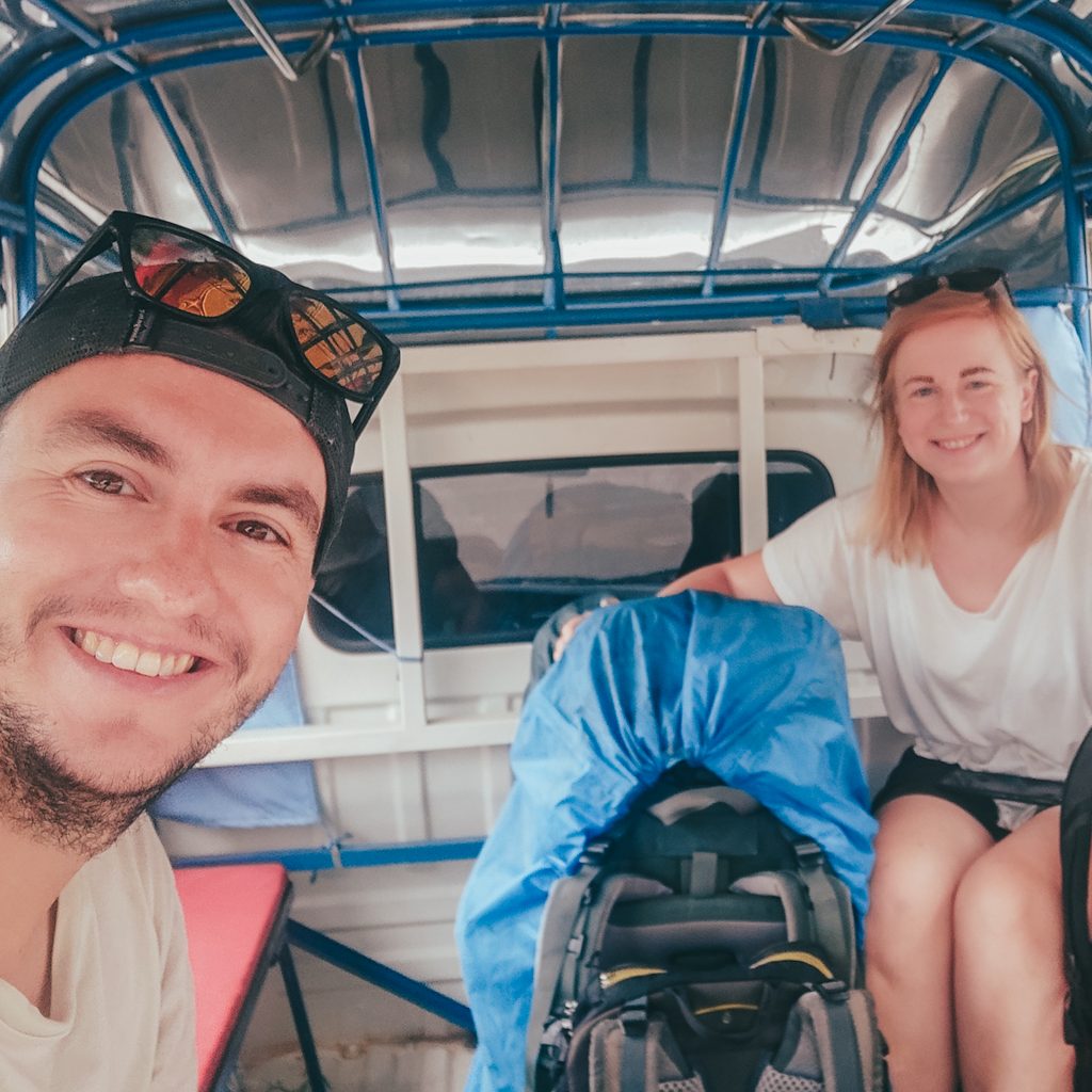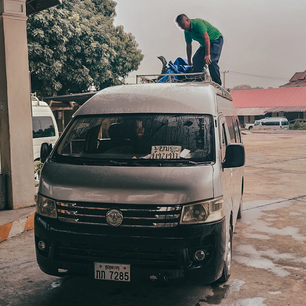 Den Namen kann Caro sich bis zum bitteren Ende nicht merken. Naja, jetzt müssen wir dorthin kommen. Mit einem Tuktuk fahren wir morgens zum Busbahnhof. Mit im Gepäck zwei Baguettes, noch war es uns zu früh zum Frühstücken. Am Bahnhof besorgen wir uns erstmal zwei.. sagen wir mal Kaffee dazu. Noch ist hier nichts los, aber nach und nach kommen immer mehr Touris, ein Minivan wird voll beladen und gegen 9 Uhr geht die Fahrt endlich los. Ca. 4 Stunden und zwei Baguettes später, kommen wir am Busbahnhof an. Das war wirklich unkompliziert. Hier wird unser letzter Stopp in Laos sein und wir sind gespannt, was uns hier erwartet.