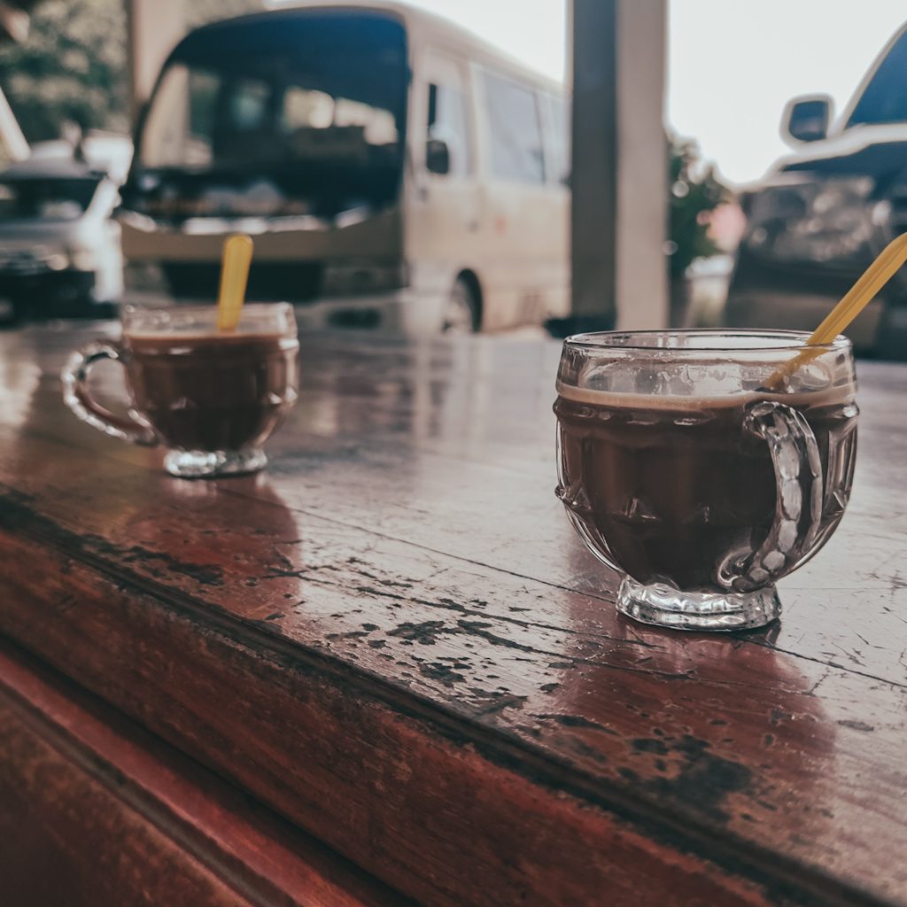 Bevor wir mit dem Kulturprogramm fortfahren, benötigen wir nochmal eine Dosis Koffein. Der Wecker hat einfach zu früh geklingelt. Wir spazieren entlang des Mekongs.