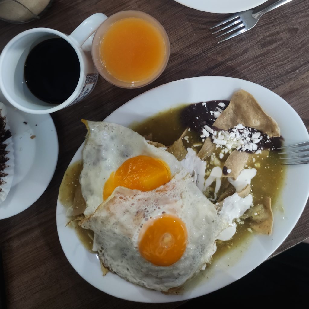 Wir haben uns ein Café herausgesucht, welches die typische Frühstückskombi anbietet: Kaffee, Saft oder Früchte, ein Hauptgericht und dieses Mal sogar noch ein süßes Teilchen. Wir entscheiden uns für Chilaquiles und ein vegetarisches Omelett.