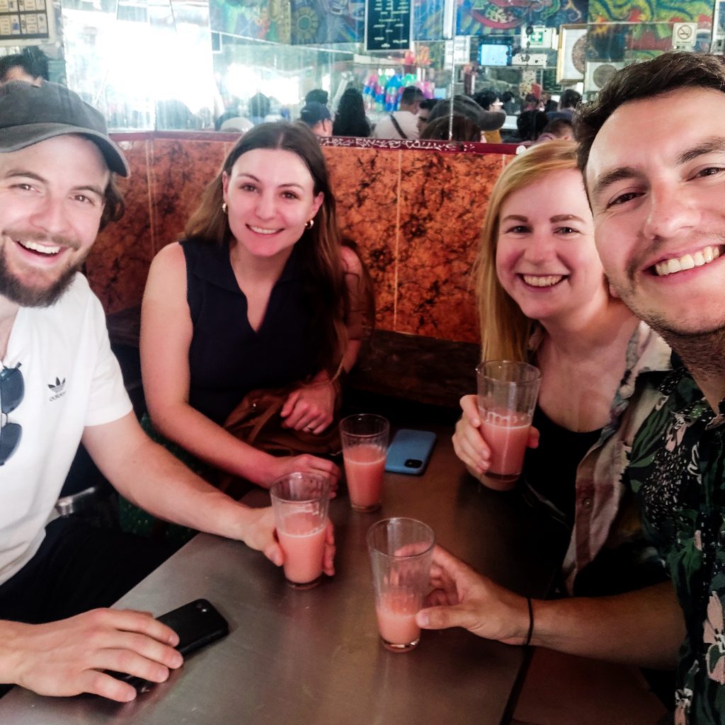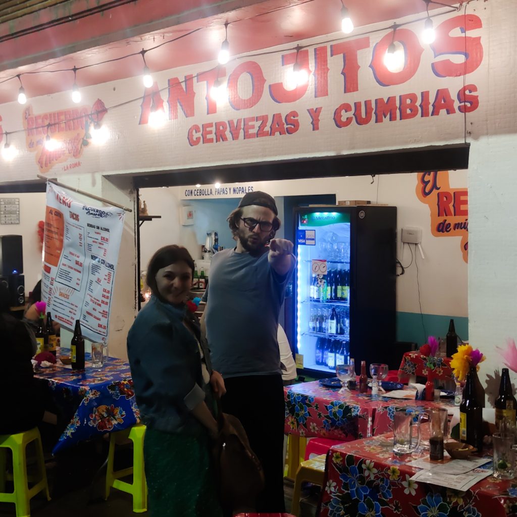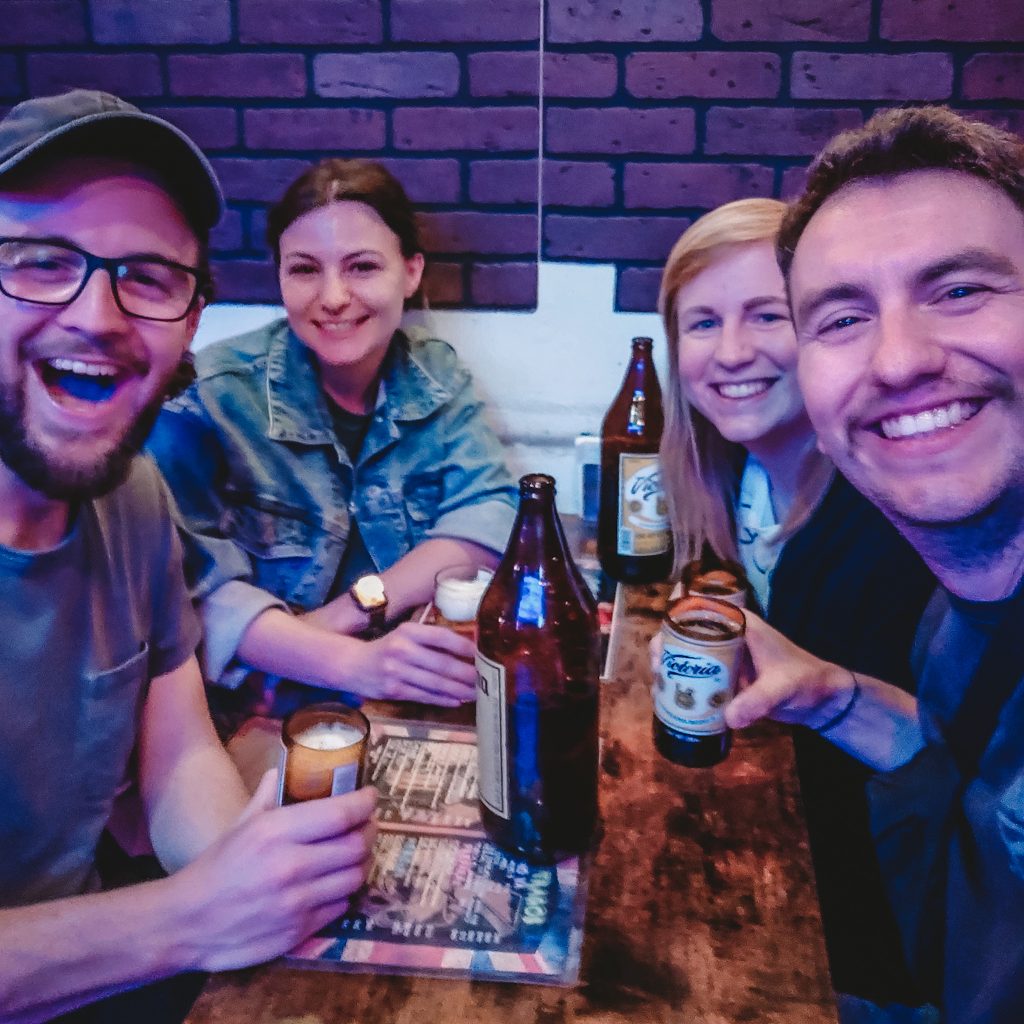 Auch dass Konsti zwischendurch von einem als Jesus verkleideten älteren Herren wegen seiner Tattoos bepöbelt wird, das glauben wir zumindest verstanden zu haben, tut der Stimmung keinen Abbruch. Wir genießen die Zeit mit Felix und Caitlin sehr, mit Freunden zu quatschen, zu philosophieren, in Erinnerungen zu schwelgen oder einfach Blödsinn zu reden, vermissen wir sehr. Die gemeinsame Zeit vergeht außerdem wie im Flug, wir haben morgen noch einen gemeinsamen Tag und dann reisen die beiden auch schon wieder zurück in die USA und auch für uns geht es weiter. Heute Abend geht unsere Reise aber erstmal weiter in die nächste Bar „Las Brujas“. Das bedeutet so viel wie „Hexe“. In der Bar arbeiten ausschließlich Frauen und es ist mega cool. Serviert werden köstliche Cocktails, abgewandelte Formen der Klassiker, die bedeutsamen Frauen der Geschichte gewidmet sind. Die Atmosphäre, die tätowierten Frauen, die Getränke, hier ist wirklich alles cool. Wir natürlich auch. Nach dem Genuss einer Runde Cocktails ist der Abend schon weiter voran geschritten und wir beschließen zuhause noch ein letztes Bier zu trinken. Konsti und Felix machen zwei Bier daraus und gönnen sich noch einen Schluck vom mitgebrachten Tequila. Dann geht es aber wirklich ins Bett.