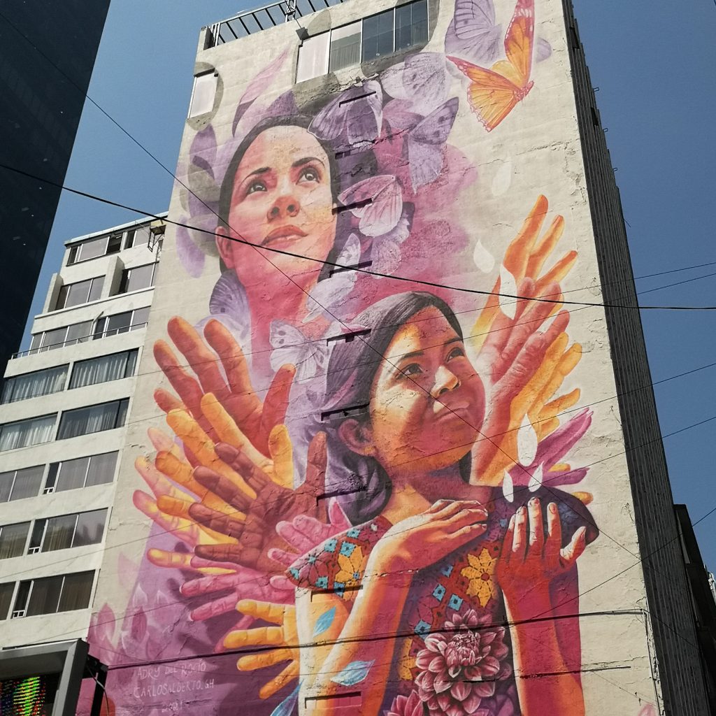 Unsere erste Nachtfahrt verläuft soweit ganz gut. Die Sitze sind bequem, wir können Harry Potter auf Spanisch schauen und kommen morgens gegen 7 Uhr in Mexiko Stadt an. Wir haben noch jede Menge Zeit, eigentlich können wir erst um 16 Uhr in das gebuchte Airbnb einchecken. Daher machen wir es uns am Busbahnhof bequem, trinken einen Kaffee, machen uns im Bad etwas frisch und nutzen die Zeit zum Beantworten von WhatsApp Nachrichten. Wir schmieden den Plan, in die Stadt zu fahren, frühstücken zu gehen und dann ins anthropologische Museum zu gehen. Dort können wir hoffentlich unser Gepäck sicher und günstig zwischenlagern. Laut Google Maps können wir wieder mit der Metro in die Stadt fahren. Nachdem wir allerdings 10 Minuten orientierungslos herum laufen und zuletzt jemand fragen, müssen wir feststellen, dass es diese Metrostation schlichtweg noch nicht gibt. Das erklärt die riesige Baustelle vor dem Busbahnhof. Wir sollen einfach mit dem grünen Bus für 5 Pesos in die Stadt fahren erklärt uns der Mann. Wir folgen dem Weg und landen (ohne zu zahlen) in einer endlos erscheinenden Schlange an einer Bushaltestelle. Es gibt zwei Schlangen, die sich zwischen Absperrungen schlängeln. Bei der einen Schlange kommt ein Bus nach dem nächsten, bei uns passiert erstmal 15 Minuten gar nichts. Außer, dass sich eine zweite Schlange bildet und die Stimmung etwas hitziger wird. Nochmal 10 Minuten später kommt dann ein Bus. Im Leben kommen wir da nicht mehr rein denken wir uns. Der Bus wird allerdings immer voller und wir rücken immer weiter nach vorne. Wir stehen fast ganz vorne, da löst sich die Schlange und ein paar Leute quetschen sich noch in den Sardinen-Bus. Mit unseren Rucksäcken unvorstellbar, das wird nichts. Auf den nächsten Bus müssen wir tatsächlich gar nicht so lange warten und unsere Geduld zahlt sich aus. Wir bekommen zwei Sitzplätze. Der Bus ist wieder proppevoll. Wie wir hier wohl rauskommen? Wir müssen uns richtig rausquetschen. Glücklicherweise sitzen wir relativ nahe der Tür. Puh, das war aufregender als gedacht. Andere Touris haben wir bis dato übrigens nicht gesichtet. Das ändert sich aber, als wir durch die Stadt laufen. Hier ist das Publikum wieder bunt gemischt und wir sind uns auch sicher, dass hier viele Expats unterwegs sind. Es ist ganz ungewohnt, in einer so riesigen Stadt unterwegs zu sein. Aber schon auf den ersten Blick ist es hier viel sauberer und grüner als wir es uns vorgestellt haben.