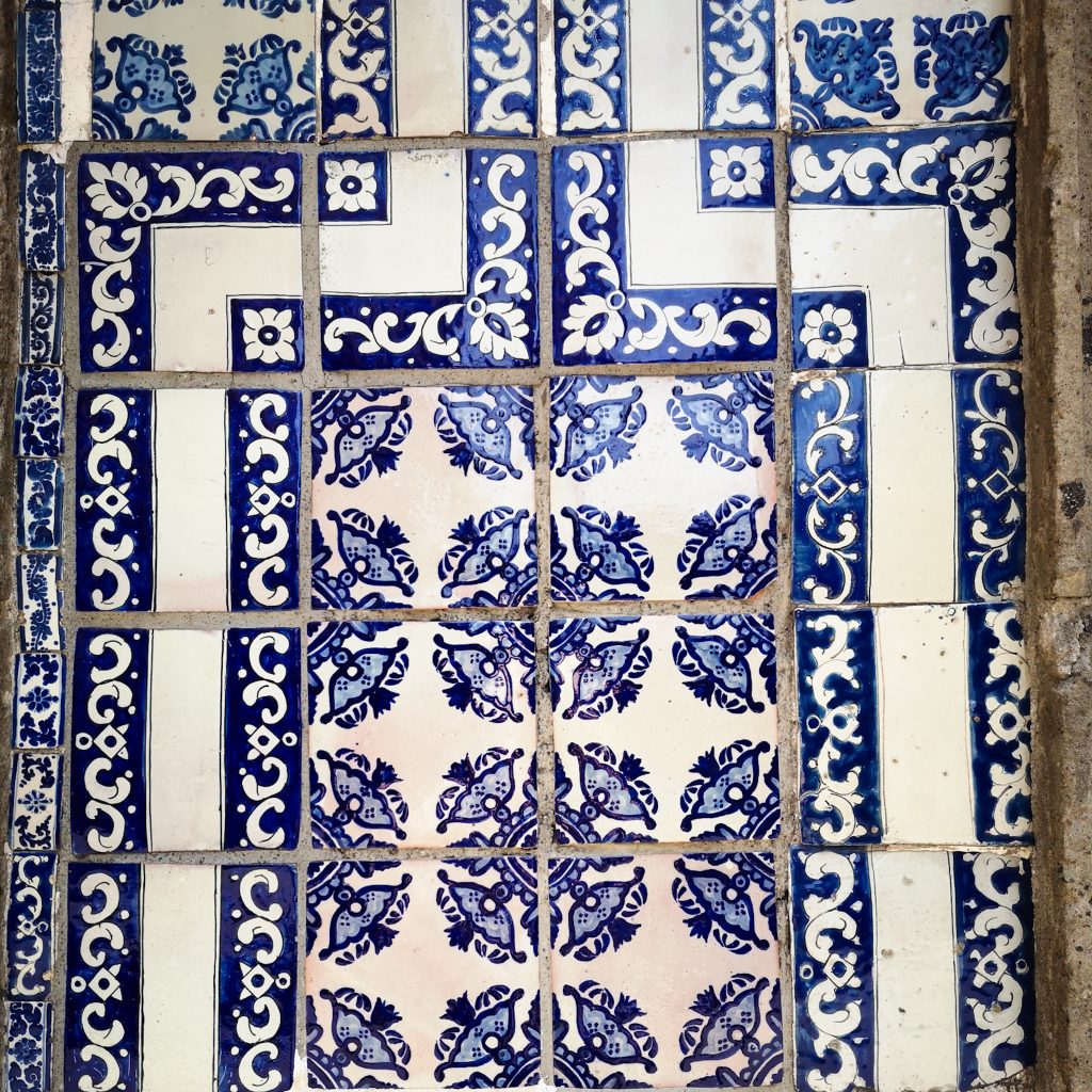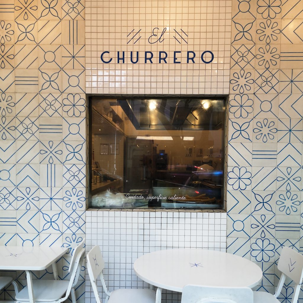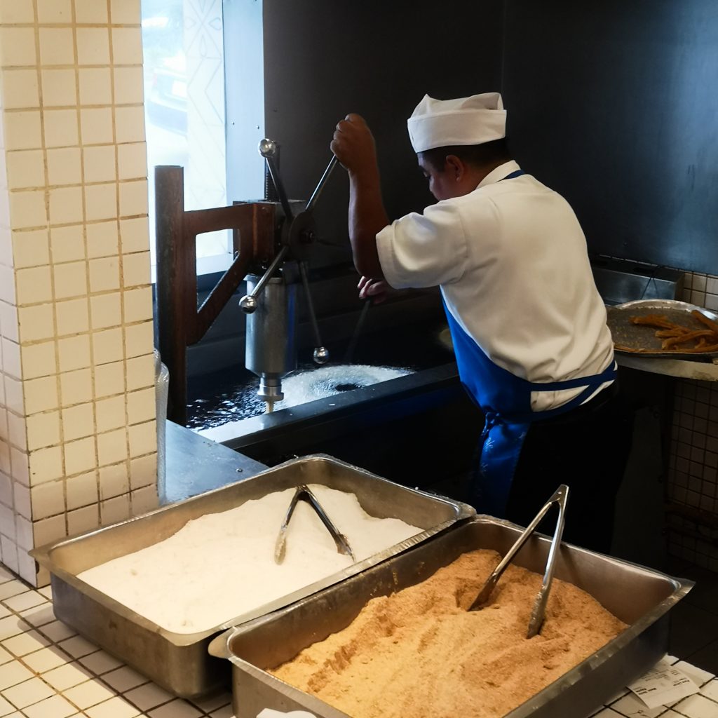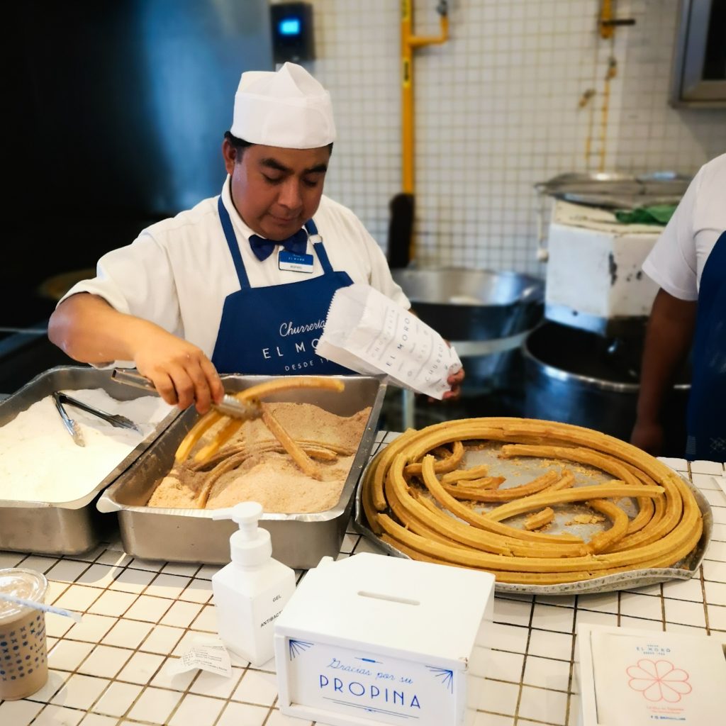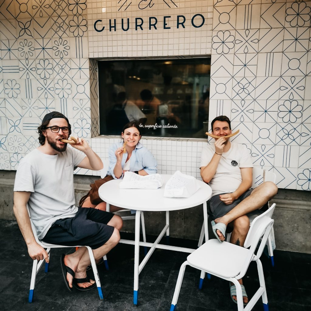 Der folgende Wunsch kommt von Konsti. Er ist nämlich völlig empört, dass wir bis dato noch keine Margarita getrunken haben. Das können wir ändern, wir steuern eine kleine Markthalle an, die lustigerweise auch unter unseren bei Maps markierten Orten ist. Zur aktuellen Stunde am Nachmittag ist noch nicht viel los und neben unserer ersten Margarita bekommen wir auch einen gratis Probier-Mezcal. Damit hätten wir Konsti auch glücklich gemacht – Haken dahinter. Um die Reihenfolge Trinken, Essen, Trinken weiter geregelt fortzuführen, geht es nun mit einem erneuten Snack weiter: Es ist Zeit für Churros! Denn bisher haben die beiden (ganz im Gegensatz zu uns) noch keine mexikanischen Churros getestet. Das kann so natürlich nicht sein, daher besuchen wir nun die Churreria „El Moro“. In den stylischen, weiß-blau gekachelten Läden werden die Churros direkt vor den Nasen der Kund:innen zubereitet. Und wer bitte möchte nicht dabei zusehen, wie der endlose Churro-Teig in rosettenform in ein riesiges Bad aus heißem Fett gegeben wird und darin erstaunlich lange baden geht? Im Grunde genommen weiß ja schon jedes Kind, dass die Nährwerte von Churros im dunkelroten Bereich liegen. Wie soll es bei einer Kombi aus kalorienhaltigem Teig, jeder Menge Zucker und einem Fett-Bad auch anders sein. Schmecken tun sie trotzdem ganz hervorragend, vor allem, wenn sie noch heiß sind. Wer mag kann sich übrigens als kleine Kalorien-Krönung noch ein bisschen Schokoladen-Soße zum Tunken bestellen.