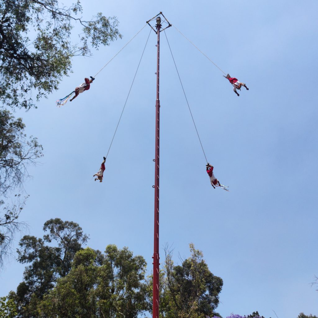 Auf einem Platz vor dem Museum erleben wir unerwartet die Voladores de Papantla, den Tanz der fliegenden Männer. Das müssen wir natürlich erstmal googlen, es folgt ein kleiner Exkurs: Seit über 1.000 Jahren praktizieren die fliegenden Männer von Papantla ihre artistische Tradition zu Ehren der Götter der Fruchtbarkeit. Die Zeremonie wurde von verschiedenen indigenen Volksgruppen in Mexiko veranstaltet, insbesondere jedoch im Stammland der Totonaken und Huasteken, in der Region von Papantla im Bundesstaat Veracruz. Was wir mit steifen Nacken und offenen Mündern beobachten: Vier traditionell gekleidete Männer besteigen einen ca. 30 m (!) hohen Pfahl zu einer minikleinen quadratischen Plattform. Unterhalb dieser kleinen, drehbaren Plattform sind vier Seile angebracht, welche die vier Volandores sich um die Hüften binden. Einer der Männer musiziert auf einer Flöte und trommelt gleichzeitig im Rhythmus. Dann lassen die Männer sich kopfüber fallen. Durch die Drehungen wickeln sich die Taue vom Pfosten ab und die Akrobaten schweben in immer grösser werdenden Bahnen im Kreis, bis sich das Seil abgewickelt hat. Kurz vor dem Auftreffen am Boden wenden sie sich, um auf den Füssen zu landen. Währenddessen spielt einer der Männer immer weiter Flöte und trommelt. Verrückt. Wirklich verrückt. Jeder Tänzer vollführt dabei 13 Umdrehungen, die vier zusammen also 52 Kreise, was dem Kalenderzyklus der damaligen Epoche entspricht. Der Flötenspieler symbolisiert wahrscheinlich die Sonne, die vier Flieger die wichtigsten Elemente Erde, Luft, Wasser und Feuer.
