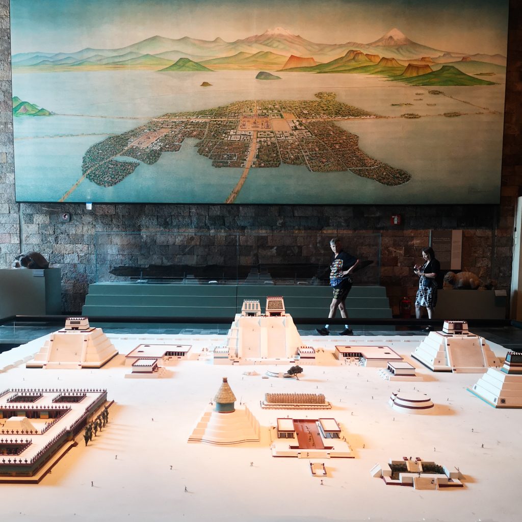 In den folgenden Stunden widmen wir uns der Entstehungsgeschichte der Menschheit und der Geschichte der Menschen in Mexiko und die ist echt spannend. Wir lernen viel über die Menschen, die von Asien rüber auf den amerikanischen Kontinent gekommen sind und sich hier verteilt haben, über Azteken (die ihren eigenen Staat übrigens Mexica genannt haben) und Maya. Das Museum ist wahnsinnig umfangreich, wir kämpfen uns von Raum zu Raum. Thematisch ist alles sehr gut aufgeteilt und aufbereitet. Glücklicherweise sind nicht alle Informationen auf Englisch übersetzt. Andernfalls bräuchten wir wahrscheinlich Tage, um alle Beschilderungen zu lesen und vor allen Dingen aufzunehmen. Irgendwann merken wir dann doch den gestrigen Abend und damit verbunden die schwindende Aufmerksamkeitsspanne. Caitlin hält am längsten durch, aber am Ende sind wir tatsächlich richtig kaputt und müde, als wir das Museum verlassen. Ein paar Eindrücke bekommt ihr noch.