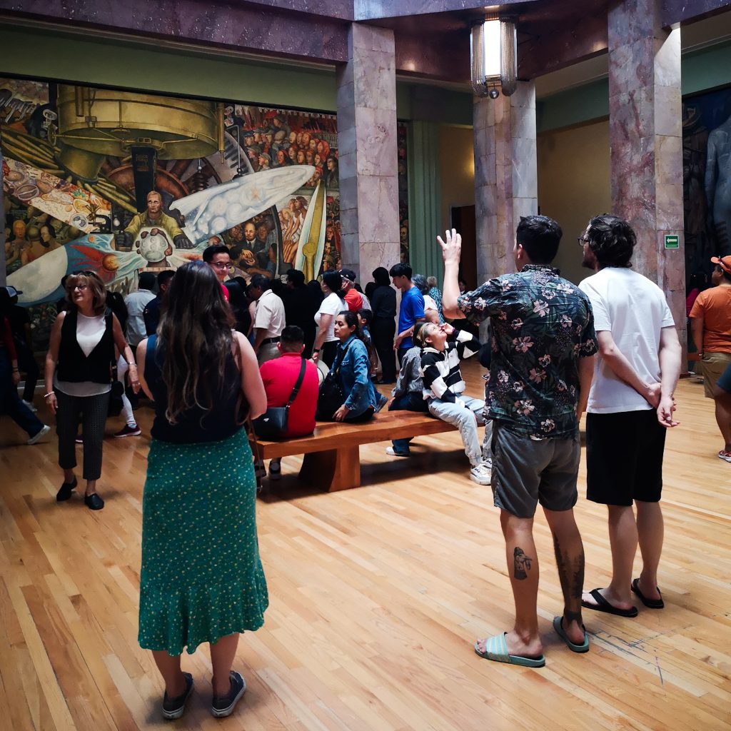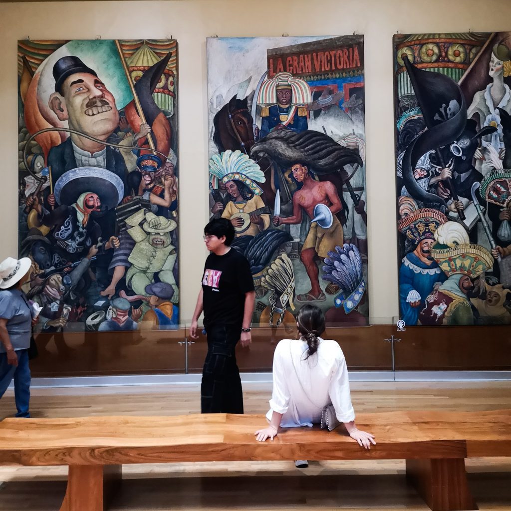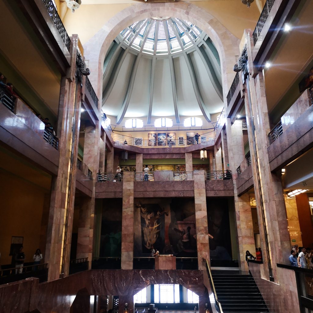 Wir beginnen mit der Ausstellung „Pico y elote“ von Damian Ortega. Sie besteht aus Installationen, Skulpturen, Fotografien, Filmen und Textilien, die ab den 1990er Jahren entstanden sind. Mit ihnen wirft er einen ironischen Blick auf die Bedingungen von Produktion und Konsum, an denen wir teilhaben. Auf der zweiten Etage befindet sich eine Foto-Galerie des Künstlers Flor Garduño mit dem Namen „Senderos de vida“, die einen Rückblick und eine kritische Analyse von mehr als vier Jahrzehnten Arbeit des mexikanischen Fotografen zeigt. Zur Abwechslung finden wir ein bisschen Kunst gar nicht mal schlecht. Achja, dann wäre da noch das berühmte, riesige Gemälde von Diego Rivera „El hombre controlador del universo“ (1934): Im Zentrum, in der Mitte einer großen Tafel, erscheint ein blonder Arbeiter, der unsicher, aber hoffnungsvoll in eine bessere Zukunft blickt, während er mit seinen Händen die natürlichen und mechanischen Kräfte des Universums kontrolliert. Er muss sich entscheiden zwischen der Bedrohung durch den Kapitalismus, die von den Vereinigten Staaten ausgeht, und dem Versprechen des Sozialismus, das die Sowjetunion darstellt.