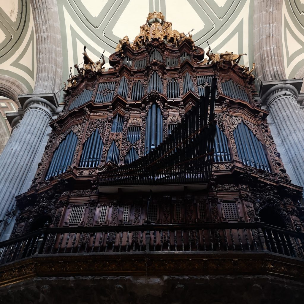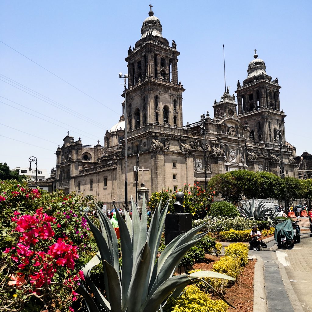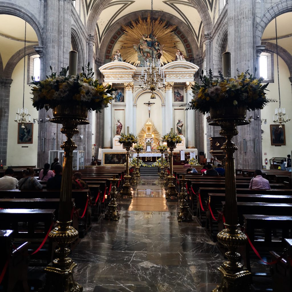 Den Platz kennt der oder die ein oder andere vielleicht schon aus dem James Bond Film „Spectre“, da die Eröffnungsszene auf diesem riesigen Platz spielt. Und noch ganz kurz apropos „Spectre“: Erinnert ihr euch an die Eröffnungsszene am Tag der Toten, der mit einer riesigen Parade begangen wird? Eine solche Parade hat es bis dato in Mexiko-Stadt eigentlich gar nicht gegeben. Die Filmschaffenden haben sich das ausgedacht. Aber, um durch den Film angelockte Touris nicht zu verärgern, haben die Verantwortlichen in Mexiko-Stadt entschieden, jedes Jahr nun eine Parade am Tag der Toten stattfinden zu lassen. Wir gehen an der Kathedrale von Mexiko Stadt vorbei. Wir staunen nicht schlecht, wie groß diese Kathedrale ist. Kein Wunder, es ist die größte und älteste Kathedrale des amerikanischen Kontinents und der Sitz des katholischen Erzbischofs von Mexiko. Nur kurz zur Einordnung: Die Innenmaße umfassen eine Länge von 118 m, eine Breite von 54 m und eine Höhe von 55 m. Der Innenraum besteht aus fünf Schiffen mit vierzehn Kapellen, einer Sakristei, einem Kapitelsaal, dem Chor und einer Krypta. Man möchte fast behaupten, dass der Kölner Dom dagegen einpacken kann..