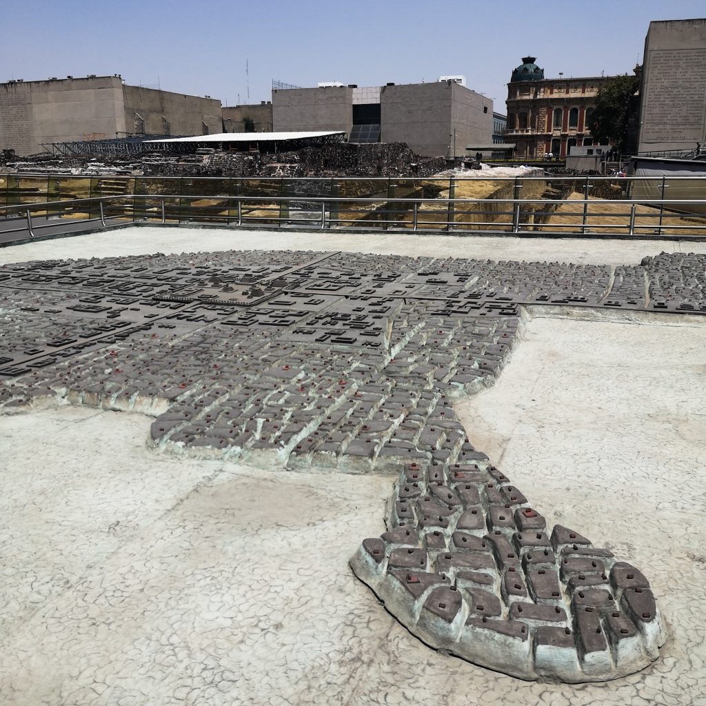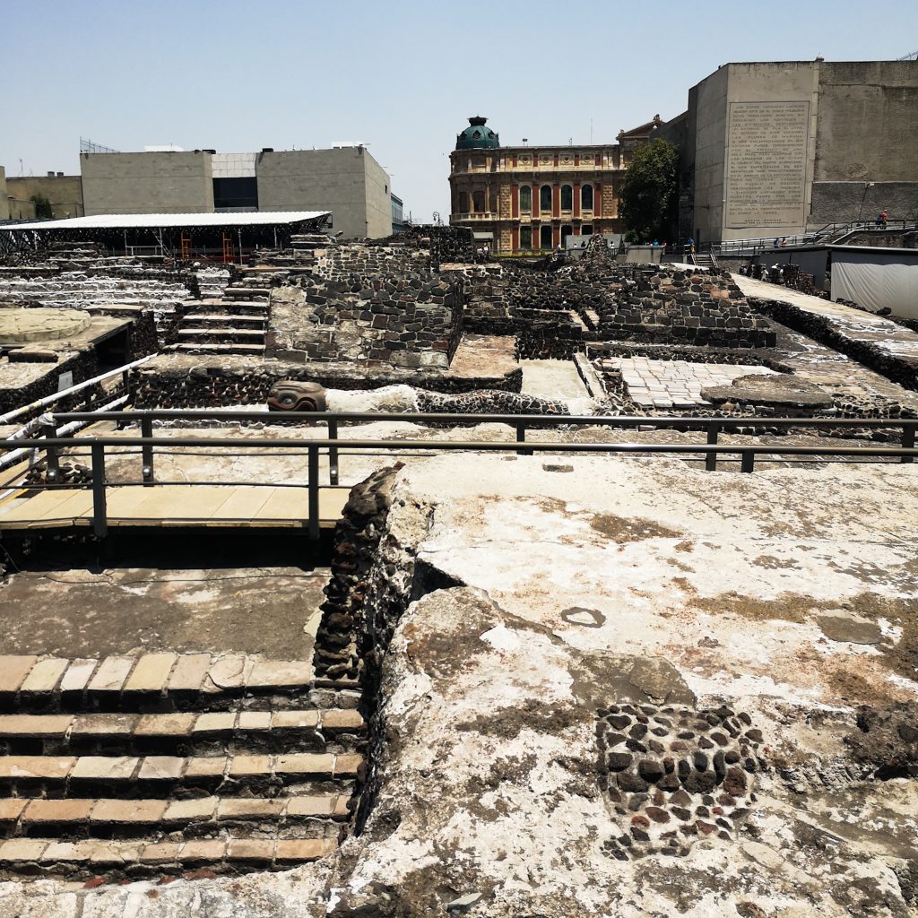 Das könnte auch daran liegen, dass sich am Zócalo einige der wichtigsten Institutionen des Landes befinden: Die Kathedrale, das Rathaus, der Sitz des Gouverneurs und der heute zu besichtigende Templo Mayor. Dazu müssen wir ebenfalls ein paar Informationen mit euch teilen: Der Templo de Mayor war nämlich der wichtigste und größte Tempel der aztekischen Hauptstadt Tenochtitlán, des heutigen Mexiko-Stadt. Der im heiligen Bezirk der Stadt gelegene Tempel besaß eine Höhe von rund 60 Metern. Zahlreiche kleinere Plattformen und Bauten, die mit dem Tempel verbunden waren, bildeten mit ihm zusammen einen geschlossenen Gebäudekomplex. Heute kann man noch die Ruinen anschauen und ein Museum besuchen, aber selbst ohne den Besuch des Museums, kann man von einer Plattform einen Blick auf die Gemäuer werfen und sich eine Vorstellung davon machen, wie groß der Bereich damals gewesen sein muss.