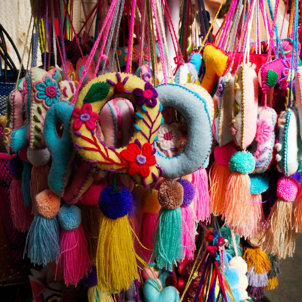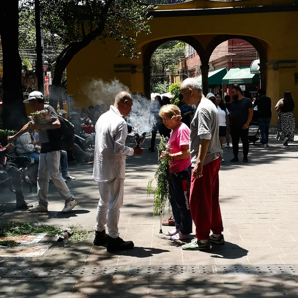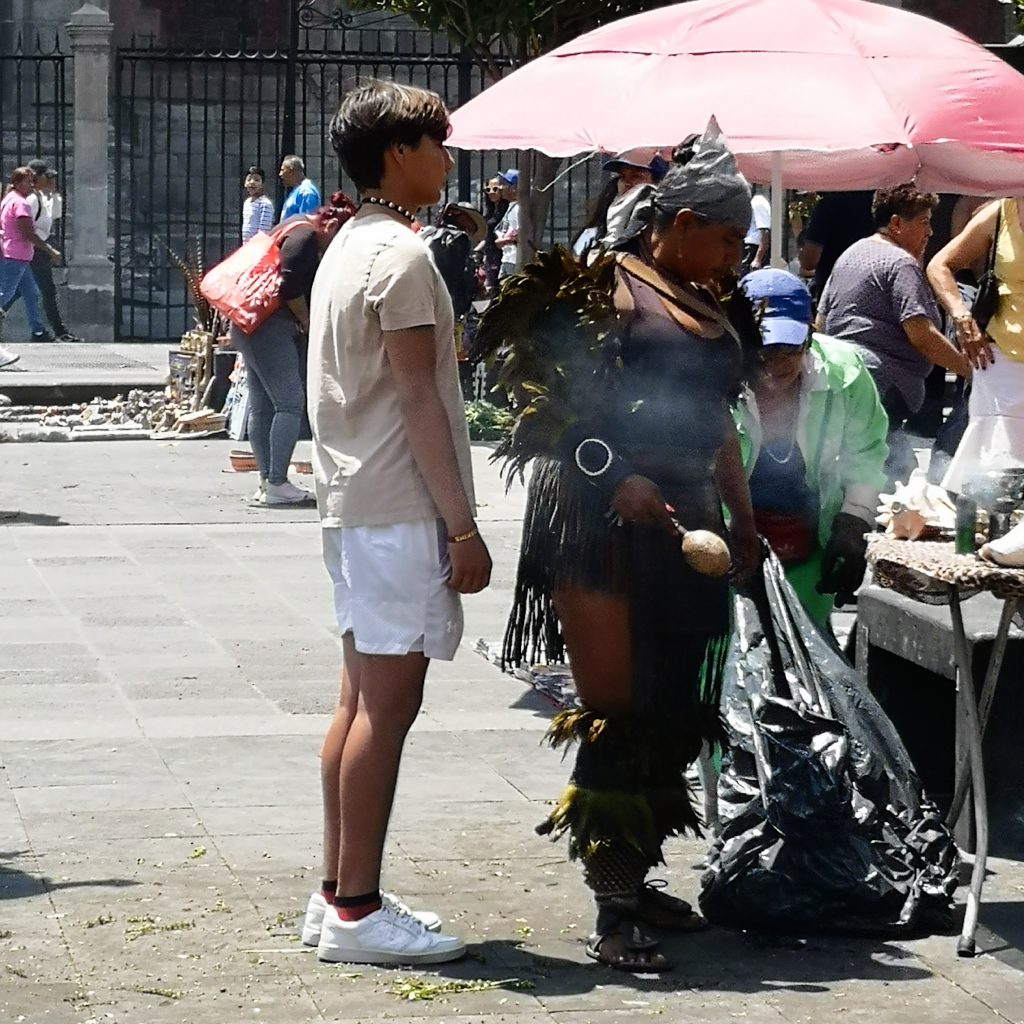Auf dem Platz sind heute riesige Zelte aufgebaut, ob diese immer dort stehen wissen wir nicht. Unter dem Zeltdach finden riesige Märkte mit so ziemlich allen Produkten statt. Speisen, Getränke, Souvenirs, Kleidung – alles wird lautstark angeboten. Probierlöffel mit Mole, Schokolade und Honig werden der Reihe nach verteilt und es ist richtig viel los. Was wir daran so lieben? Irgendwie schwimmt man mit dem Strom. Sowohl Einheimische als auch Reisende sind hier unterwegs, eine bunte Mischung mit entsprechender Geräuschkulisse. Was wir hier ebenfalls noch interessiert beobachten, traditionell gekleidete Menschen, die anscheinend ein Ritual bei einzelnen Menschen durchführen. Das klingt erstmal komisch, scheint aber irgendwie besonders für die Einheimischen total normal zu sein. Meist werden die Kund:innen mit rauchenden Sträuchern (?) umwirbelt. Manchmal wird eine Art Flüssigkeit um die Menschen herum auf den Boden gespritzt. So richtig durchblicken tun wir dieses Ritual noch nicht, aber wir sind erstaunt, wie viele Menschen es hier anbieten. So langsam wird es in der Mittagshitze sehr heiß. Wir laufen wieder ein Stück in Richtung unserer Unterkunft und landen an einem Ort, der definitiv eines unserer Highlights in Mexiko-Stadt wird: