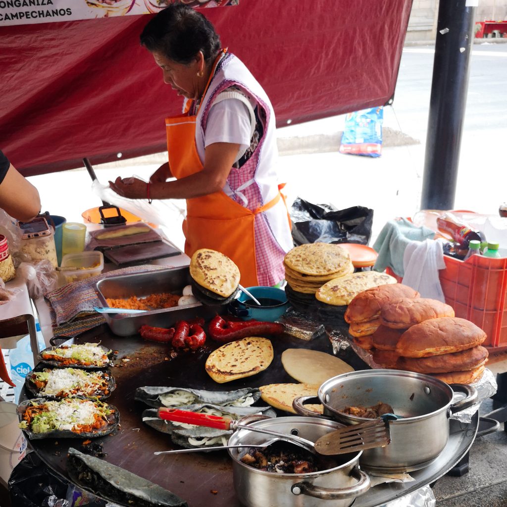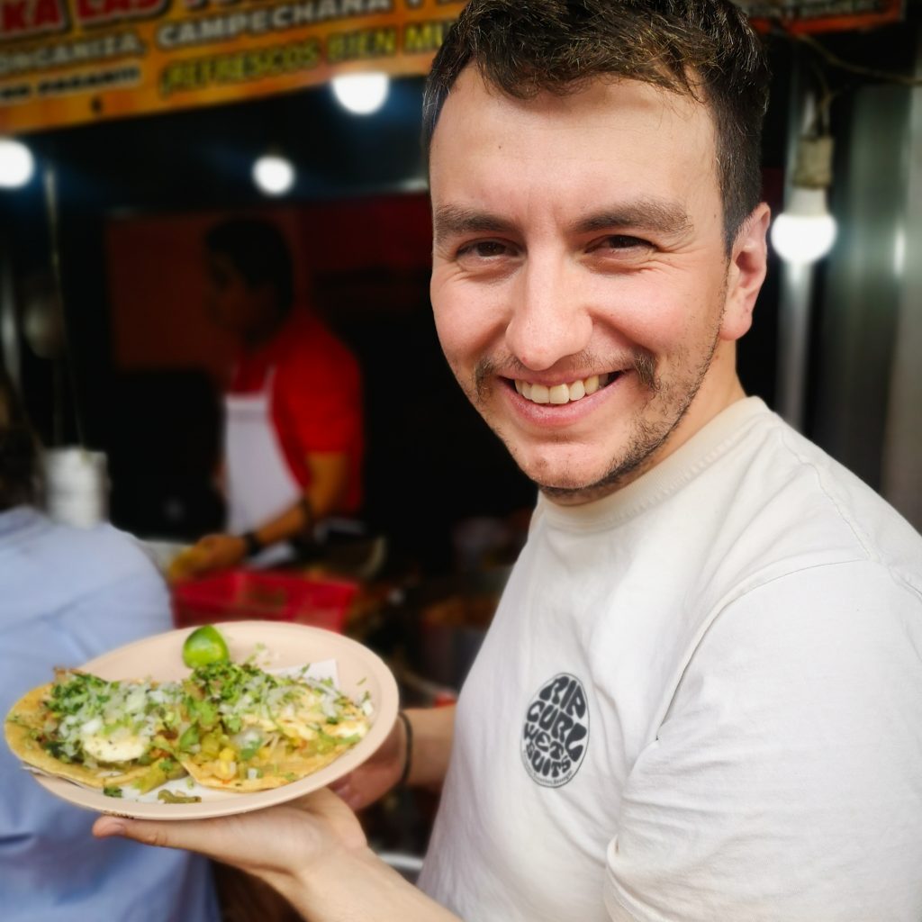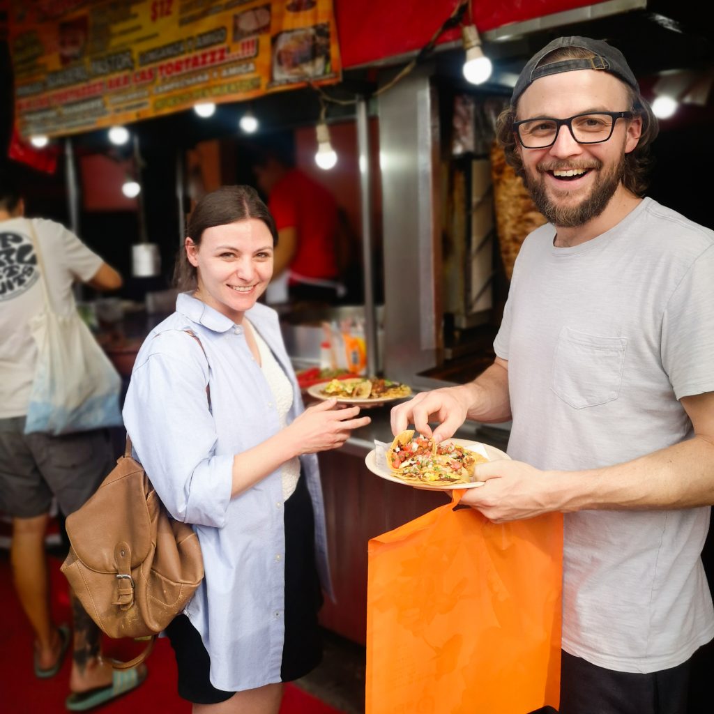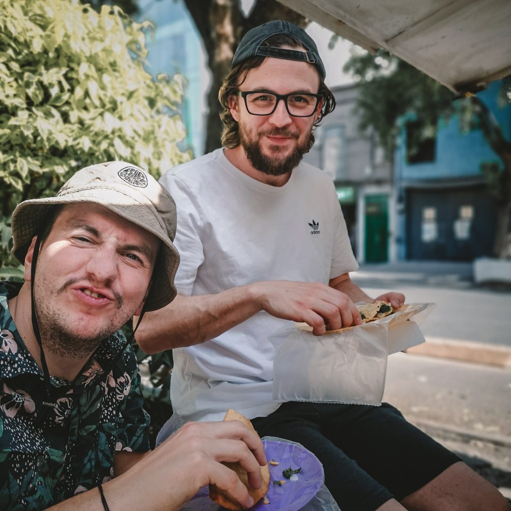 Da wäre noch der Taco Straßenstand, den Tim uns empfohlen hat. Er ist direkt um die Ecke und nach dem Bier ist der Appetit groß. Wir sind uns zwar nicht ganz sicher, welchen der Stände Tim gemeint hat, aber eigentlich kann es nur DIESER gewesen sein. Denn hier essen wir die besten Tacos in ganz Mexiko. Wir sind zwar erst etwas skeptisch, ob bei dem ganzen gegrillten Fleisch auch etwas Vegetarisches im Angebot ist, aber der Mann versteht uns sofort „Vegetarianos? Claro!“. Während Felix und Caitlin überzeugt direkt drei Tacos bestellen, sind wir etwas verhalten und bestellen erstmal jeweils einen Taco. Für unsere Version werden verschiedene Gemüsesorten angebraten, Käse und die „Gamechanger-Zutat“ Ananas wird hinzugefügt und fertig ist unser Taco. Wir selbst können uns noch an diversen Soßen sowie Zwiebeln und Koriander bedienen. Der Taco ist riesig und unfassbar gut! Natürlich müssen wir noch einen weiteren bestellen. Das beste am Ende der Geschichte? Es ist nicht nur der beste Taco, den wir bisher gegessen haben, sondern tatsächlich auch der günstigste. Für sechs Tacos mit Fleisch und vier vegetarische Tacos zahlen wir insgesamt um die 6 Euro. Deal! Schade, dass wir morgen schon alle wieder abreisen. Hier hätten wir definitiv noch öfter hingehen können.
