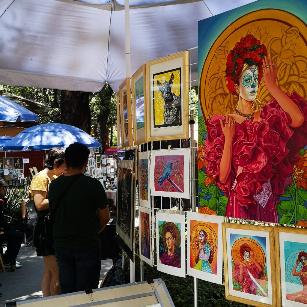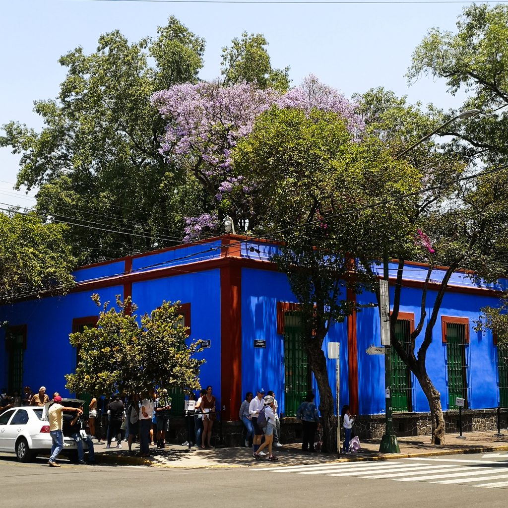 Nach einem köstlichen Chilaquiles-Frühstück starten wir mit der U-Bahn von Mexiko-Stadt Richtung Coyoacán, dem „Ort der Koyoten“. Der südliche Stadtbezirk war bis Mitte des 19. Jahrhunderts vor allem für seine Gärten und Quellen bekannt und zog als Wohnort eine Reise von in- und ausländischen Künstler:innen an. Eine der bekanntesten Attraktionen ist wohl das Frida Kahlo Haus. Das sich dort drin befindende Museum ist allerdings gar nicht so leicht zu besichtigen. Die Tickets sind zum Teil schon Wochen vorher ausverkauft und auch wir haben kein Glück. Darüber hinaus sind auch die Meinungen über die tatsächliche Ausstellung etwas gemischt.