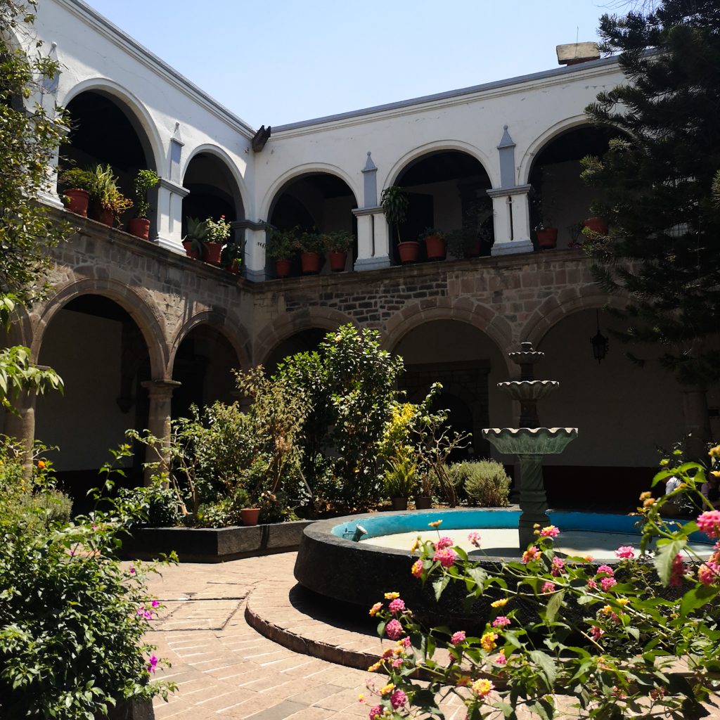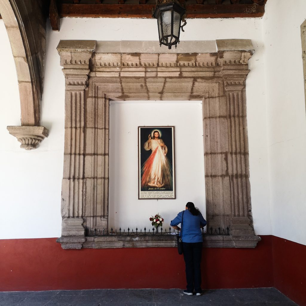 Weiter geht es zu Fuß Richtung Plaza Hidalgo. Wir werfen einen Blick in die Kirche und dieses Mal auch in den schönen Hinterhof. Unsere Köpfe stecken wir in eine hintere Halle aus der laute Musik tönt. Anscheinend kommt hier die Kirchengemeinde zusammen und lässt den Tag mit Tanz und Gesang ausklingen. Auf dem Platz selbst ist auch viel los. Familien, Eltern, junge und alte Leute genießen den sonnigen Sonntag hier. Zwischendurch spaziert ein Kojoten-Makottchen der Polizei über den Platz, ein älteres Ehepaar lässt sich von einem Schamanen durchräuchern und zu unserem Bedauern wird gerade noch ein Verkaufsstand mit lauter Welpen aufgebaut.