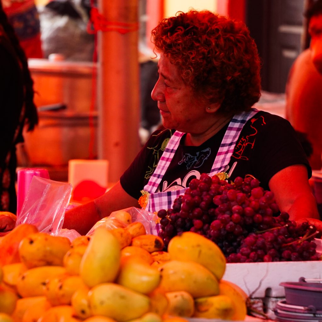 Weiter hinten gibt es auch noch Stände mit Kakaobohnen und weitere Essensstände, die sozusagen einen Mittagstisch anbieten. Oberhalb der speisenden Menschen hängt die Decker voller bunter Papierfähnchen, richtig schön. Ach, hier ist einfach alles schön und wir sind wirklich ein paar Stunden damit beschäftigt uns über den Markt treiben zu lassen. Vielleicht auch ein kleines bisschen mit unserer Speisenplanung. Schließlich bleiben wir noch ein paar Tage und haben eine Küche. Wenn wir schon keine Souvenirs shoppen, dann doch wenigstens ein bisschen Obst und Gemüse.