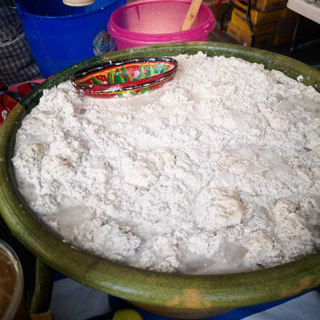 Caro würde am liebsten Schürzen-Shopping betreiben, aber nach einem kurzen Innehalten müssen wir dann doch offen zugeben, dass wir zum einen nicht mal beim Kochen einer Tomatensauce eine Schürze tragen und es zum anderen wesentlich sinnvoller wäre ein paar Pesos in ein neues T-Shirt ohne Löcher und dreckige Verfärbungen zu investieren. Stattdessen testen wir Tejate, ein Getränk, das aus Erdnüssen, Kakaobohnen, Mamey Kernen (auch Große Sapote genannt – siehe Foto), „Rosita de cacao“ Blüten sowie Mais-Masse hergestellt wird. In einer großen Schüssel werden die Zutaten (die zuvor maschinell gemahlen werden) zu einem Teig verarbeitet, der stark durchgeknetet werden muss. An der Oberfläche setzen sich kleine weiße Flöckchen ab, die eigentlich nur aus dem pflanzlichen Fett der Zutaten bestehen. Darunter befindet sich eine leicht trübe Flüssigkeit, die mit Eiswürfeln gekühlt wird. Mit einer kleinen, ovalen Schöpf-Schale wird die Flüssigkeit dann in Becher verteilt. Normalerweise wird die Tejate dann noch mit etwas Zuckerwasser gesüßt, das ist aber kein Muss. Es schmeckt wahnsinnig gut, erfrischend, leicht süß und ist mal ganz anders als alles, was wir so kennen.