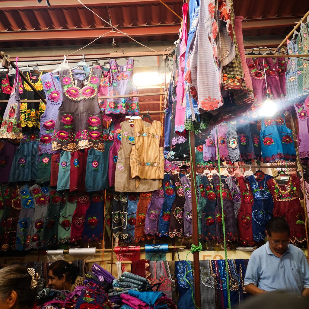 Es reiht sich Stand an Stand. Verkauft wird natürlich alles. Die Stände sind etwas wild mit Planen und Tüchern abgebunden, um Schatten zu spenden. Auf dem Mittelweg auf dem sich sowieso schon viele Menschen in allen Größen und jeden Alters tummeln, schieben immer wieder Verkäufer Schubwägen mit weiteren Produkten durch die Menge und bieten diese laut an. Die meist etwas älteren Frauen tragen fast alle diese wunderhübschen, bunt bestickten Schürzen. Zu schön.