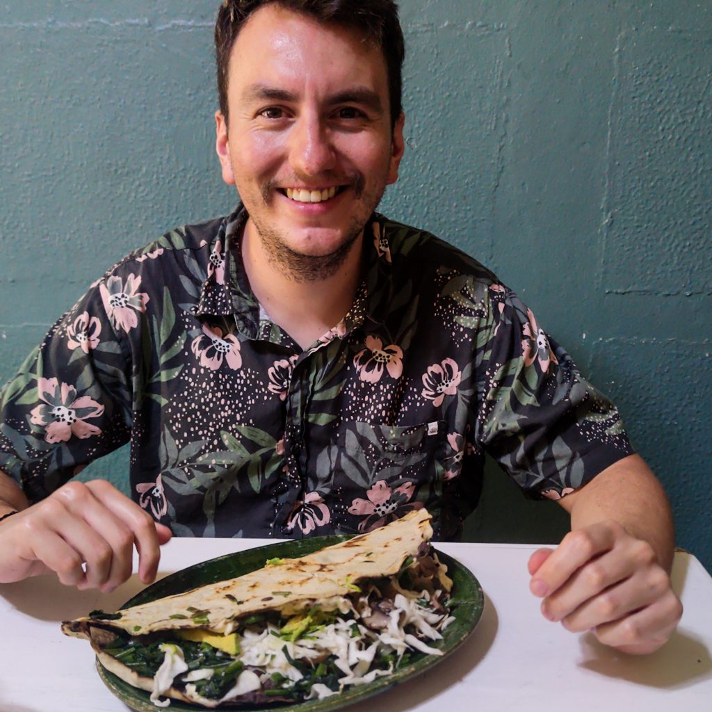 Und ein kleines bisschen wollen wir vielleicht auch noch einen Snack testen, den Dejan uns empfohlen hat: Es gibt Tlayudas. Also einen, der ist auch mehr als ausreichend. Der gefüllte Teigfladen gleicht einer vegetarisch gefüllten Calzone mit Käse, Spinat und Pilzen. Mal eine Abwechslung zu unseren sonstigen Tacos.