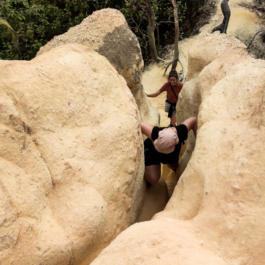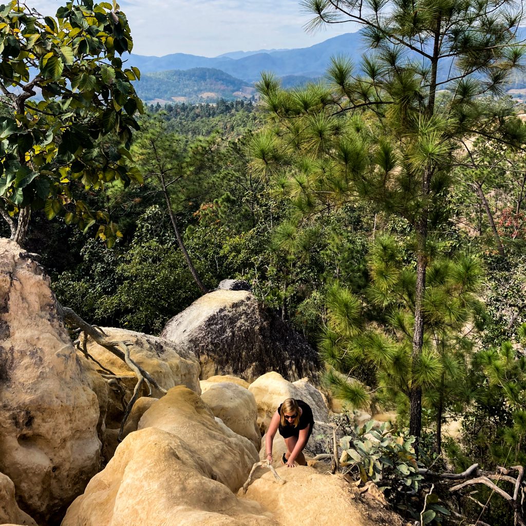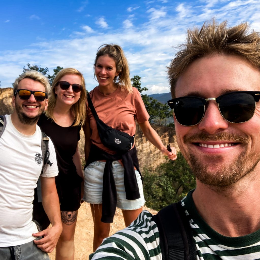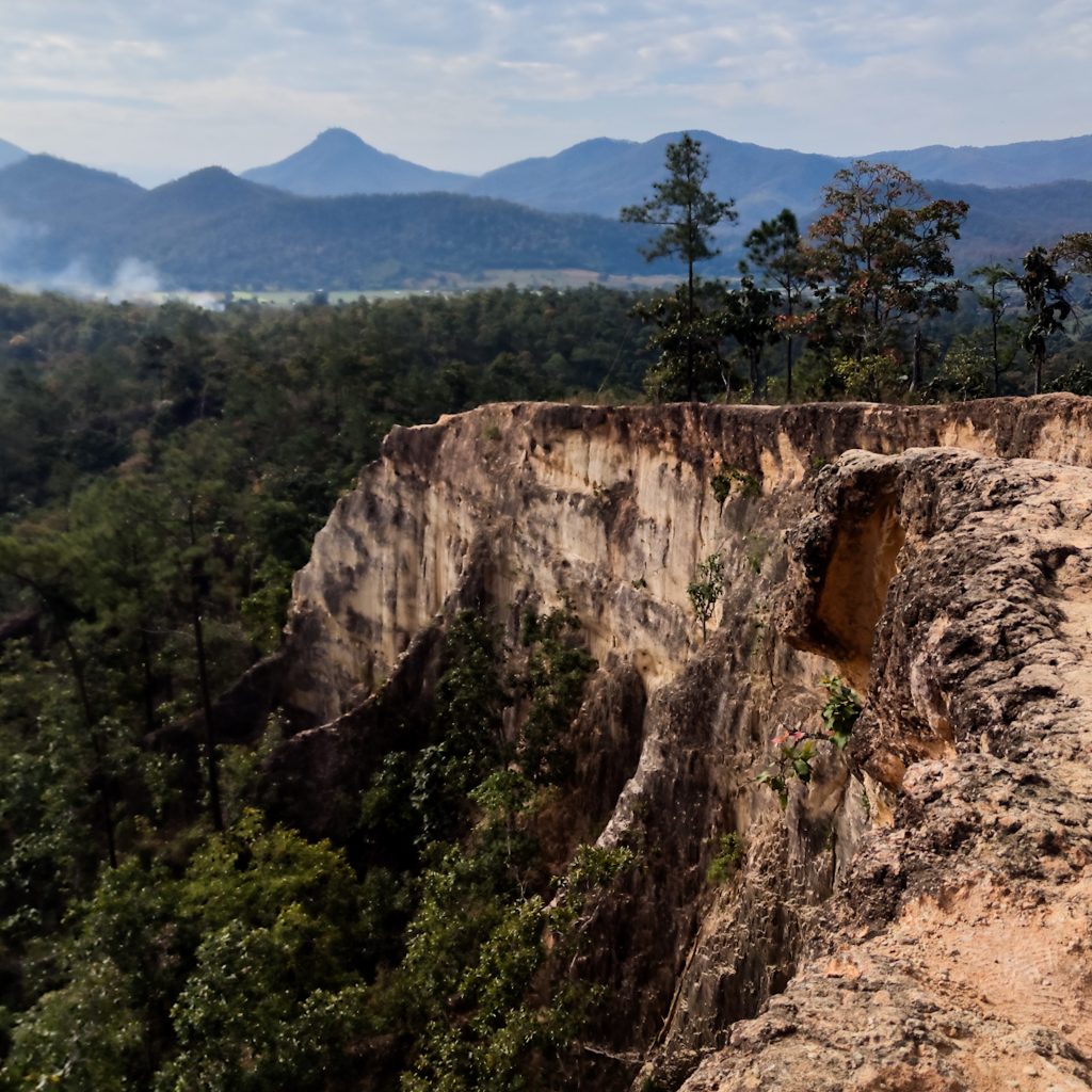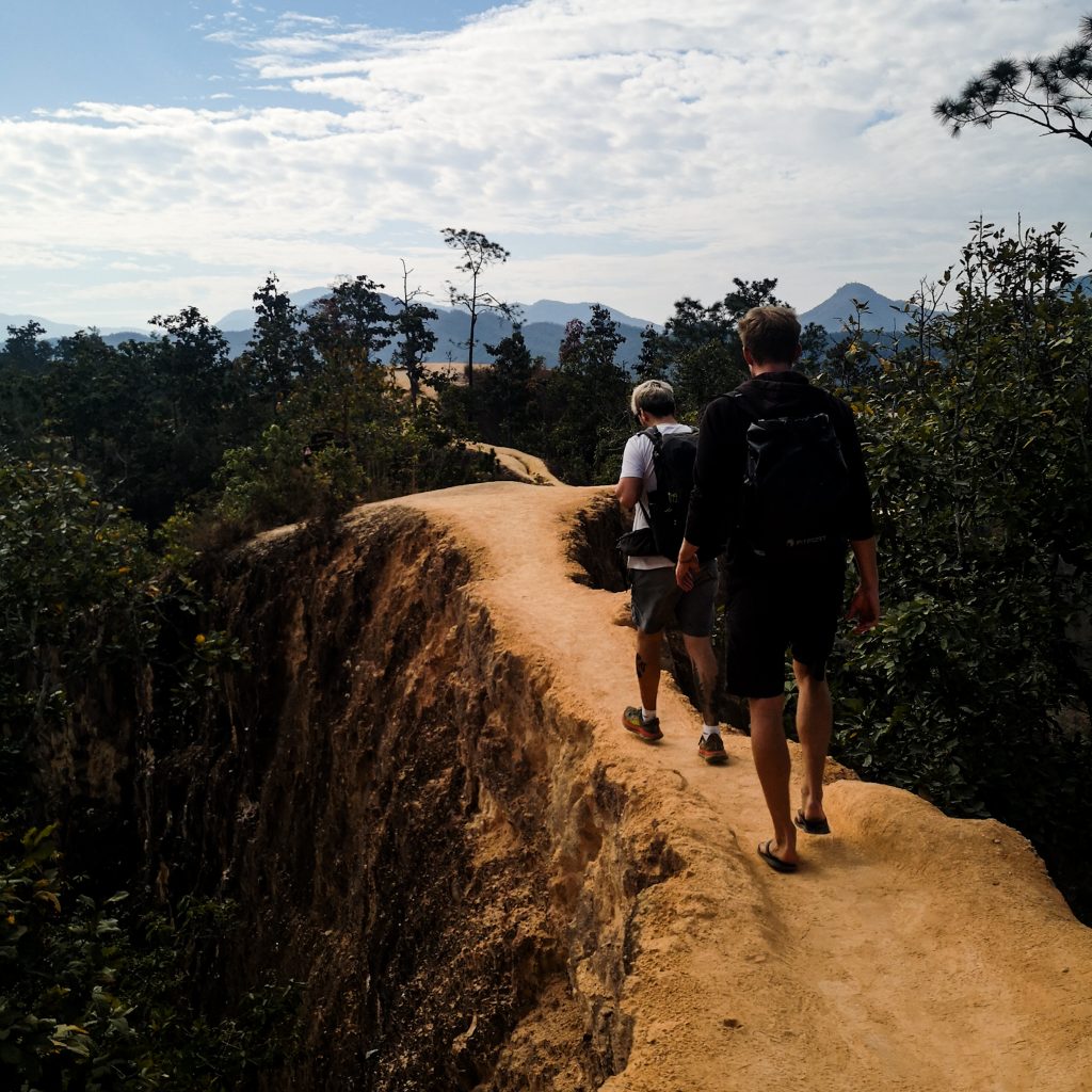 Die Roller stehen am nächsten Morgen wieder parat. Mit einem ganz neuen Reifen lässt es sich doch viel besser fahren. Nach einem ausgiebigen Frühstück starten wir heute zum Pai Canyon. Zum Sonnenuntergang soll es hier brechend voll sein. Als wir ankommen, ist fast nichts los. Auf einem kleinen Canyon spazieren wir entlang „des Abgrund“ und klettern ein bisschen, bis wir zum anderen Ende kommen. Lustig, diese Landschaft und einen kleinen Mini-Canyon haben wir hier gar nicht erwartet. Es ist ganz schön, aber nur ein gaaanz weiter entfernter des Grand Canyon. Wir haben trotzdem Spaß und lassen uns von der trockenen Erde gut einstauben.