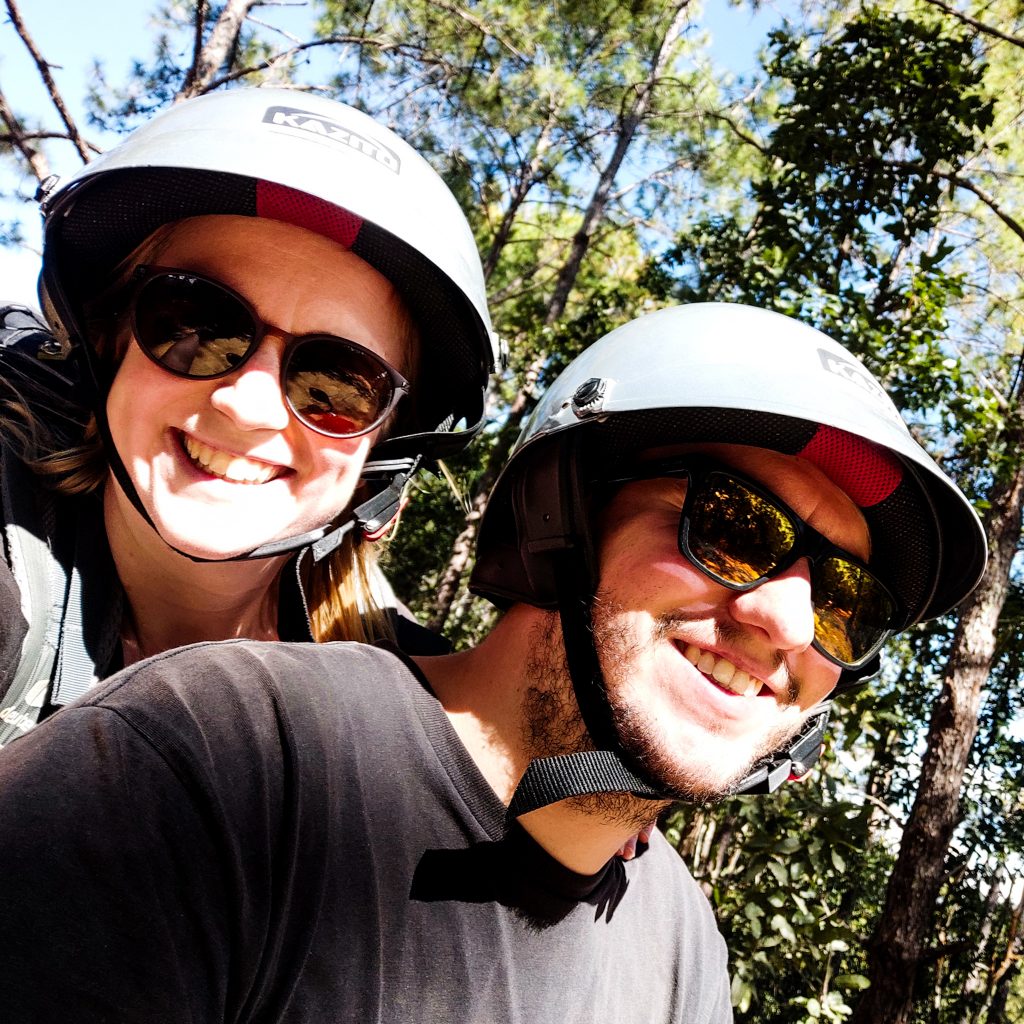 Wir fahren immer weiter und sind zwischendurch eher auf einem Wanderweg als auf einer Straße unterwegs. Nachdem wir viel bergauf fahren, geht es logischer Weise auch irgendwann wieder bergab. Dann sagt Konsti noch zu Caro: „Irgendwie packen die Bremsen nicht mehr so gut.“ Keine 5 Minuten später passiert es dann: Die Bremsen funktionieren gar nicht mehr. Weder vorne noch hinten, Konsti hat beide Hebel bis zum Anschlag durchgezogen. Aber keine Chance. Wir rollern bergab, es ist kurvig und der Straßenbelag weit weg von dem einer asphaltierten Straße. Scheiße. Das Adrenalin steigt von 0 auf 100. Konsti versucht etwas mit den Beinen entgegen zu halten, das bringt nichts, da wir schon zu schnell sind. Hinter der nächsten Kurve rollen wir an den anderen vorbei und schreien noch, dass wir nicht bremsen können. Dann wird es GLÜCKLICHERWEISE etwas flacher und geht sogar wieder etwas bergauf, sodass wir ausrollen können. Als wir langsamer werden, kann Konsti mit den Füßen bremsen und wir kommen irgendwann am Rand zum Stehen. Oh mann! Das hätte wirklich ins Auge gehen können. Die Wege sind zum Teil sehr sehr steil und kurvig, wenn uns dann noch jemand entgegen gekommen wäre. Glück gehabt! Wir warten etwas und merken, dass die Bremsfähigkeit wieder zunimmt. Jetzt ist erstmal Vorsicht geboten. Sicherheitshalber legen wir auf dem Rückweg noch einen extra Stopp ein.