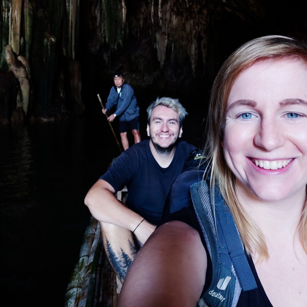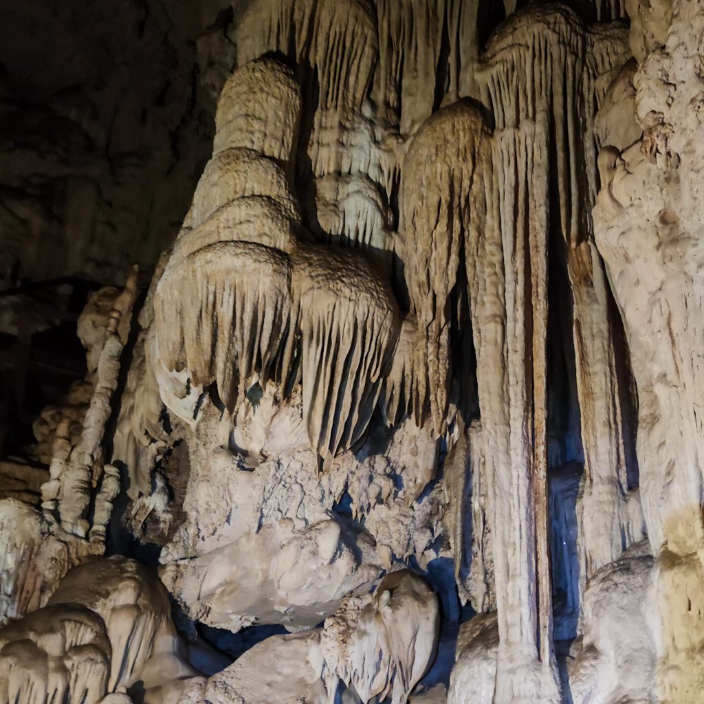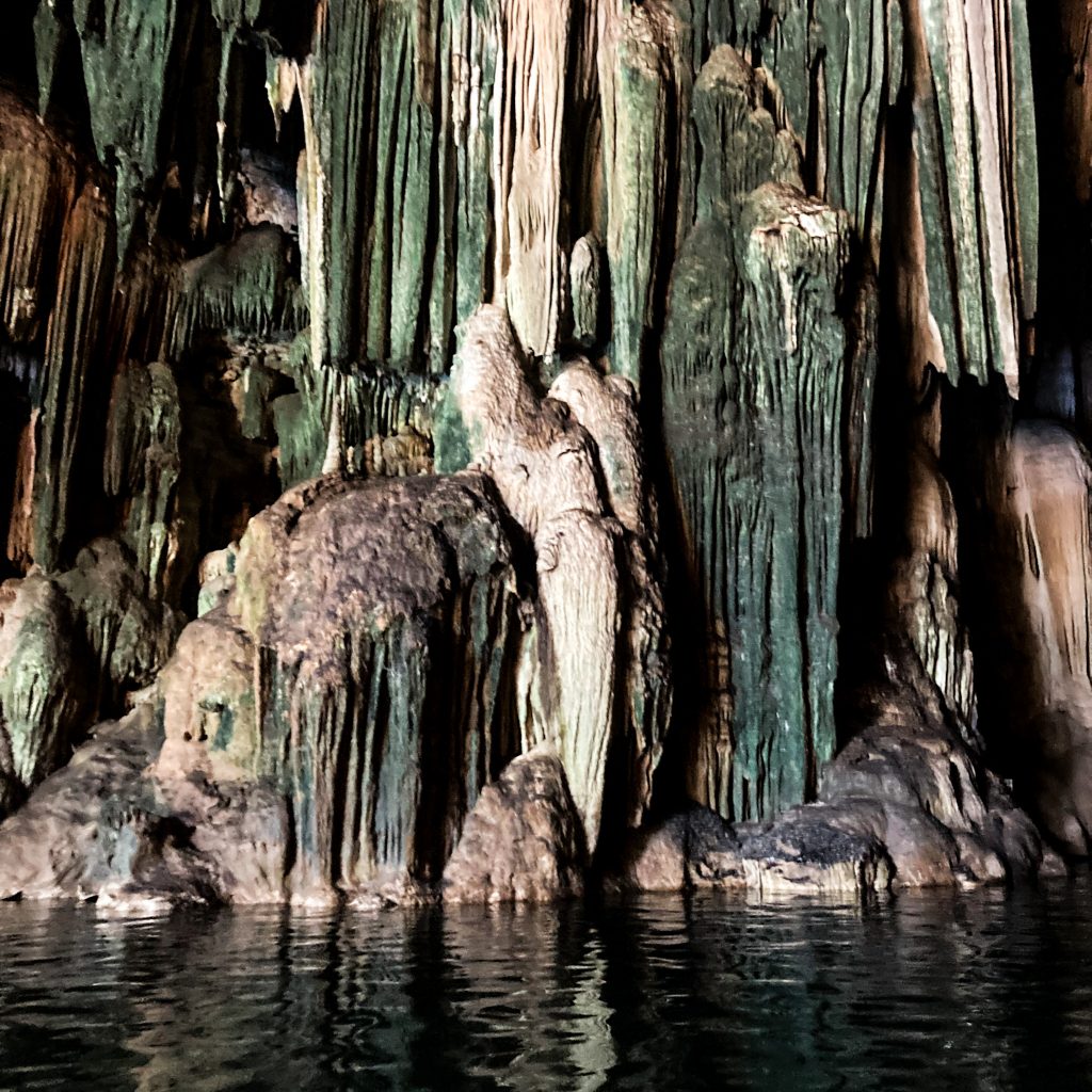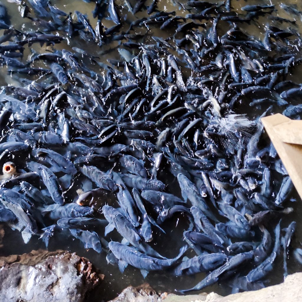 Außerdem gibt es in der Höhle, besonders gegen Ende, zahlreiche Fledermäuse und Mauersegler. Die Challenge dabei: Bloß vorsichtig einen Fuß vor den anderen setzen, damit man keinesfalls in die Bredouille kommt, dass Geländer anfassen zu müssen. Dieses, wie auch der komplette Boden sind vollkommen zugesch*****. Toller Geruch können wir euch sagen. Aber die Tierwelt hatte noch mehr zu bieten. Auf dem Weg zur zweiten Höhle sichten wir, glücklicherweise in sicherer Entfernung eine riesige (ca. Untertassen-große) Spinne. Dann wechseln wir auf eine Art schmales Floß, welches uns ans andere Ende der Höhle bringt. Jetzt wissen wir auch, warum am Eingang große Tüten mit Fischfutter verkauft wurden. Um uns herum sind überall riesige Fische, die hungrig neben uns her schwimmen und ihr Frühstück einfordern. Wahnsinn, wie groß die Fische sind.