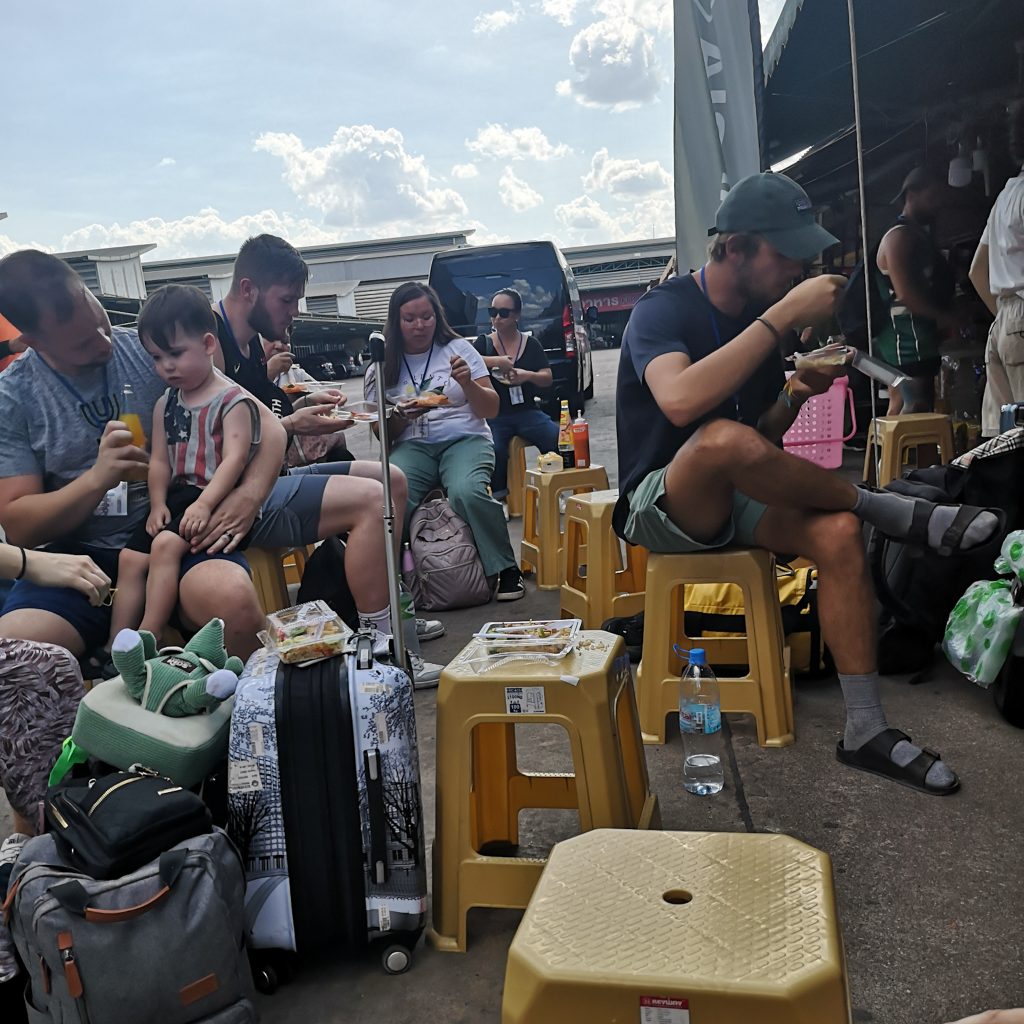Wir sind bereits wach, geduscht und haben unsere sieben Sachen gepackt. Mit dem Tuktuk geht es zum Busbahnhof. Dort erwartet uns mal wieder (ein Hoch auf Kambodscha!) ein super gut organisiertes Busunternehmen. Da wir heute von Kambodscha nach Thailand einreisen, füllen wir ein entsprechendes Einreisedokument aus, checken ein und dürfen sogar einen Mittagssnack vorbestellen, der im Preis enthalten ist. Dann geht die erste Fahrt des Tages auch schon los. Bereits nach drei Stunden sind wir schon kurz vor dem Grenzübertritt. Glücklicherweise nutzen wir die Toilette im Bus, eine wahrlich gute Empfehlung. Denn statt einem schnellen und unkomplizierten Grenzübertritt erwartet uns jetzt vor allem eins: Warten. Warten. Und nochmals warten. Nach einer schnellen Ausreise müssen wir uns in einem Raum mit hunderten anderen Reisenden in Reihen anstellen und warten über zwei Stunden, bis wir endlich dran sind. Selbstverständlich gibt es hier keinerlei Toiletten und auch die Ventilatoren sind bei der Masse an Menschen ein Tropfen auf den heißen Stein.