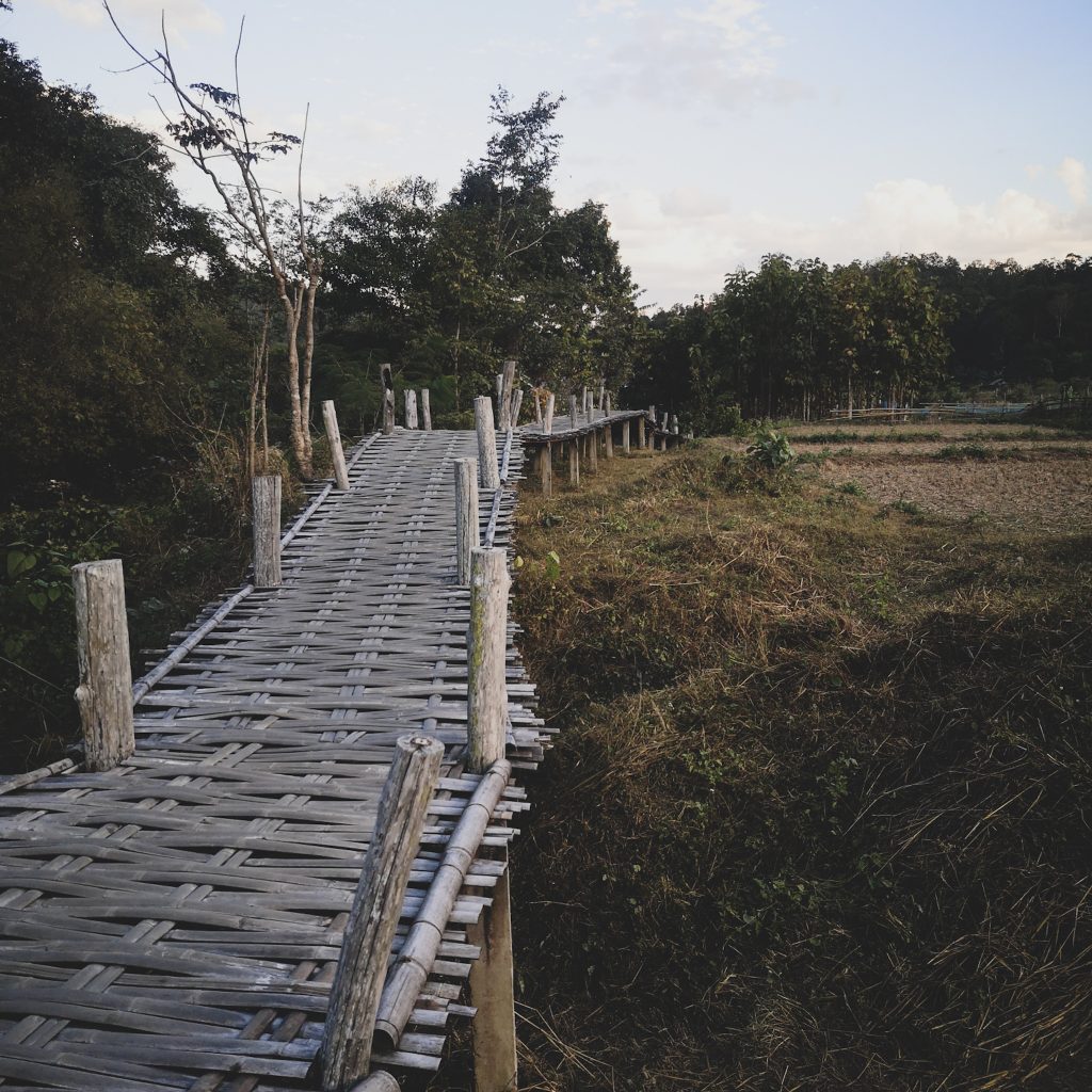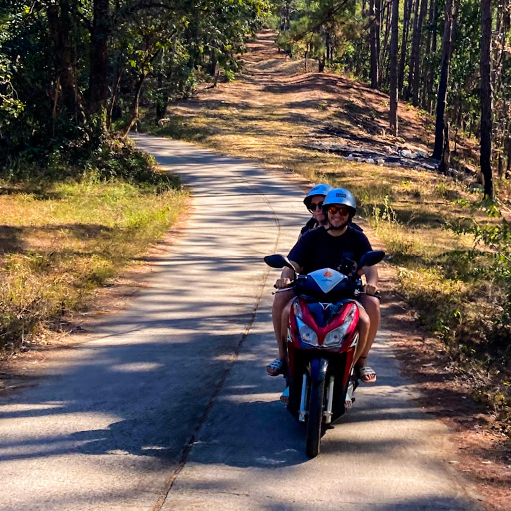 Nach einer kulinarischen Stärkung in einem der kleinen Cafés und dem Aufsuchen einer Tankstelle, beschließen wir heute noch einen kleinen Ausflug zu einer sogenannten Bamboo Bridge zu machen. Kaum sind wir aus der Stadt raus, sind wir quasi alleine auf der Straße. Wie schön es ist, durch die Berge zu fahren. An der Bamboo Bridge angekommen können wir erahnen, dass hier normalerweise mehr los ist. Es gibt wieder ein paar altbekannte Herzform-Fotospots. Die 815 Meter lange Brücke aus Bambus verbindet das Dorf mit einem Tempel und führt in ca. 1,50 m Höhe über Reisfelder.