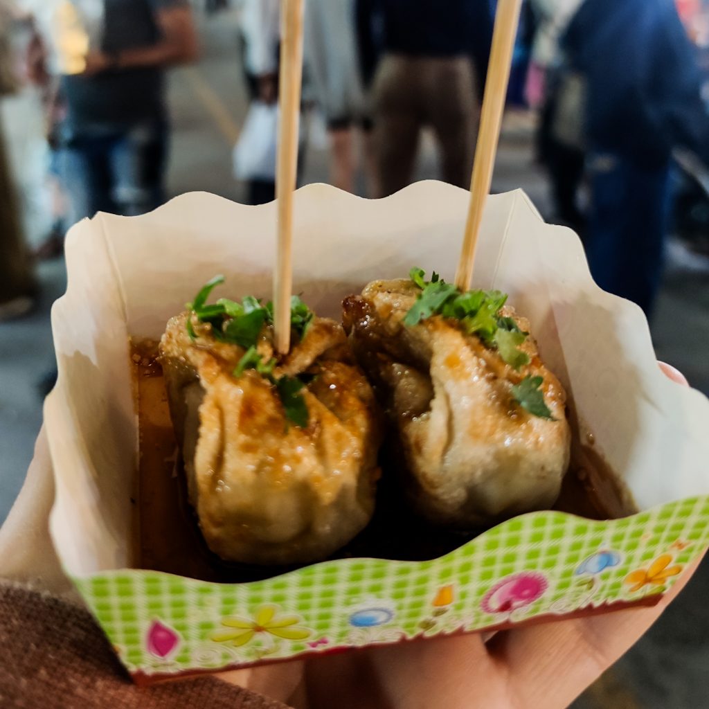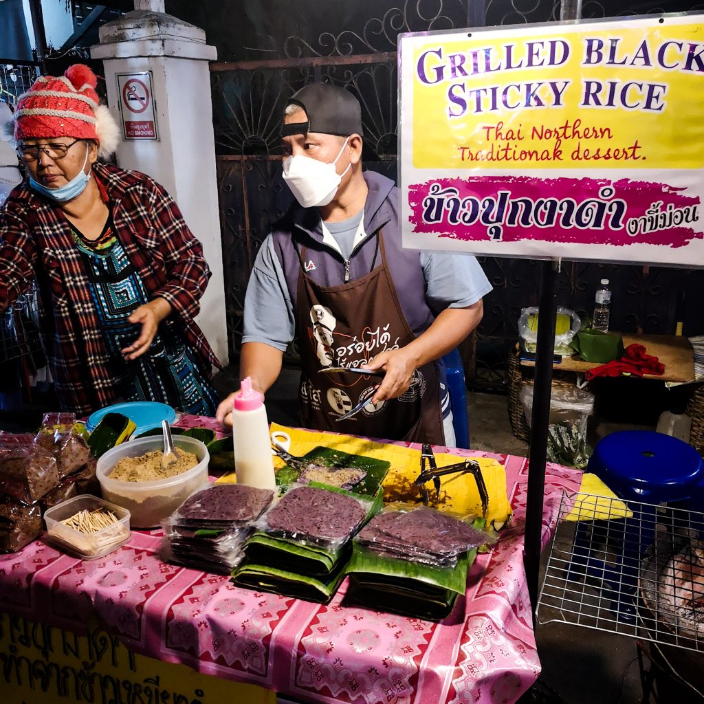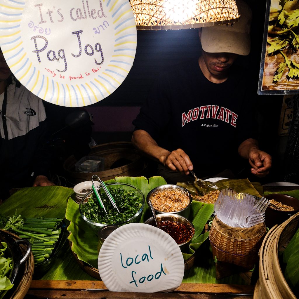 Das beste: Es gibt wahnsinnig viel vegetarische Speisen. Wir futtern uns begeistert durch zahlreiche Stände. Angefangen von veganen Dumplings, die in einer köstlichen Soße baden, Fruchtsmoothies, Frühlingsrollen und einer typischen Speise aus Pai: Pag Jog. Was es ist? Wir haben absolut keine Ahnung und bekommen auch keine Antwort, als wir fragen. Google hilft uns dieses Mal auch nicht weiter. Wir tippen aus eine Mischung aus dunklem Sticky Rice mit Pilzen und ein bisschen Gemüse? Getoppt mit Nüssen, Chili und Koriander? Wenn das nicht mal ein schönes Gericht für Kitchen Impossible wäre. Wenn jemand von euch eine Antwort herausfindet – immer gerne her damit!