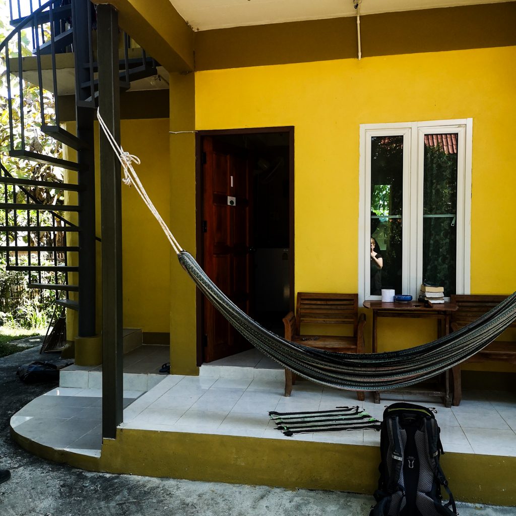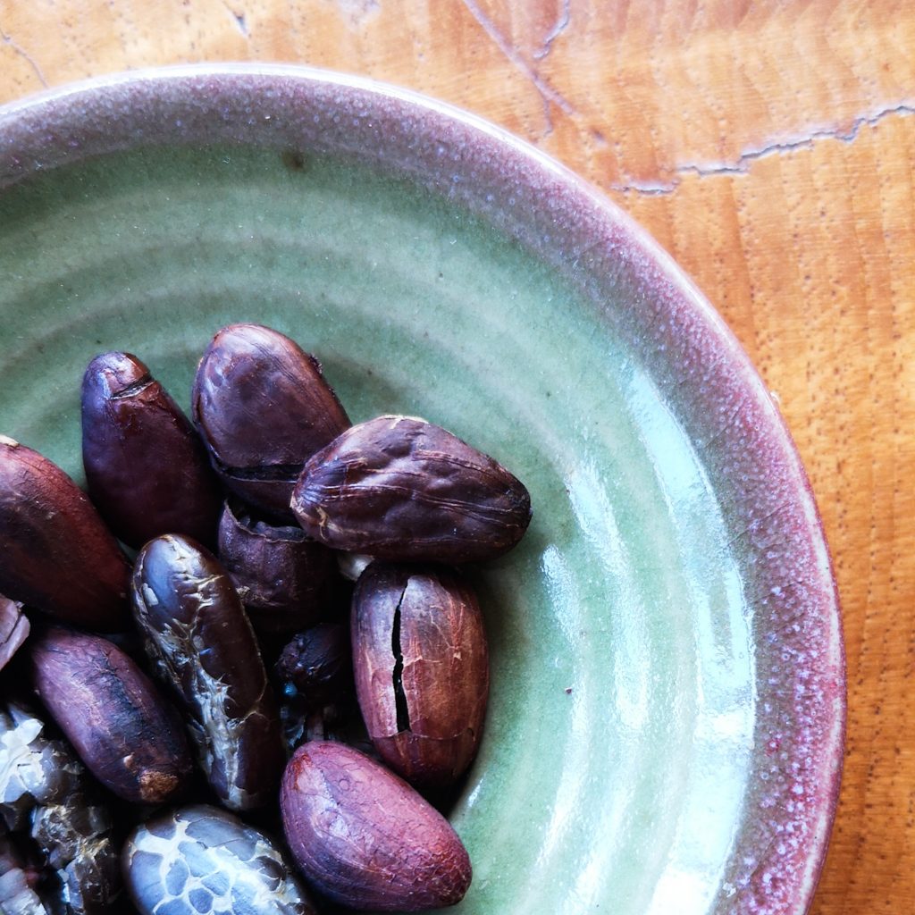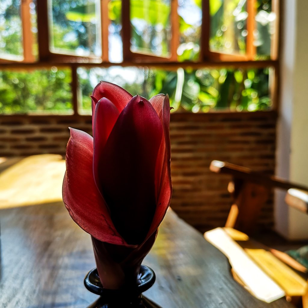 Jetzt muss aber erstmal der Koffein-Haushalt und der Magen aufgefüllt werden. Wir steuern ein kleines Homestay/Café in der Nähe der Höhle an – ein absoluter Glücksgriff. Was für ein schöner Ort. Wir sitzen im lichtdurchfluteten Raum und werden kulinarisch bestens versorgt. Die Besitzerin erklärt uns, dass die meisten Früchte und das Gemüse aus dem eigenen Garten kommt. Sie haben sogar ihre eigenen Kaffee- und Kakaopflanzen und so bekommen wir frisch geröstete Kakaobohnen zum probieren. Kennt ihr die Kakaonibs von DM, die man sich ins Frühstück mischt? Genau so, nur noch viel besser und frischer schmecken die Bohnen.