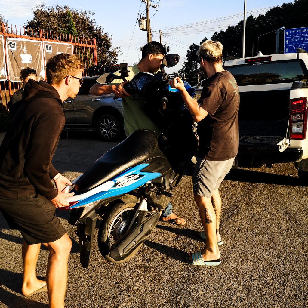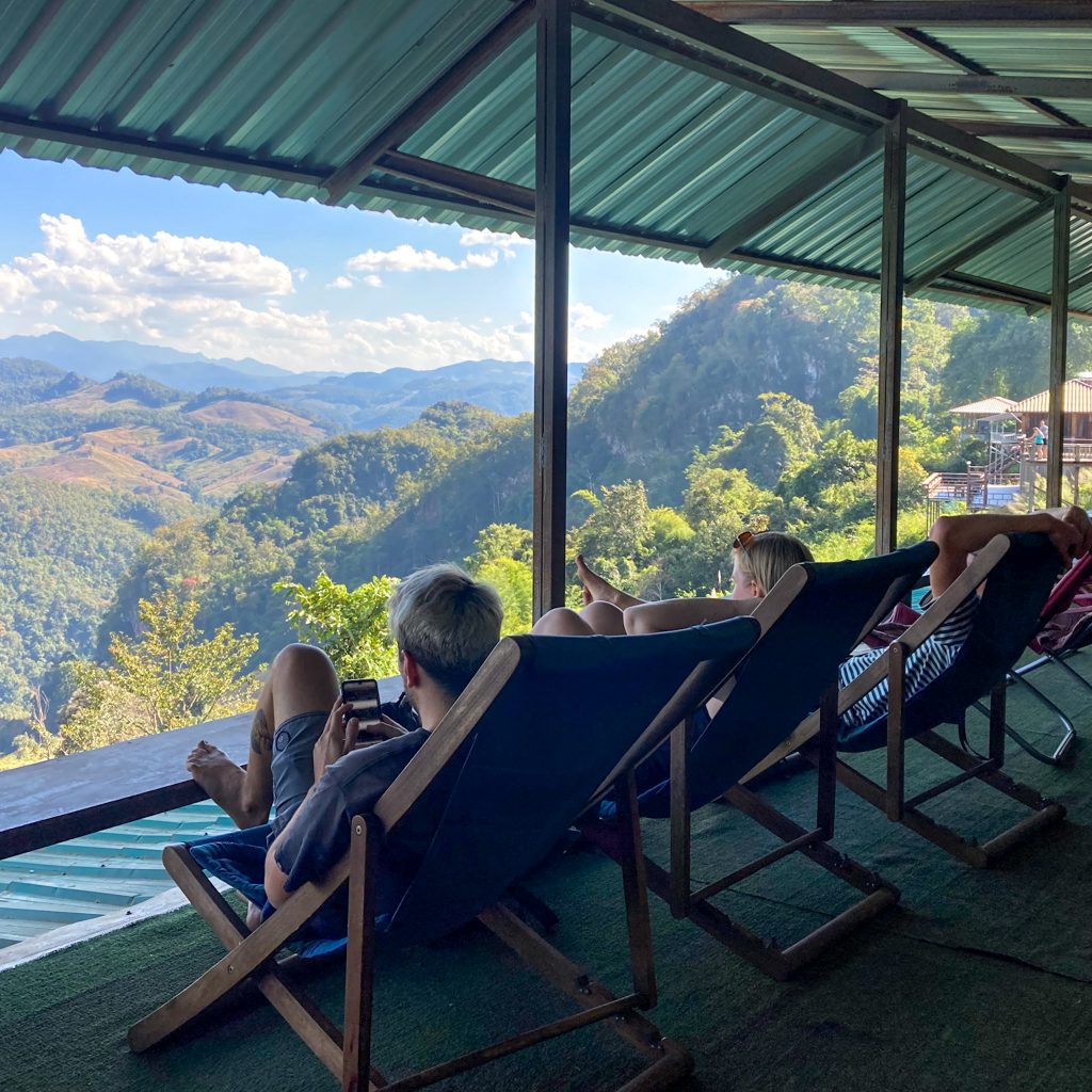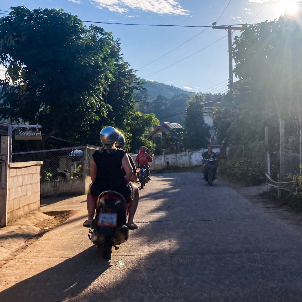geht es für uns am nächsten Tag direkt weiter. Mit dem Minivan geht es direkt weiter nach Pai, einer etwas kleineren Stadt nahe der Grenze zu Myanmar. Wir fahren ca. drei Stunden eine kurvige Straße in die Berge. Als wir ankommen, sehen wir vor allem eines: Touris. Heute lebt die Stadt nämlich in erster Linie vom Tourismus. Die kleine Hippie-Stadt ist bekannt für die entspannte Stimmung und die Umgebung, in der man wandern, heiße Quellen und Wasserfälle besuchen kann. Außerdem gibt es noch einen kleinen Mini-Canyon. In der Stadt selbst gibt es eine Vielzahl an Restaurants und Cafés. Unsere Unterkunft liegt etwas außerhalb des Zentrums. Als wir ankommen, werden wir höchst überschwänglich und lautstark lachend von „Mama“ begrüßt. Ihr Englisch ist zwar nicht das beste, aber dafür ist ihre Gastfreundlichkeit und Herzlichkeit in Kombination mit ihrem lauten Lachen kam zu übertreffen. Wir können bei ihr für die kommenden Tage zwei Roller mieten und starten gegen Nachmittag eine erste Erkundungstour.