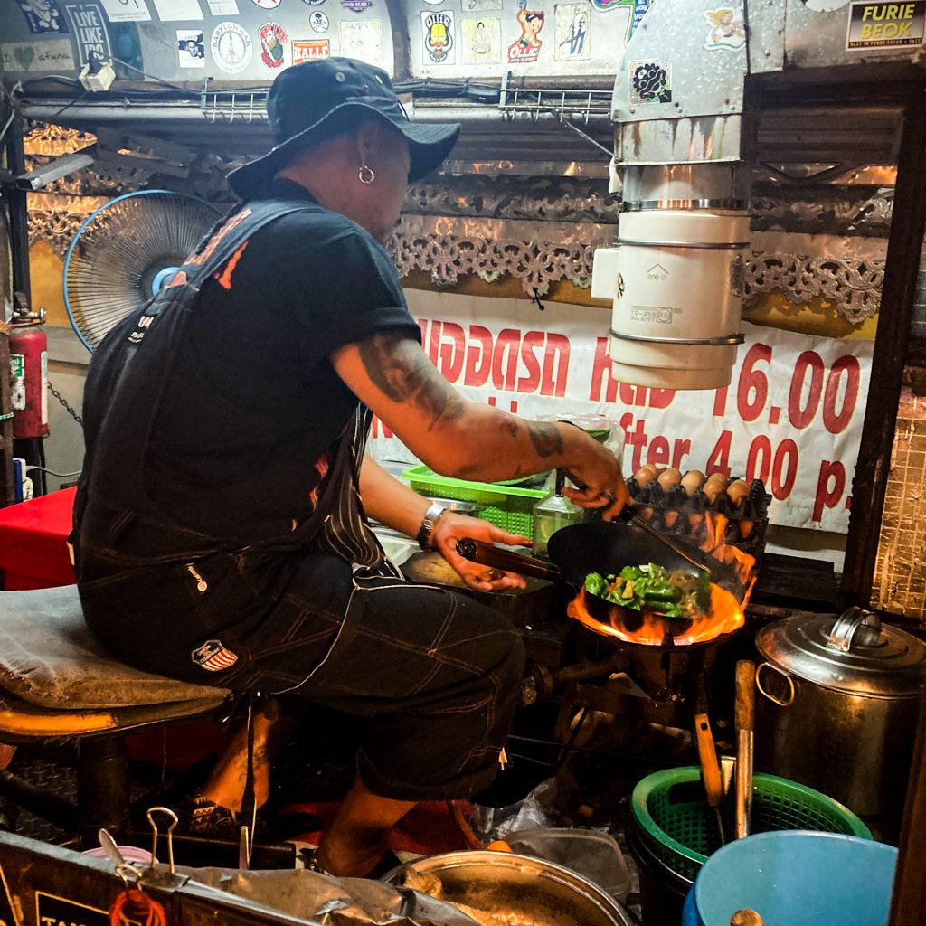 Zuletzt bleiben wir noch an einem kleinen Streetfood Wagen mit mega Musik hängen. Wir entscheiden uns für zwei Currys und nehmen direkt an der „Theke“ Platz. Wahnsinn, wie der coole Dude ganz alleine eine Speise nach der nächsten in einem wahnsinnigen Tempo zubereitet. Jeder Handgriff sitzt. Immer wieder schießen Flammen unter dem Wok in die Höhe und unsere Augen tränen von dem Rauch der angebratenen Currypaste. Hier könnten wir wahrscheinlich ewig sitzen und zuschauen. Der Stand ist gut besucht und wir warten eine ganze Weile auf unser Essen, aber gar kein Problem, hier ist es richtig cool.