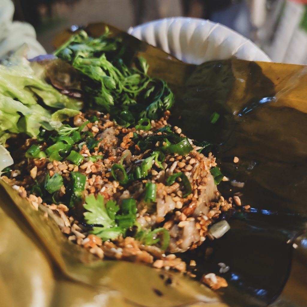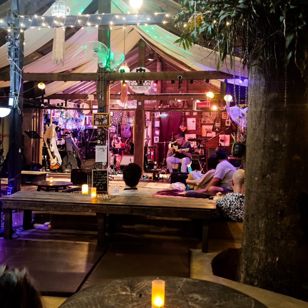 Mittlerweile hat sich eine Routine eingeschlichen: Erstmal gibt es die veganen Dumplings als kleinen Appetizer. Die kleinen mit Kohl gefüllten Teigtaschen schmecken einfach köstlich. Was ebenfalls nicht fehlen darf: ein Fruchtsmoothie. Unser absoluter Favorit ist übrigens Mango-Maracuja (ggf. mit Banane). Die Kombi aus süß und leichter Säure ist genial. An unserem letzten Abend in Pai machen wir nach der Stärkung noch einen Abstecher in die Jazz Bar, die uns von unserer Unterkunft empfohlen wurde. Was für ein entspannter Ort. An kleinen Tischen, auf Sitzkissen oder in Hängematten lauschen die Gäste Livemusik. Als wir ankommen, spielt Norman, ein älterer Herr mit langen grauen Haaren, einem weiten, locker sitzenden Hemd mit seiner Gitarre. Er ist vollkommen in seinem Element und obwohl wir beide keine Ahnung von Musik haben, bewerten wir seine Performance als außergewöhnlich cool. Ein richtig entspannter und cooler Ort, mit der Zeit wird es auch immer voller. Die Musiker:innen wechseln sich ab und nach jedem auftritt geht ein Klingelbeutel herum. Wir gönnen uns ein paar Getränke und treten dann irgendwann den Heimweg an. Zum Abschluss gibt es noch ein Nutella Roti, dann geht es ins Bett.