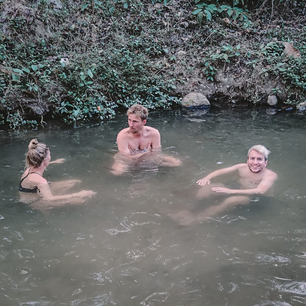 Das Positive an dem Nationalparkbesuch: Im Ticket ist der Eintritt für die heißen Quellen in der Nähe von Pai enthalten. Für Touris ist der Eintrittspreis wesentlich höher als für die Einheimischen. Vielleicht ist das auch der Grund, warum wir außer uns kaum ausländische Touris dort antreffen. Gegen späten Nachmittag machen wir uns also auf den Weg zu den Quellen. Bis zu 39 Grad kann man hier in einer Art kleinen terrassenförmig angelegtem Flusslauf baden gehen. Wir starten im Becken, das mit 33 Grad angeschrieben ist. Kaum haben wir die Natur-Badewanne bestiegen ist schnell klar, das reicht uns. Es ist wirklich sehr warm und bei den sowieso warmen Außentemperaturen brauchen wir es nicht noch heißer. Außer uns sind noch ein paar einheimische Familien dort. Wir planschen etwas und machen uns dann wieder auf den Rückweg. Nach einer erfrischenden Dusche steht heute nur noch eins auf dem Plan: Natürlich der Nachtmarkt.