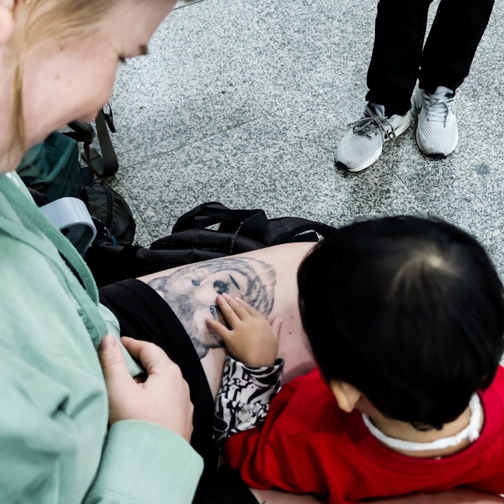 Wir kommen am relativ neuen Fernbahnhof an, der ein bisschen einem Flughafen ähnelt, machen die Bekanntschaft von dicken Ratten auf der Bahnhofstoilette und suchen uns dann einen entspannten Sitzplatz zum Warten, unser nächstes Verkehrsmittel ist nämlich der Nachtzug, der um 22:30 Uhr abfährt. Während wir also auf unser nächstes Gefährt warten, bekommen wir Besuch von einem kleinen Jungen, den wir auf ca. 2 Jahre schätzen (ihr wisst, dass Kinderalter schätzen nicht zu unseren Stärken zählt, wir bitten um Nachsicht). Der kleine Mann hat sichtlich Interesse an Caros Tattoo, was ihn dazu bewegt, den Bären erst ausgiebig zu streicheln und schließlich seine Milchflasche zu geben. Der Bär hat keinen Durst, Caros Bein ist dafür voll Milch. Der Oma ist das natürlich sichtlich unangenehm, wir freuen uns über den Besuch. Ein wirklich süßer kleiner Kerl.