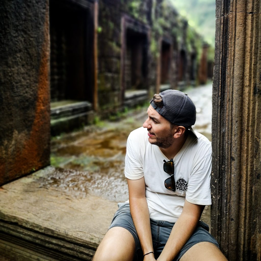 Passend zu unserem Spaziergang fängt es an zu regnen. Aber irgendwie passt der leichte Regen zu diesem Ort und lässt die Pflanzen in unserer Umgebung in ein sattes Grün tauchen. Wir müssen hier und da ein paar paar chinesischen Tourist:innen ausweichen, die vollen Einsatz beim Fotoshooting zeigen. Stylisch aufgebrezelt setzen sie sich in verschiedensten Posen im Szene. Für ein gutes Foto kann man sich ja auch mal auf dem Boden räkeln. Oder wie seht ihr das? Auch die Regenschirme der Reisenden dienen als farbenfrohes Accessoires und werden gekonnt in Szene gesetzt. Aaaber: Je länger wir bleiben und je länger es regnet, desto weniger Leute teilen sich diesen schönen Ort mit uns. Wir stiefeln mal wieder mit Adiletten drauf los: Auf der einen Seite praktisch beim Regen, für die schiefen und ungleichen Stufen der Ruine aber eine wackelige Angelegenheit. Aber für uns fachkundige und überzeugte Adilettenträger:innen ist das selbstverständlich kein Problem. Man könnte fast meinen, dass die Adiletten sich mittlerweile wie eine zweite Haut um unsere Füße schmiegen. Unter Umständen entwickelt sich unsere Hornhaut auch entsprechend. Munkelt man. Naja, die Aussicht vom oben ist sehr schön, wir machen noch ein paar Fotos und begeben uns dann zurück zum Roller. Unsere Mägen machen sich deutlich bemerkbar.